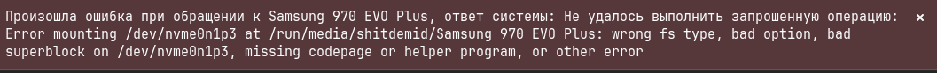 При попытке открыть диск стала такая вот ошибка вылезать, хотя вот ток недавно он открывался без выебонов. На всякий бутнулся в винду, на нем она стоит, всё норм работает. С чего вдруг он решил отвалиться? После ребута ничего не изменилось, всё также выбисывает бибу при попытке проникнуть.