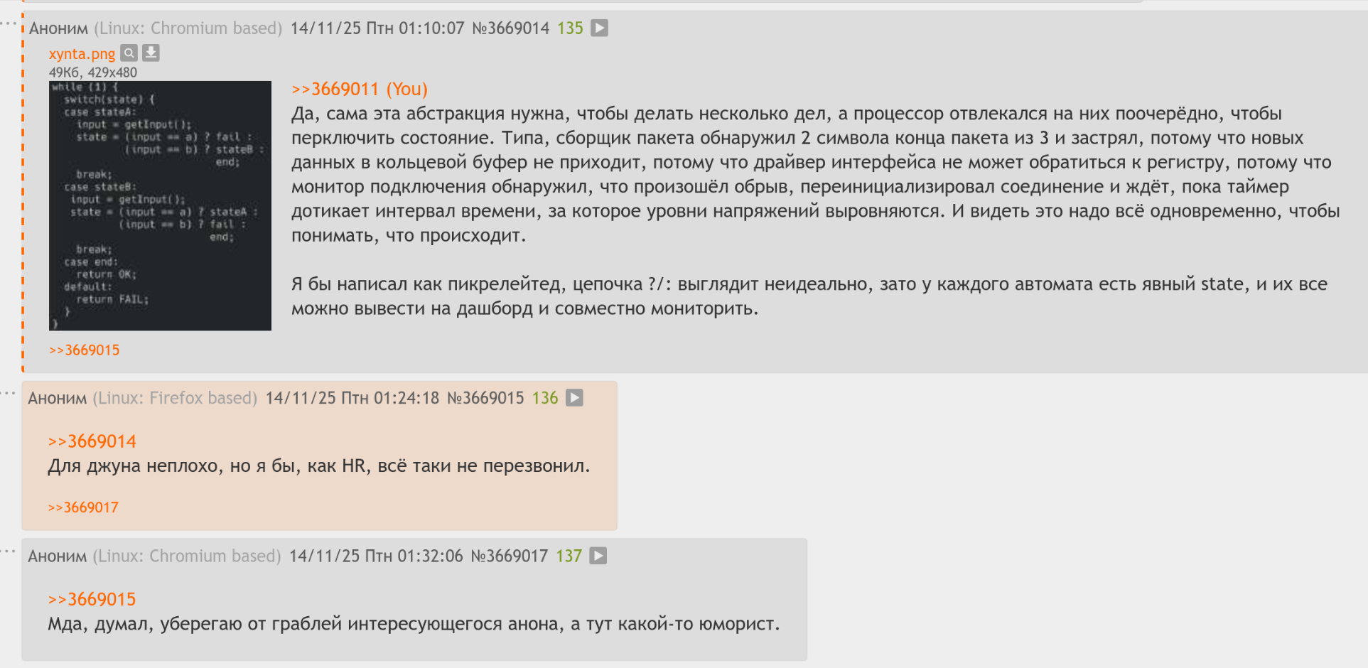 >>3669011 Да, сама эта абстракция нужна, чтобы делать несколько дел, а процессор отвлекался на них поочерёдно, чтобы перключить состояние. Типа, сборщик пакета обнаружил 2 символа конца пакета из 3 и застрял, потому что новых данных в кольцевой буфер не приходит, потому что драйвер интерфейса не может обратиться к регистру, потому что монитор подключения обнаружил, что произошёл обрыв, переинициализировал соединение и ждёт, пока таймер дотикает интервал времени, за которое уровни напряжений выровняются. И видеть это надо всё одновременно, чтобы понимать, что происходит.