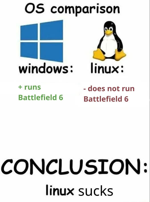 >>3669906 >Как говорить про игры на линуксе и протон в частности - так это вин тысячелетия Да. >линуксгейминг на высоте, не хуже винды (а часто даже лучше по производительности), кроме 2.5 тайтлов с анальными кернел-античитами, которые всё равно не нужны. Нет. Проблема с драйверами Нвидиа не решена. Ну и, если честно, я в BF6 заглянул бы. Впервые с BF BC2. (3 част не зашла, а 4 - помойка). И, блин, "нинужно" это оправдание, при чём плохое. В том числе и в плане самоубеждения. У тебя вместо стремления к лучшему оправдания. Не работает - нинужно, при чём там даже куча оправданий будет, подтверждающих эту точку зрения. А если бы работало? Т.е. это правда не нужно, или ты себя в этом убедил? А если ты попробовал? Нет у тебя ОЛЕГ моника - значит ХДР нинужен. А вот ты захотел, купил, и что с этим "нинужно" теперь делать? "Нинужно" это отрицание проблемы, а не её решение.