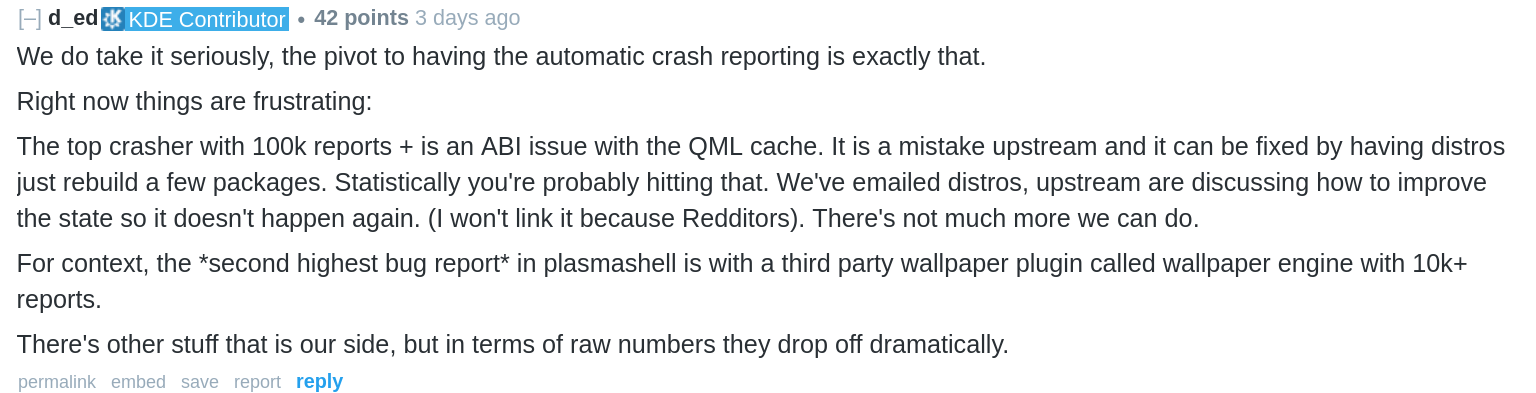 >>3676034 >пакет тестится до состояния "не падает/ не роняет" отправляется тебе. Если ты встречаешь баг тебе вылезет форма для отправки но один фиг 90% жмут скип, игнор и пофиг. Если нет - возможен профит для всех (в том числе компания) Проблема в том что я не хочу тестировать пакеты только лишь потому что корпам так удобно денег экономить. Я для этого и пытаюсь от винды отказаться. Раньше помогало ставить ltsb/c но сейчас майки окончательно охуели. Для этого есть тестовые/анстейбл ветки или арч в сочетании с отделом тестирования. Постоянно отписывать багрепорты, чтобы кто то там через года доделал свой курсач, для человека работающего проблематично - работа не будет выполнена. А уж когда у твоего компа для телека внезапно начинается пшшшшшшшшшаудио-момент то с такими дистрами вера в этот ваш попенсоурс увядает. Если тебе так сильно хочется помочь сообществу то можешь поставить сыроватый arch/fedora и писать багрепорты, вас таких идейных много, но не надо говорить и советовать всем желающим коляску которая имеет свойство наворачиваться с обрыва или, в случае с федорой, сковывать телодвижения в процессе использования т.к. лучше бтрфса нет ничего зачем тебе другая фс. Лучше научись языку и фикси баги самостоятельно - их в любой репе вагон и маленькая тележка.