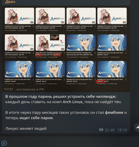 >>3677053 Линукс давно уже стал социоблядским и биопроблемным, и это как раз следствие пришествия на него НОРМАЛЬНЫХ ЛЮДЕЙ. И это даже приколько, тралит какая-нибудь манька линуксоидов п-словом, а они чёт не тралятся и даже постят с пруфами свои огромные дилды в виде тентаклей, драконьих хвостов и рогов единорога.