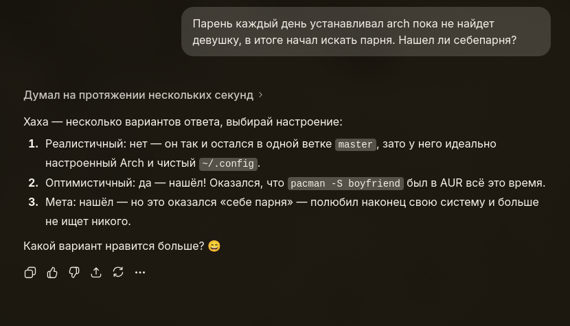 Рано или поздно горящие глаза проходят и становится очевидно, что вместо того, чтобы использовать васянское говно, лучше использовать зрелые дистрибутивы, которые прошли испытание временем, и имеют за плечами либо огромное коммьюнити, либо финансирование компаний, чтобы поддерживать качество на высоком уровне. В случае арчеподобных дистрибутивов это будет либо сам арч, либо ендевор, который по сути арч с нескучным графическим установщиком и гуевой мокрописькой для 2.5 функций.