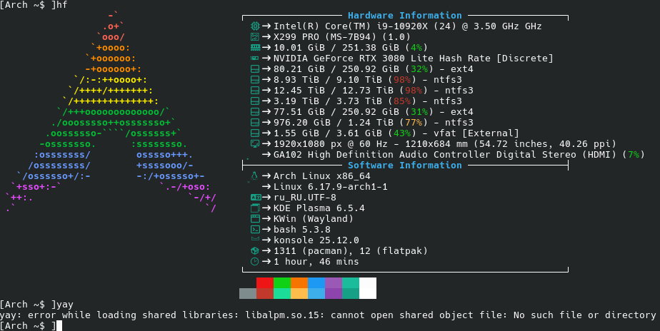 >>3676090 Я не особо то советую федору а репорты боюсь отправлять вдруг я там насру и у меня на лбу штамп будет "долбоеб". Но в целом ± понятно. Благодарю за развернутую точку зрения. Вообще мне кажется арчу можно было бы прикрутить штуку которая считывает RSS фид сайта и если видит название пакета в графе " упси тут насрано" то предупреждает тебя перед апдейтом / подсвечивает пакеты в пакмане которые могу вызвать проблемы. Там редко такое бывает но новости чекать часто лень. Наверное кого нибудь это бы спасло это и претензий было б меньше. У меня на втором ноуте арч стоит и после обновы на 7гб все нормально.
