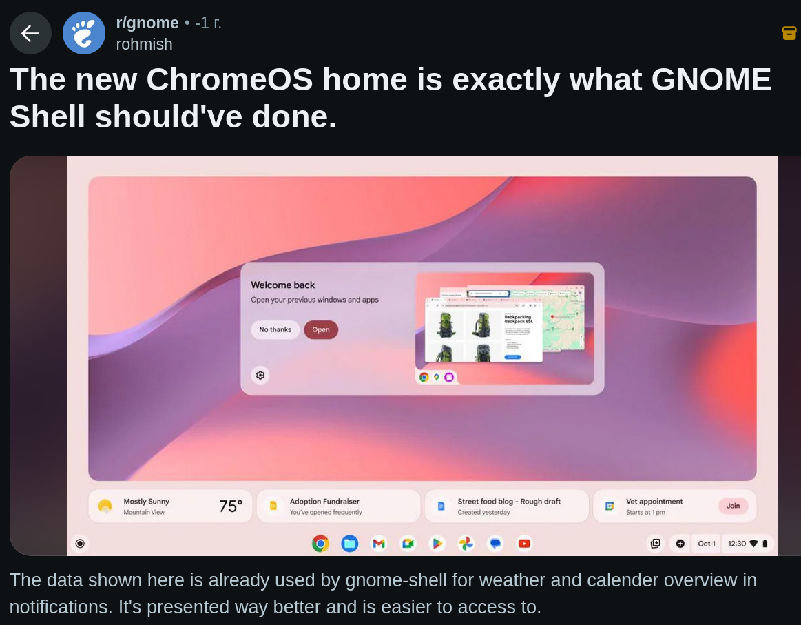 >>3686062 >А сами разработчики гнома линуксом не пользуются. Линуксами они пользуются, они не пользуются стационарными пекарнями и давно забыли что это. Верят что экранов ниже 200 точек на дюйм уже в природе не осталось и тому подобное.