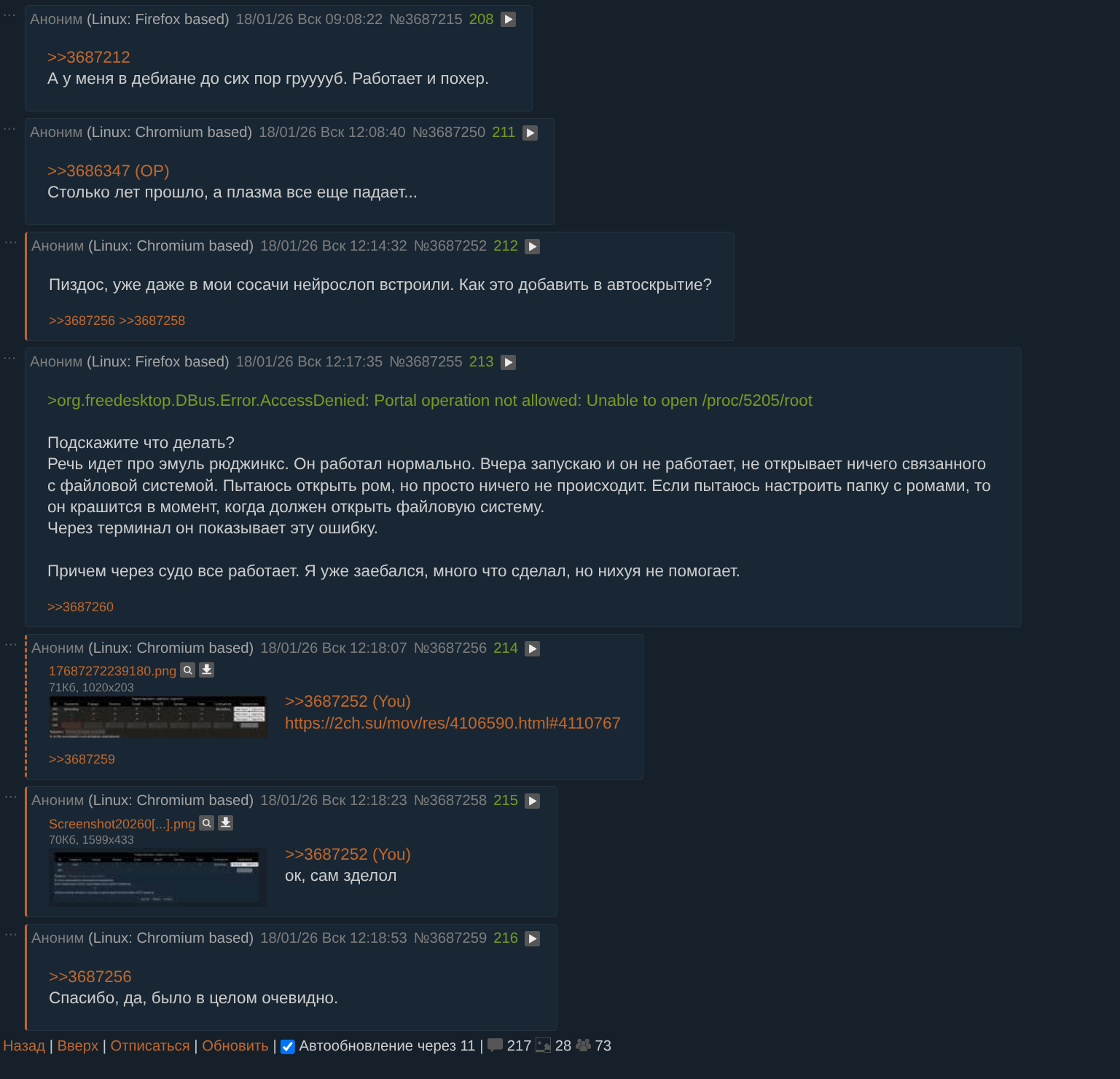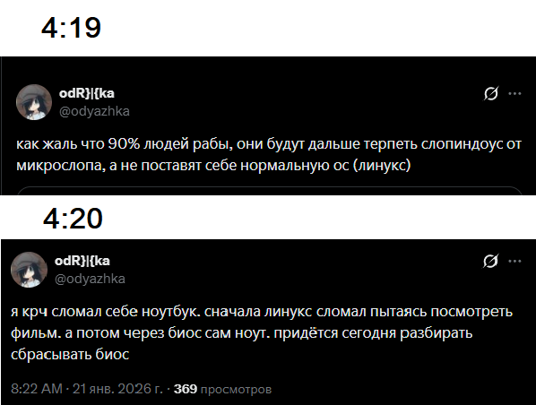 Уже раз 10 пытался уйти от винды на основном ПК и каждый раз провал, максимум неделю выдерживаю и понимаю что пользователь нереально, единственный положительный опыт что я помню это NixOS, но потом я уехал в отпуск, затем навалилось работы и вот я уже не помню как мне что-то установить и где что настроить. Я бы его на мини пк бы поставил, если бы не страх перед часами конфигурирования, еще раз я такого не выдержу. Сейчас вот опять накатило (наверное это депрессия) поставить линукс, но опять же kde как будто глючит после настроенной винды, а gnome вылетает нон-стоп, а другие оболочки типа niri слишком сырые, хоть и прикольные.