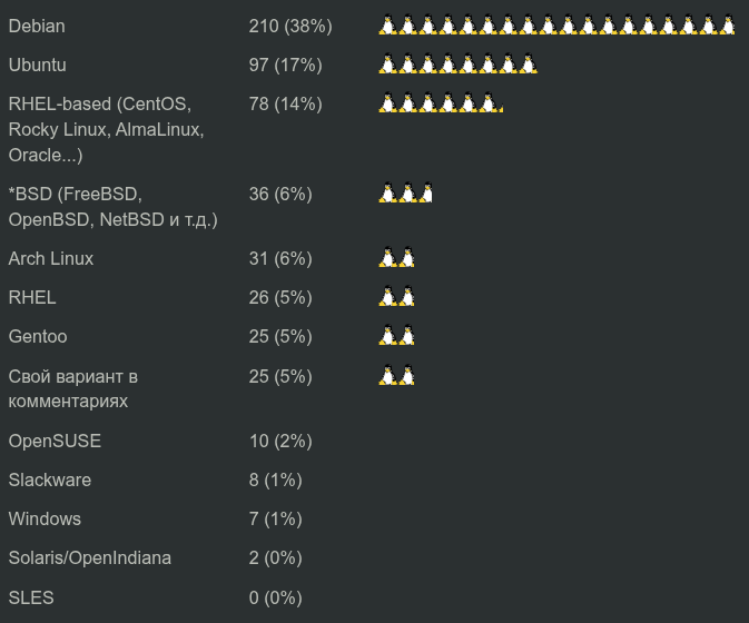 >>3686612 Итак вопрос. Учитывает ли этот график WSL? Потому что там умолчанию убунта. Учитывает ли докер контейнеры? Потому что куча не самых простых это дебиан. Спрашиваю потому что устал от хреновых графиков которые ничего не отражают, своего рода нейрослоп, только тот хотя бы забавляет, иногда.