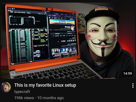 >>3688308 Мануалы по анонимности в интернете, а потом уже, когда та самая анонимность больше стала нахуй не нужна, все равно остался по инерции на линуксе сидеть. Хотя винда и есть до сих пор в дуалбуте, но загружаюсь в нее реже чем раз в месяц, для перепрошивок и всякого телефонного софта, в основном.