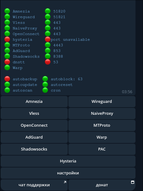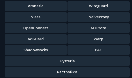VLESS (Reality OR Websocket) NaiveProxy OpenConnect Wireguard Amnezia AdguardHome MTProto PAC automatic ssl и ты всем этим управляешь с телеграм бота который те дал BOT_KEY полученный через @BotFather, в боте тыкаешь кнопочки и там добавляешь клиентов, настраиваешь и получаешь линки, там же настраиваешь пасс для доступа к своим обхлдам. Так же можно настроить резалку рекламы.
