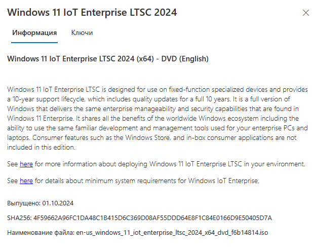 Хэши Windows 11 LTSC IoT ты без подписки в много тыщ долларов никак не увидишь. Только для демо-версии (которая называется Evaluation), которая работает 90 дней (у неё другие хеши, отличающиеся от нормально Windows 11 LTSC IoT).