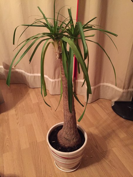 >>527 (OP) это Бокарнея (Beaucarnea Recurvata). гайд по уходу содрал для тебя с какого-то сайта: Температура: Оптимальны прохладные условия, летом не выше 22-24°C, температуру выше 26°C при хорошем проветривании. Зимой период покоя при температуре около 10-12°C, но не ниже +7°C. Если достаточно света, то бокарнея нормально живет зиму и в теплой комнате. Освещение: Бокарнея предпочитает полноценное солнечное освещение, летом в самые жаркие часы - легкое притенение (домашние растения менее приспособлены к яркому солнцу в отличие от растущих в природе собратьев). Полив: Умеренный весной и летом, зимой полив ограниченный при прохладном содержании, но напрямую частота полива зависит от конкретной температуры. Учитываете, что бокарнея засухоустойчива и перелива не терпит. Т. е. после полива нужно дождаться, когда просохнет верхний слой земли и подождать еще несколько дней, прежде, чем вновь поливать. Удобрение: С апреля по август через каждые 2 недели бокарнею подкармливают жидким удобрением для комнатных растений в дозировке в два раза меньше рекомендованной или удобрением для кактусов и суккулентов. Влажность воздуха: Бокарнея хорошо отзывается на опрыскивание, которое можно проводить раз в неделю. Пересадка: Бокарнеи в молодом возрасте (до трех лет) пересаживают ежегодно, взрослые через 2 года. Корни у растения довольно хрупкие, поэтому нужно стараться не повредить их во время пересадки. После пересадки бокарнею не поливают дня два. Хороший дренаж обязателен.