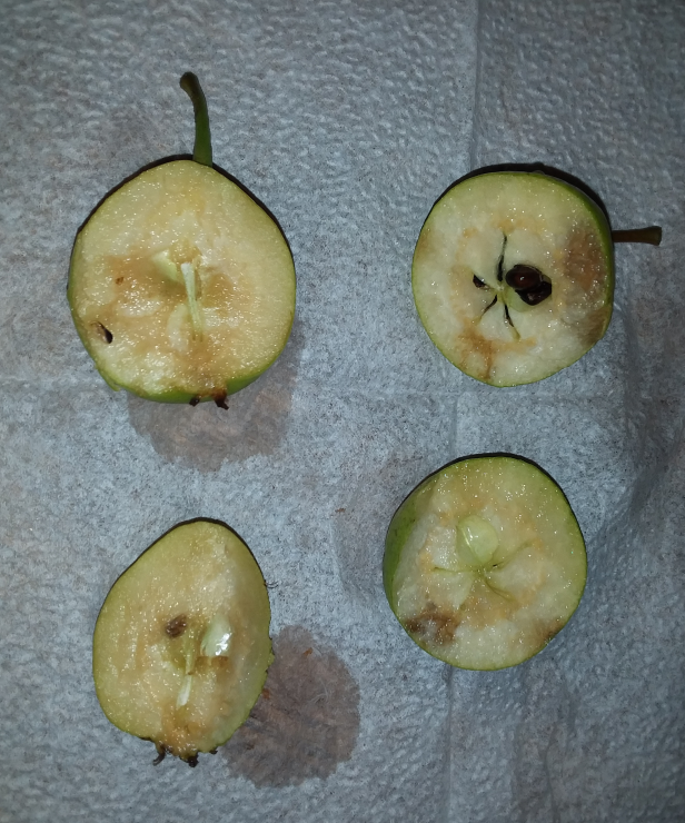 Помогите опознать, что это. В общем, шёл сегодня мимо кладбища в районе Старой деревни, а там прямо возле забора плодов навалено... Плоды потоптанные уже, и запах приятный, как будто на грушу похоже немного, но не грушей пахнет, а даже не знаю чем. Яблочки такие небольшие, но вроде и не яблочки. Не дичка точно. Листья не яблоневые, у яблони они как бы светлее и более матовые, а эти прям тёмно-зелёные, блестящие. Дерево огромное, и всё усыпано этими мелкими плодами. Раза в два-три меньше, чем обычные яблоки. Ну я сорвал пару штук. Фото прилагаются. Попробовал даже на вкус. Какие-то они вяжущие. Внутри ничего необычного, как будто бы пять долей, как в обычном яблоке. Вообще, похоже, что это именно семейство розовых, хотя у каждого плода шесть лепестков на нижней пупочке, а не пять, как по логике вещей должно было бы быть. Но по всем внешним признакам это почти обыкновенные яблоки, только мелкие, и место прикрепления к ножке не вогнуто, а как бы даже чуть выпуклое, как у груши, только не сильно выпуклое, в отличие от груши. Может быть это какой-то хитрый грушеяблоневый гибрид? Но чё он такой невкусный? И вообще, можно ли это есть?