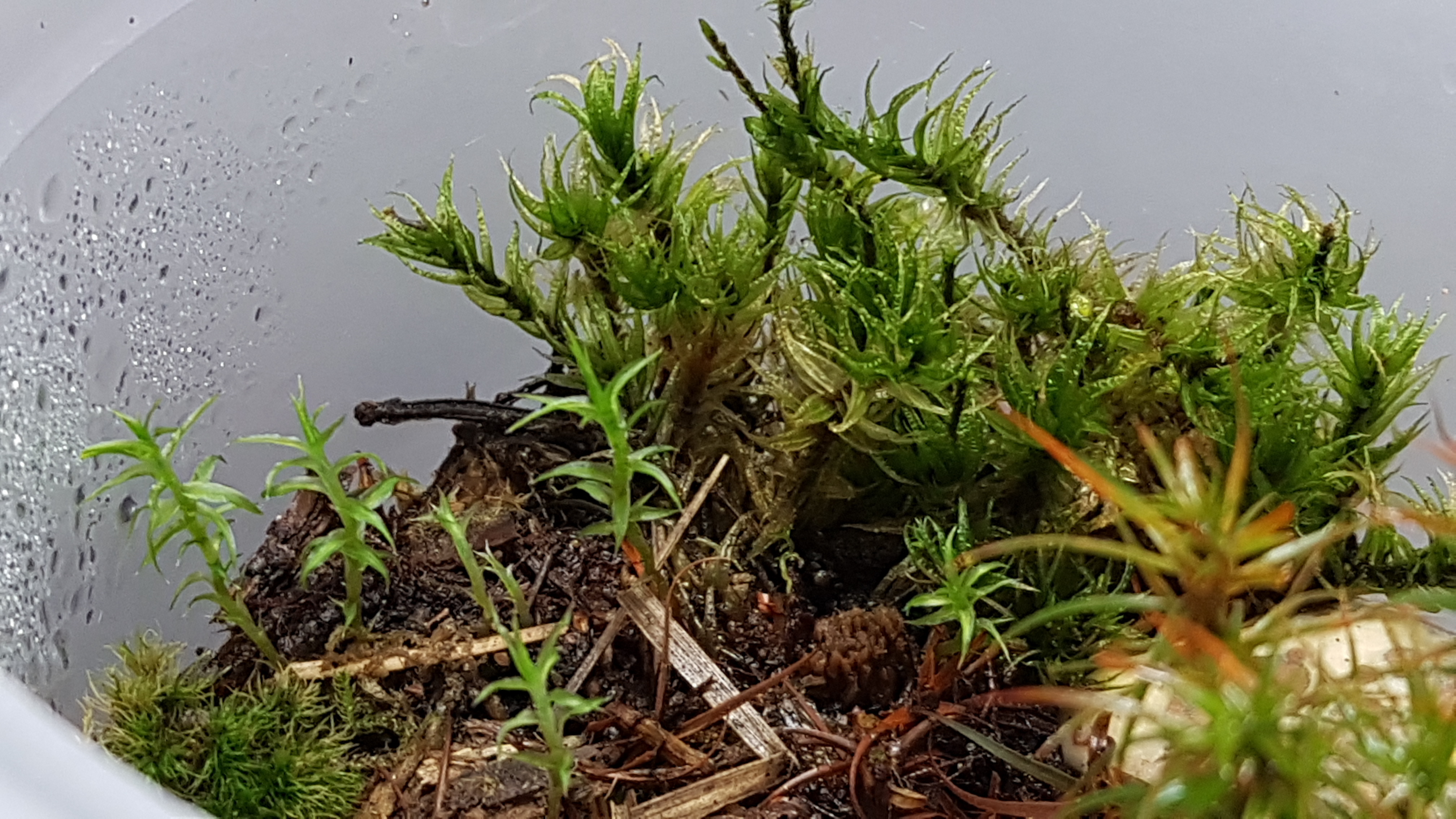 Ращу дома лесной мох (не спрашивайте). У меня есть пучок кукушкиного льна (пик1) и дикранума метелковидного (пик2). Опытным путем выяснилось, что лучше всего (из возможного в моем случае) они себя чувствуют в большом закрытом прозрачном пластиковом стакане (дренаж - среднекислый грунт - мертвый покров из места обитания), по мере необходимости пшикаю их фильтрованной водой из пульверизатора. Оба пучка прижились, дикранум спустя пару месяцев начал размножаться, а у кукушкиного льна листья внизу очень сильно потемнели, и наверху пожухли кончики, хотя у двух маленьких растений на кончиках появились свежие молодые побеги. Дикранум тоже чуть-чуть потерял в цвете, но не сильно. Собственно, почему могли потемнеть листья? Могу ли я как-то это исправить или только избежать в будущем?