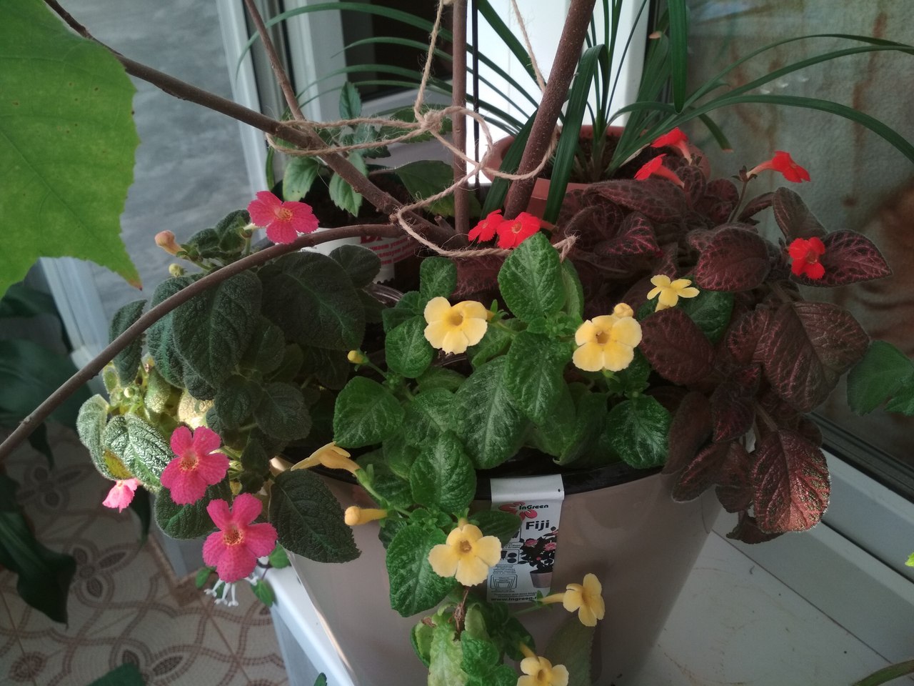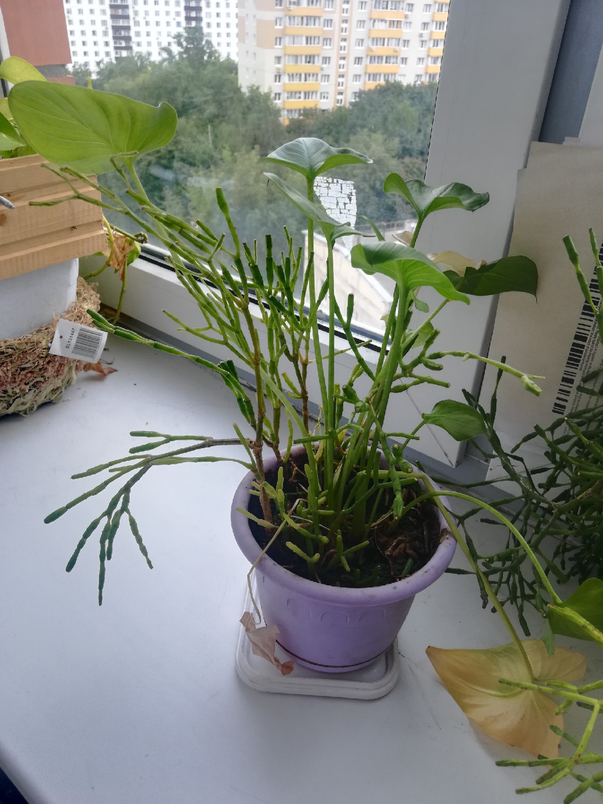 Тут, кажется, рипсалисы, но в фиолетовом горшке что-то еще, хуй знает, что с этим делать. На последней пикче хз че такое, но ему явно хуево. На первой - не знаю что, что-то высокое.