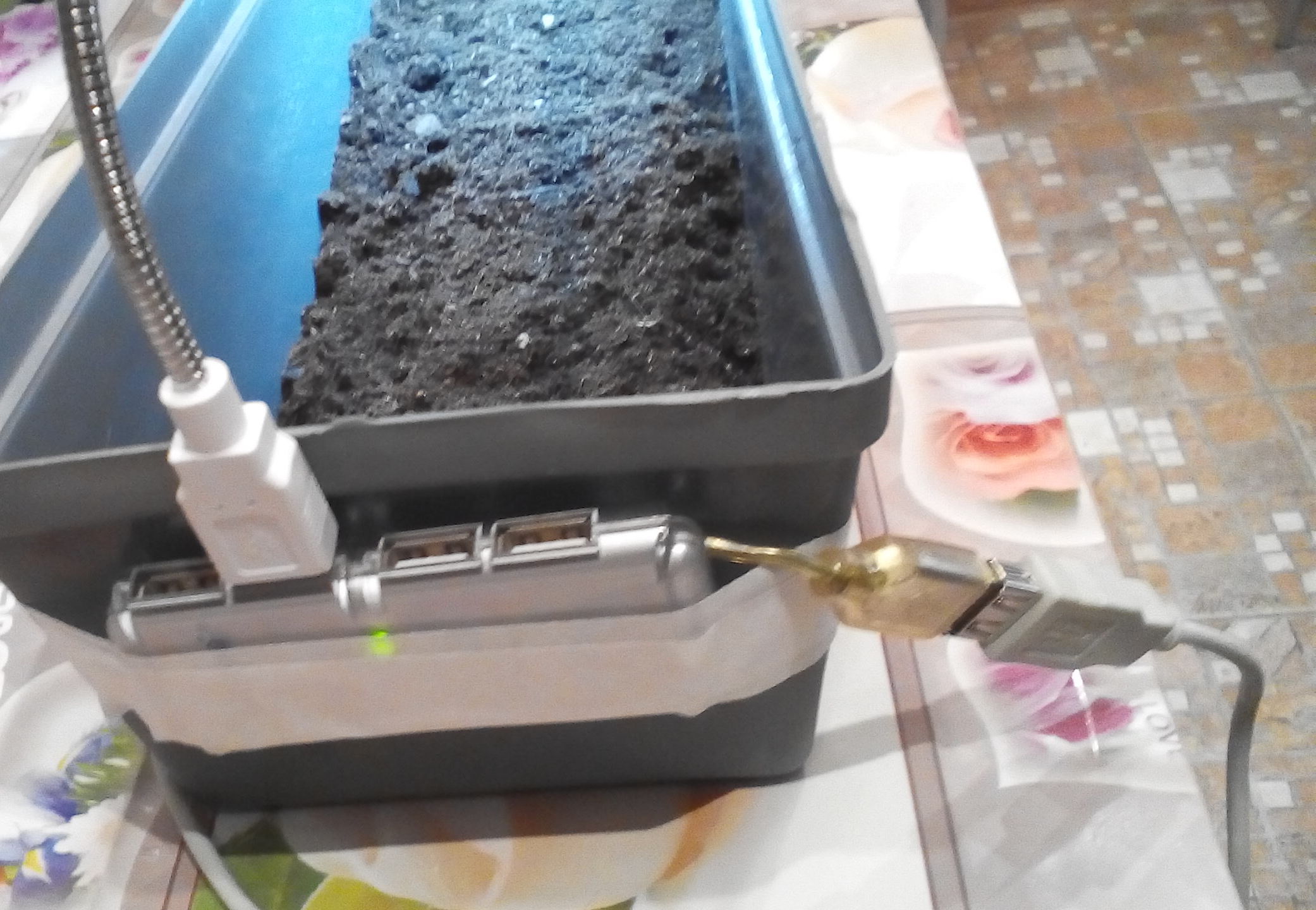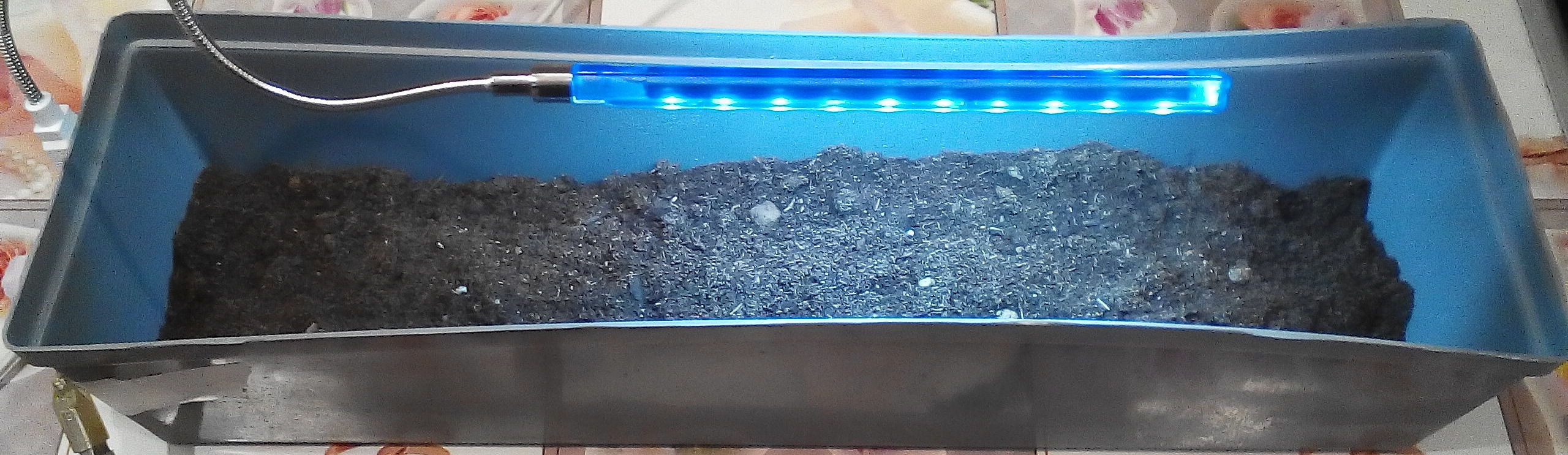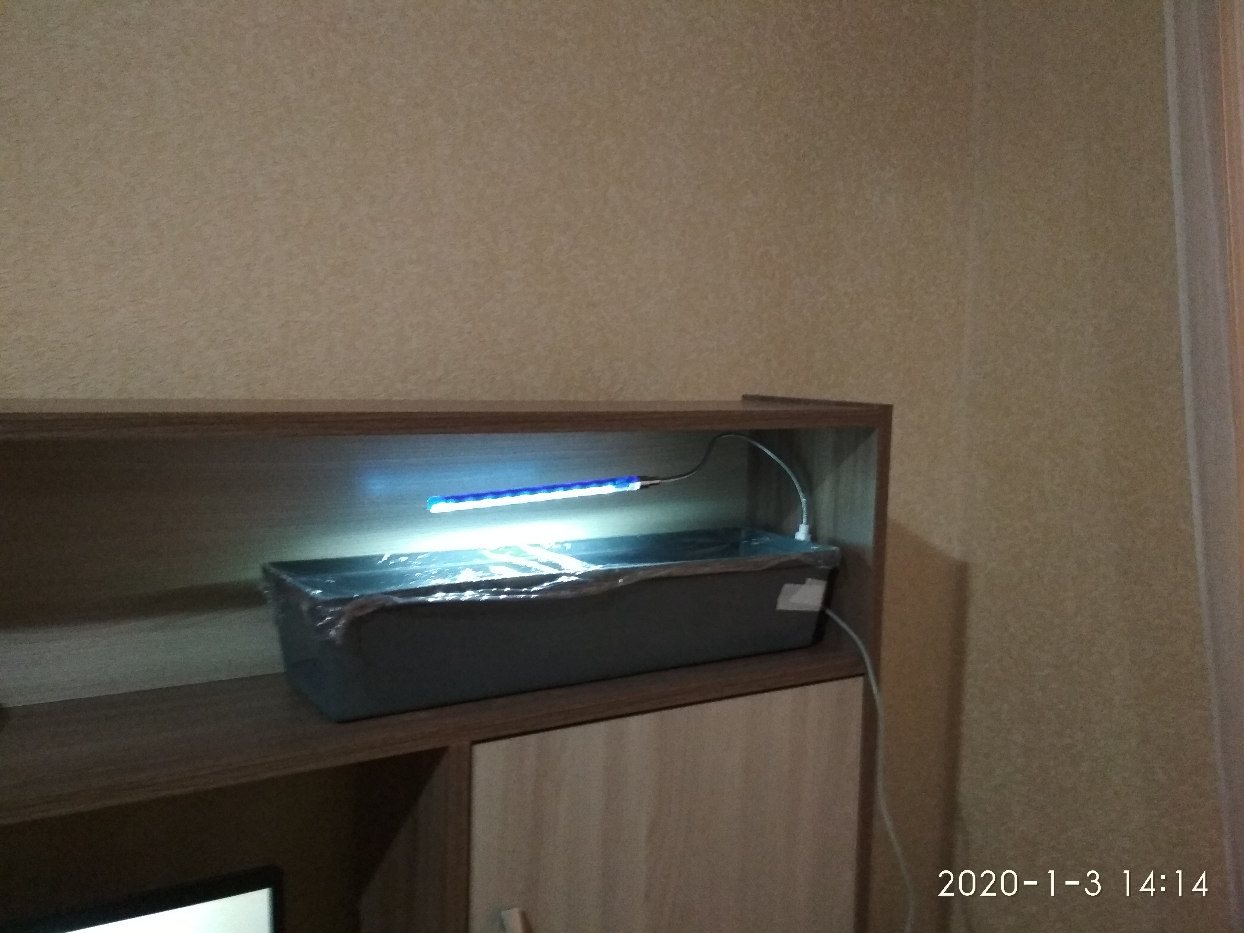 Я тут заскучал и решил попробовать вырастить кресс-салат. Если оправдает ожидания, то сделаю уже конкретный и аккуратный вариант. В полке стола протяну 2 метра диодной ленты и поставлю туда длинные горшки. А пока на скотче и UCB лампе.