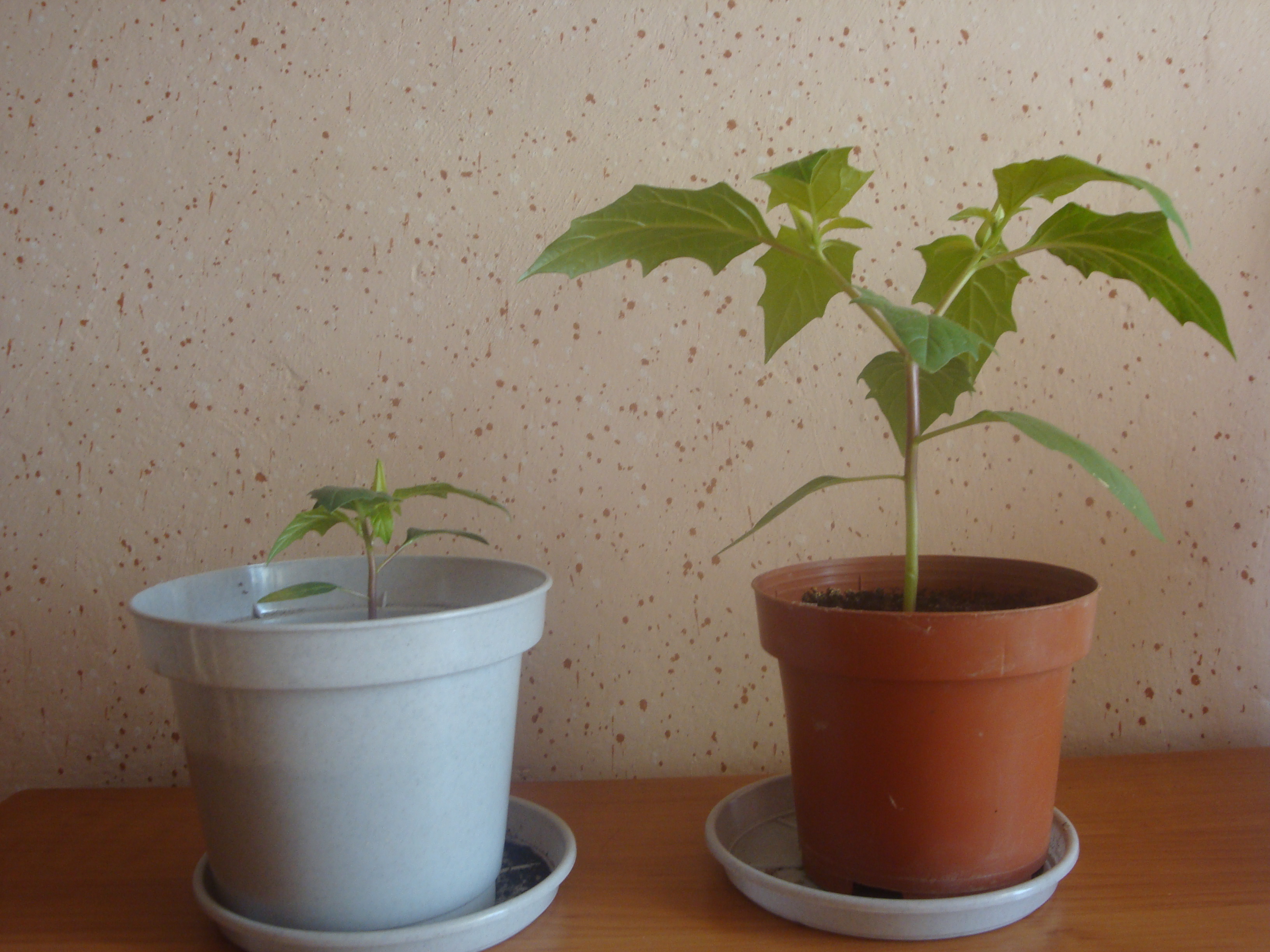 Удалось заполучить шишку дикого Обычного дурмана этим летом.В пакетики прозрачные залил воду,подождал пока семена начнут расти.Набрал земли в горшок из деревни,посадил туда.В природе семена летом выпадают на землю,а всходят только весной,хотя посаженые осенью в хороших условия уже начинают прорастать . Собственно у меня вопросы: 1.В природе оно в 10 раз больше чем в горшке,на пикче размер растения.Проблема в том что не было старификации?Низкая температура?Нужно высадить в открытый грунт?
