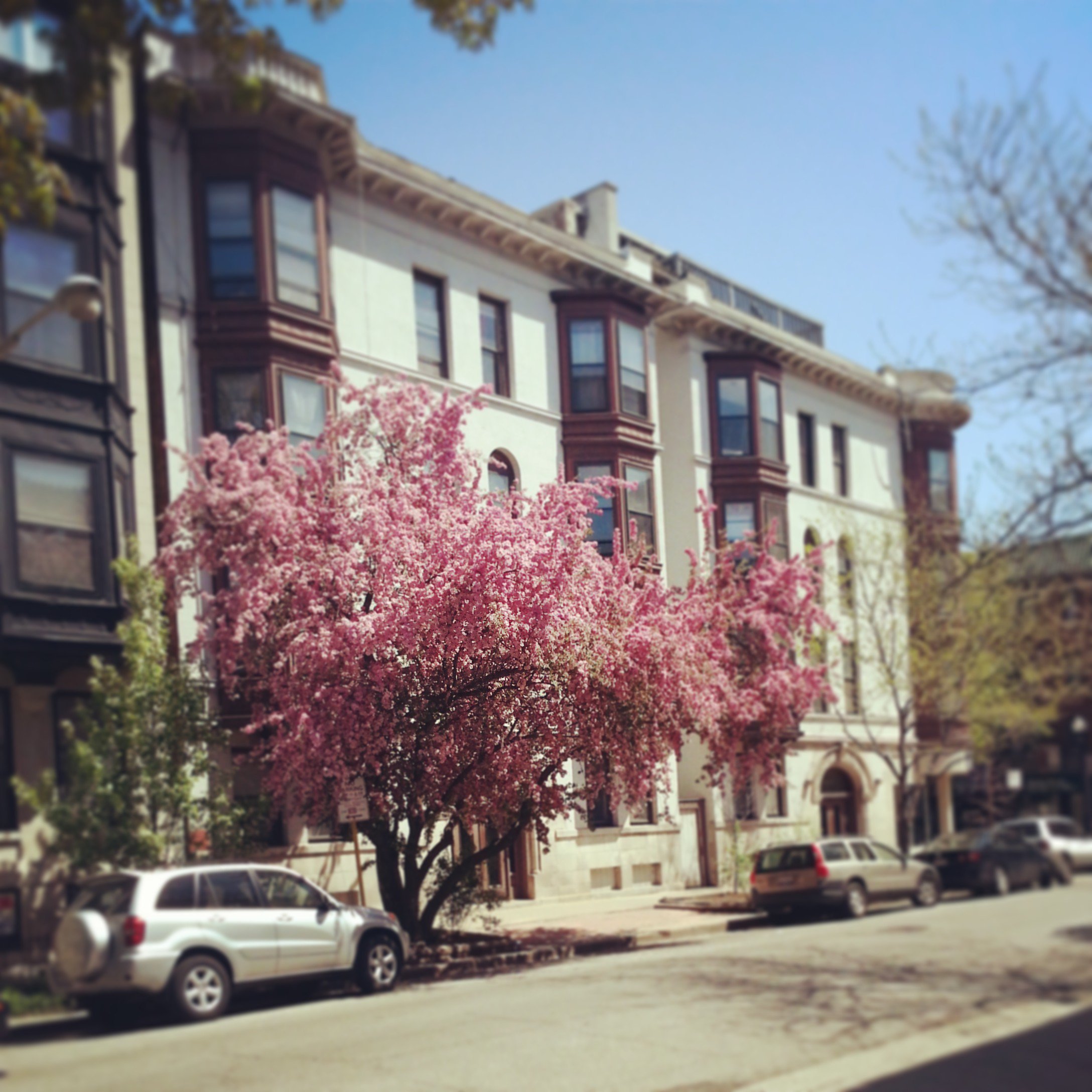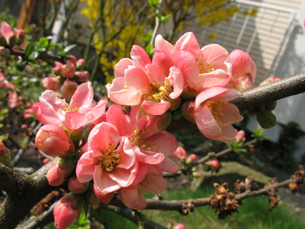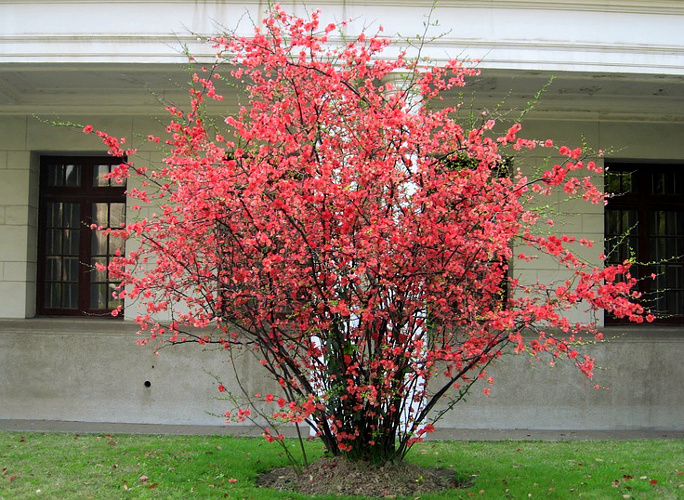 Есть такая штука - айва японская. Очень красиво цветет, хоть и не дерево. Зимует неплохо, главное снегом закидать или укрыть немного/пригнуть ветви к земле.