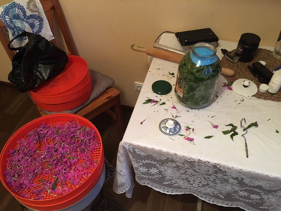 1. Собираем листья иван-чая, желательно те что понежнее, позеленее, помоложе (лучше в июне, но не позднее дня Ивана Купалы) затем повялила их в темном месте около 10 -15 часов рассыпав тонким слое на полиэтилен.пленку (одно ведро сырых листьев разместила на 4 кв.м.), при темпер. +20С после 15 час. сушки потеря влаги составила около 60%. т.е. из 1кг.300гр. сырых листьев на выходе 750 гр.