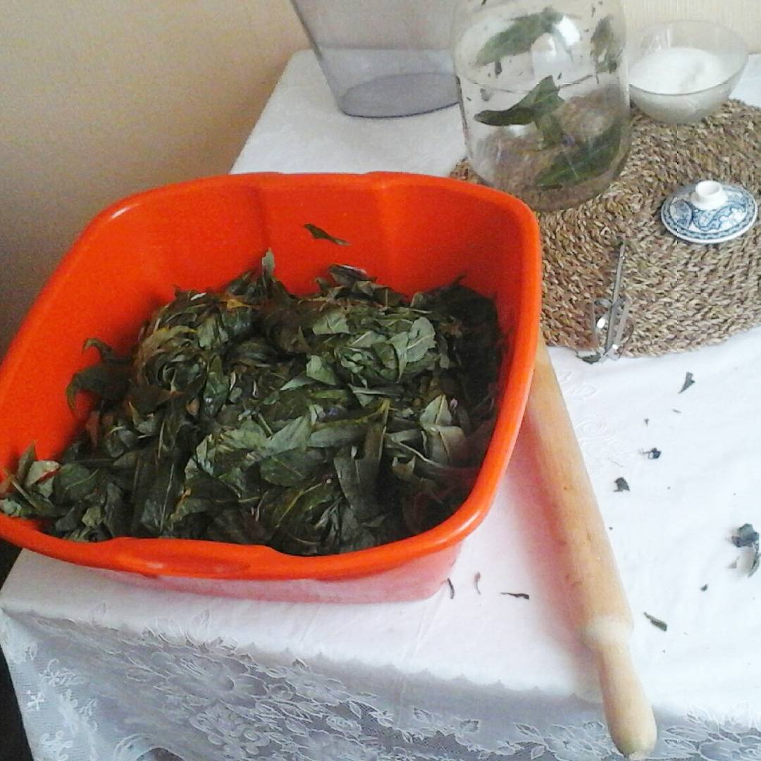 Собираешь сразу со стеблем, потом отрезаешь листья, даешь им полежать 2-3 часа, чтоб немного обмякли, складываешь в любй тазик или противен, мнешь пока не потекут соки, накрываешь влажной тряпой, даешь настояться 10-15 часов. (Чем больше, тем крепче). Потом в духовку на 1,5-2 часа на 80-100 градусов.