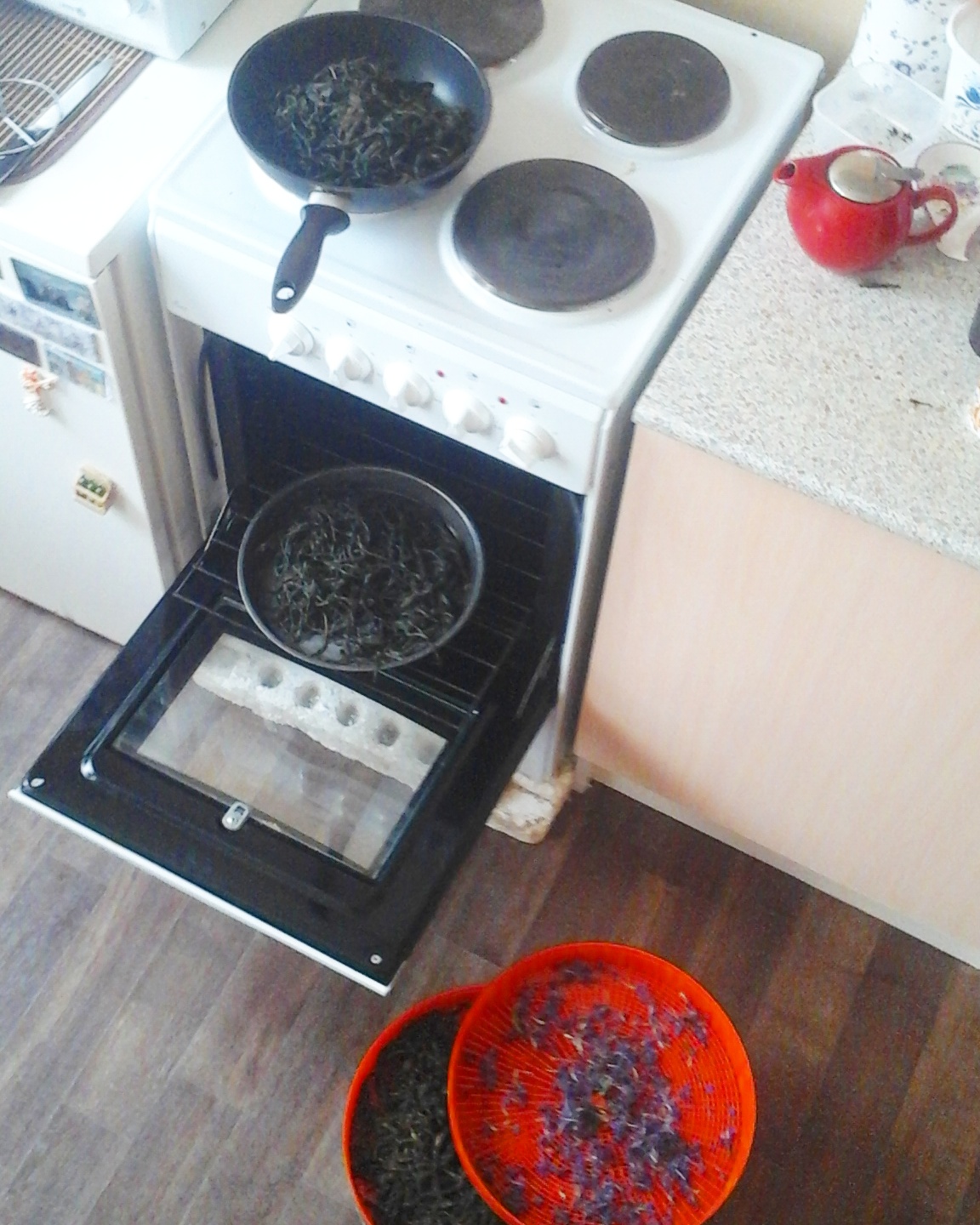 4. Сушка. Сушить можно как угодно. Главное тут резко прекратить все процессы в лисьях. На сквороде, на печке, в духовке, на ик панелях, хоть на заднем сиденьи твих черных жигулей в жаркий солнечный день. После сушки сразу засыпать на хранение не стоит. Нужно оставить его полчасика полежать на воздухе, чтобы сухой лист немного впитал атмосферноей влаги. Это нужно для того чтобы процесс дозревания происходил быстрее. С каждым месяцом хранения он становится все изысканей и вкусней. Вкус и аромат очень сильно зависит от месяца сбора. В мае можно собирать молодые маленькие листочки, и получать со слабой ферментацией очееь ароматный цветочный запах. В июне делать отличный улун с запахом меда. В июле делать красный чай с выраженными нотами чернослива. В августе, сентябре вновь собирать молодые листья с молодых побегов, они обычно красные. Старые поздние высокие растения подходят для чая мало. Они обычно дают вкус морской капусты.
