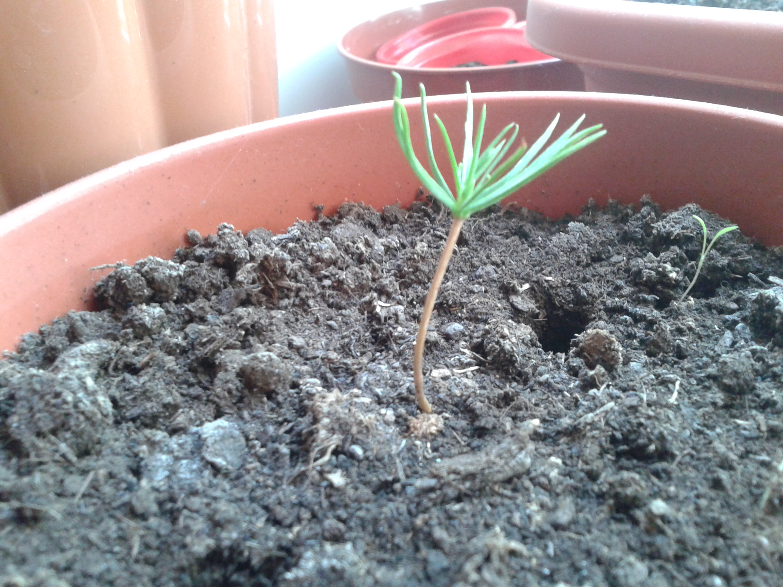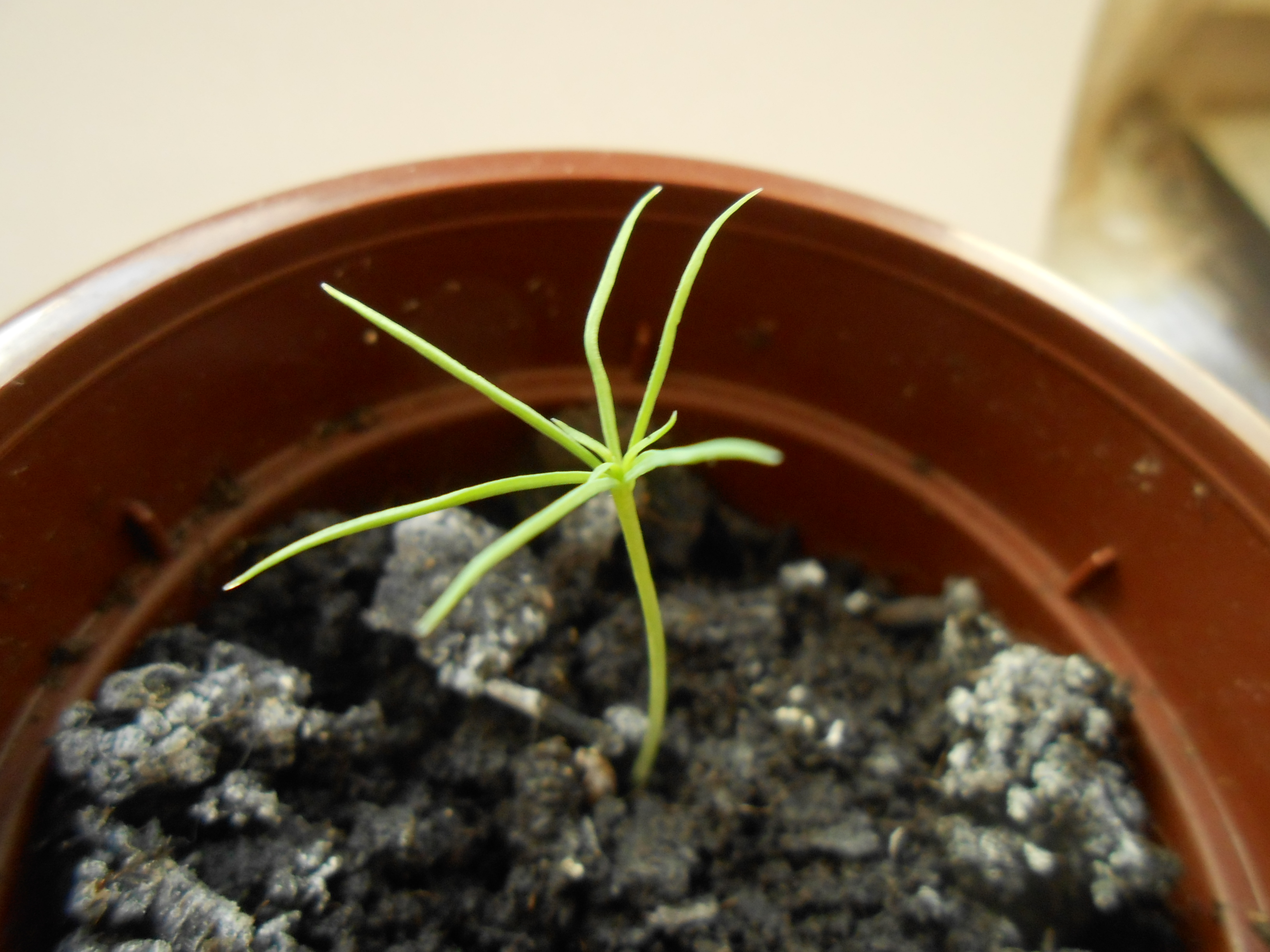 Сосоны, что это может быть за хвойное растение? Нашёл шишку почти в поле (как-то привлекла внимание), вроде не сосновая (вокруг лес и вроде знаю, как они выглядят), тёмно коричневая, немного вытянутая была, см 4-5. Семки даже попробовал, на вкус почти как кедровые. Закопал в магазинную землю и вот одно проросло, растёт уже вторую неделю.