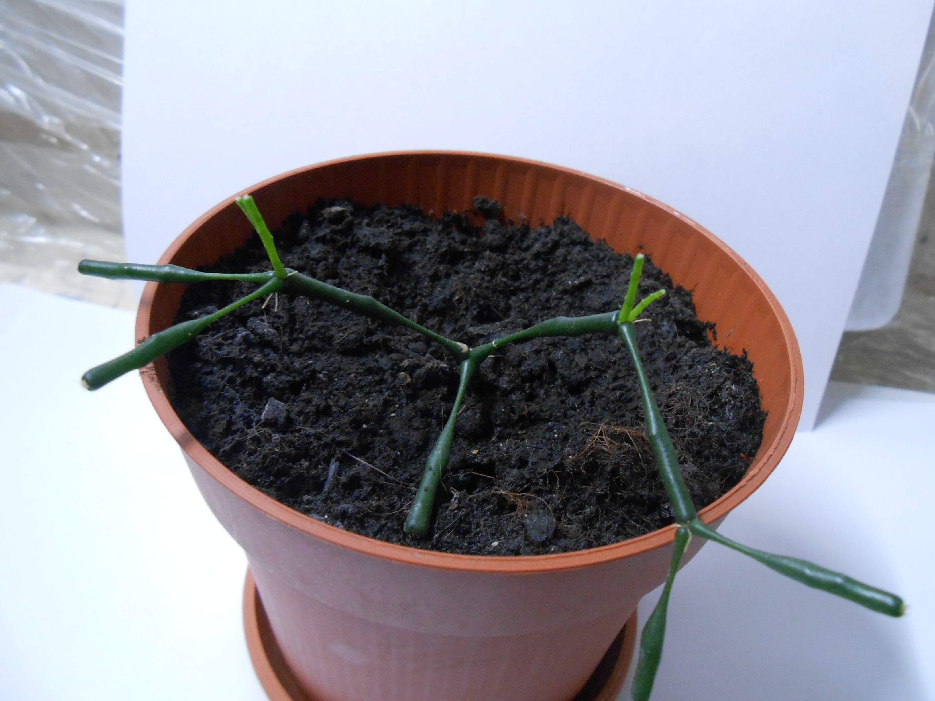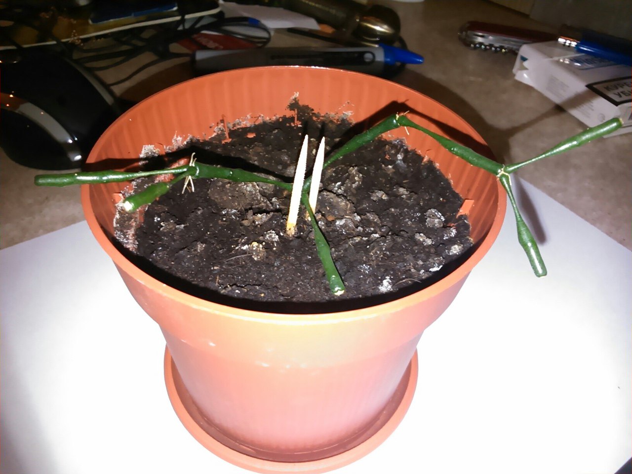 Начну с хатиоры, а там как пойдёт. Качество пиздос, извиняйте, может потом что-нибудь решу с этим. Кусок хатиоры был отломан от большого растения в поликлинике, очень долго стоял и ничего вообще не делал, я не выдержал, вынул его, убедился, что укореняется, оборвал часть корней случайно и посадил обратно. Через пару месяцев он начал усыхать, я наконец взялся погуглить, что ему надо, и оказалось, что у него начался период роста, когда его надо поливать нормально. И тут он как начал отпускать новые сегменты, уже около 10 появилось, и потихой растёт. Эта хуйня меня пугает, однажды она меня сожрёт.