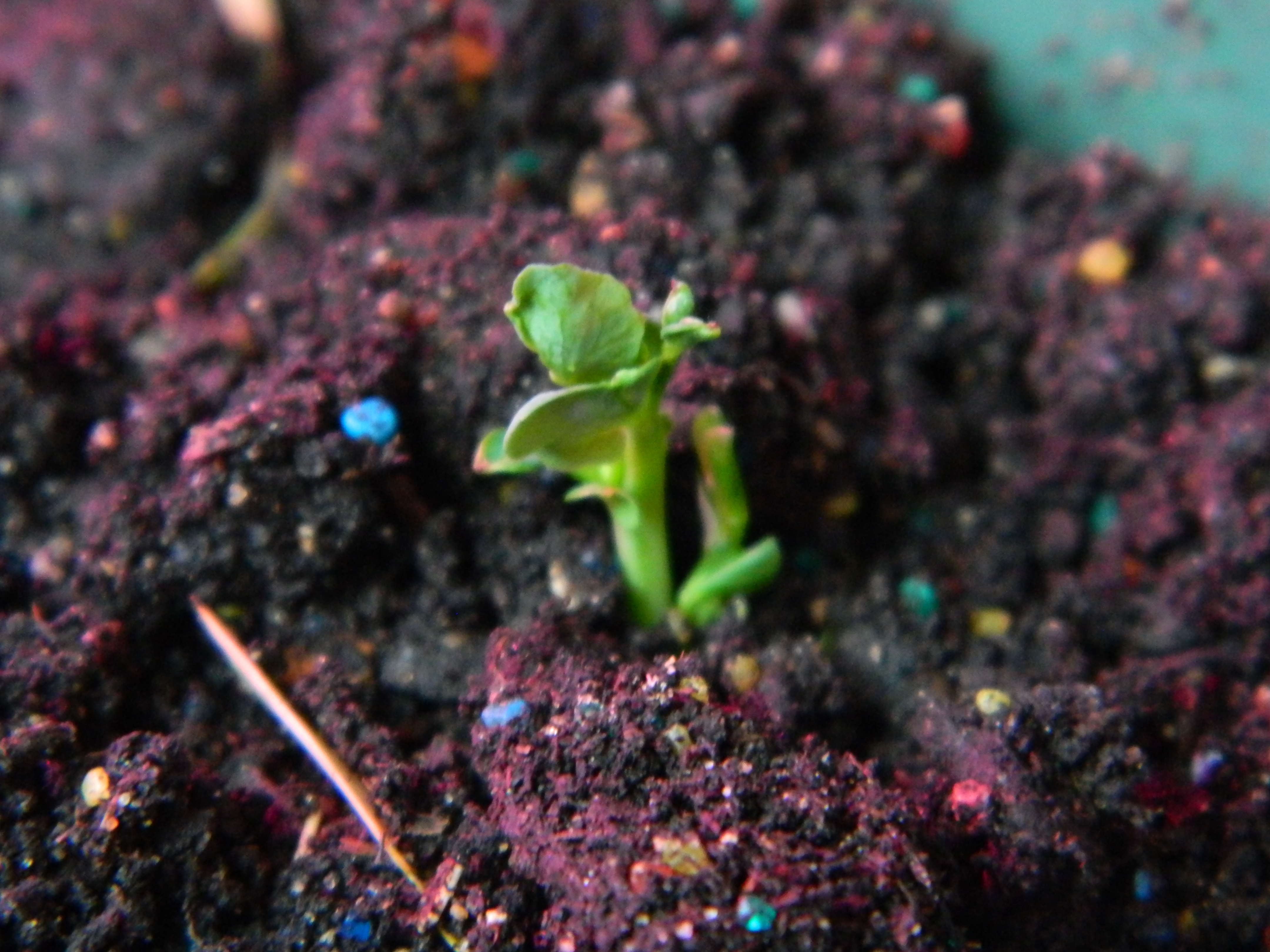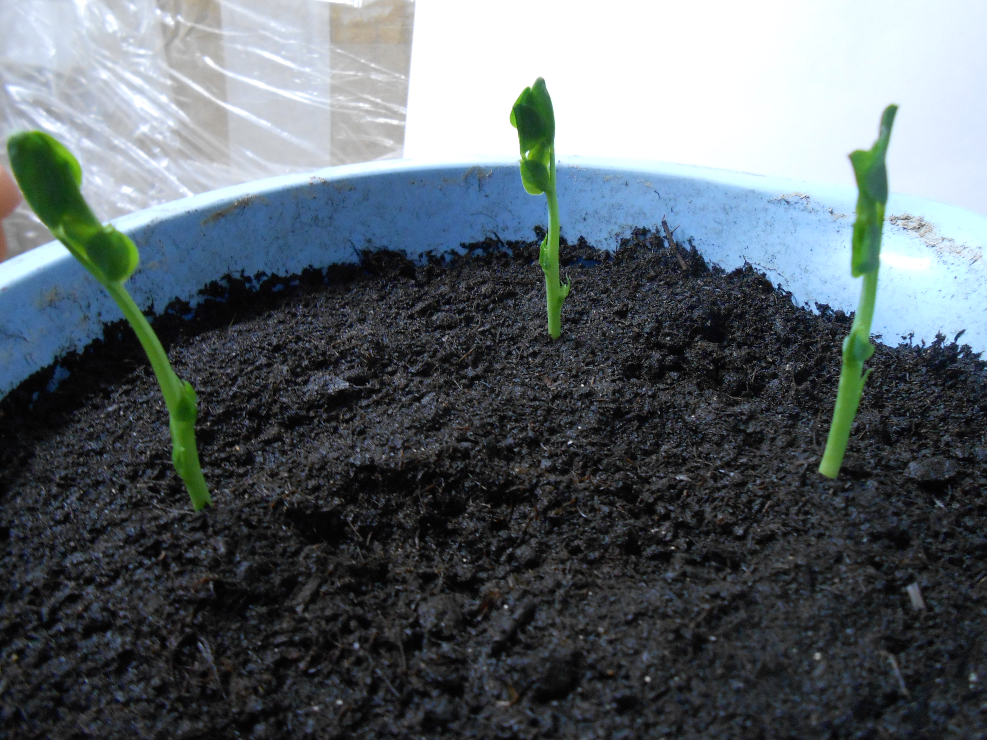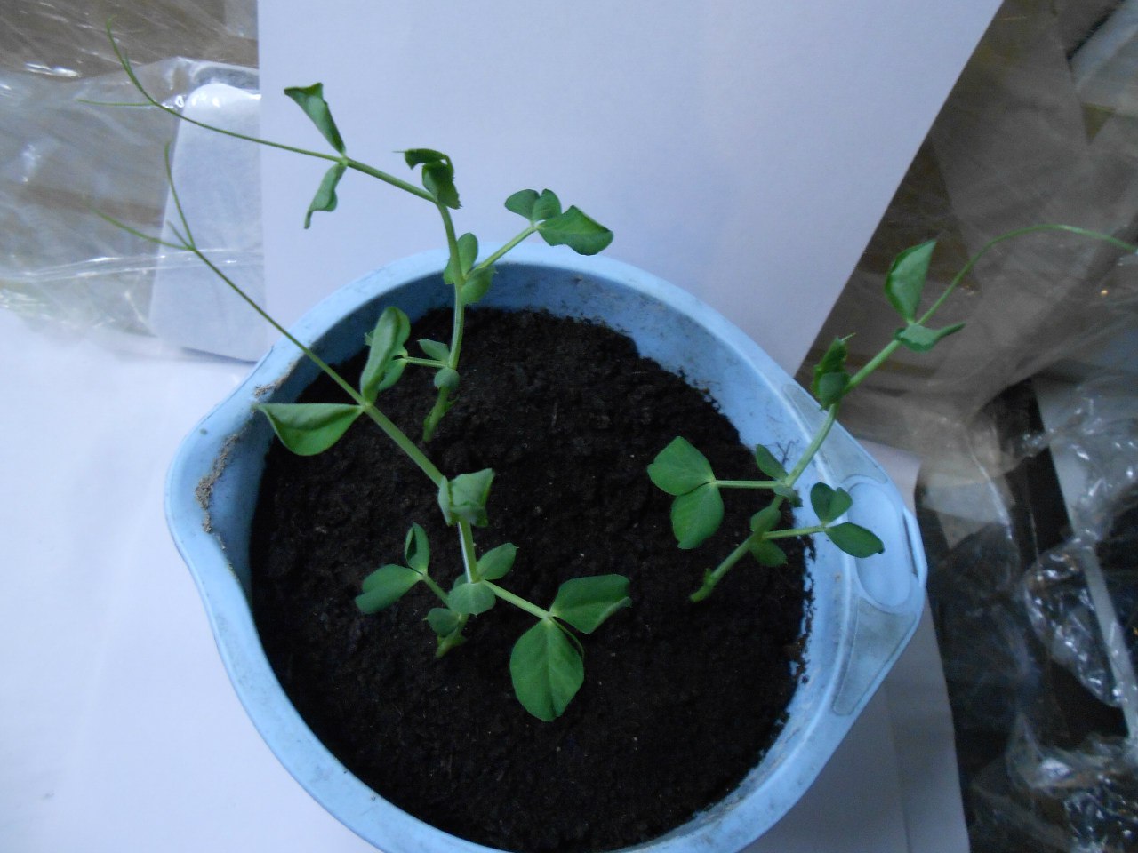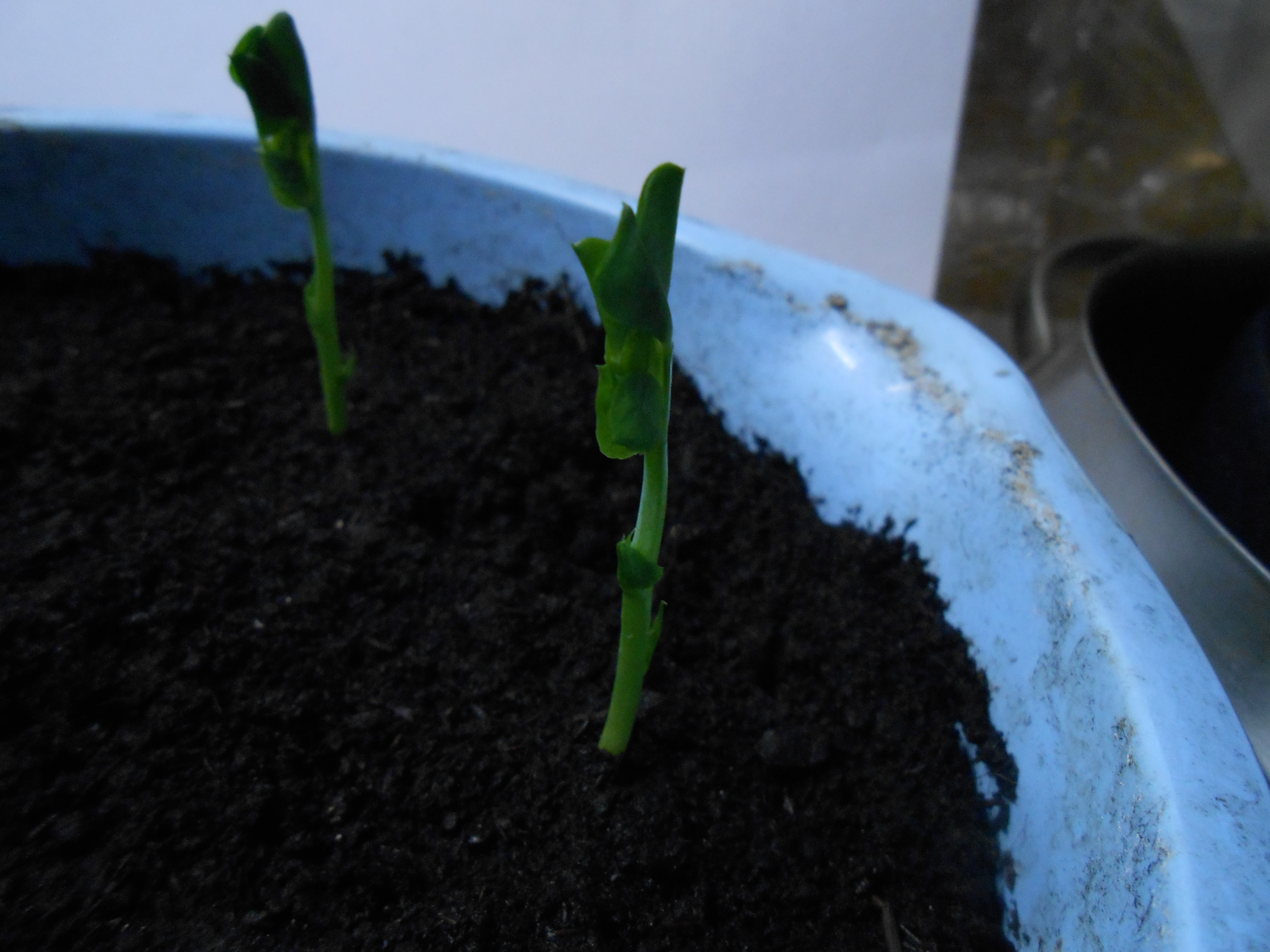 Ещё внезапно обнаружил, что проросло одно семечко яблони, которое я без стратификации просто кинул в землю. Посадил его отдельно, а в голубую бадью кинул три горошины.