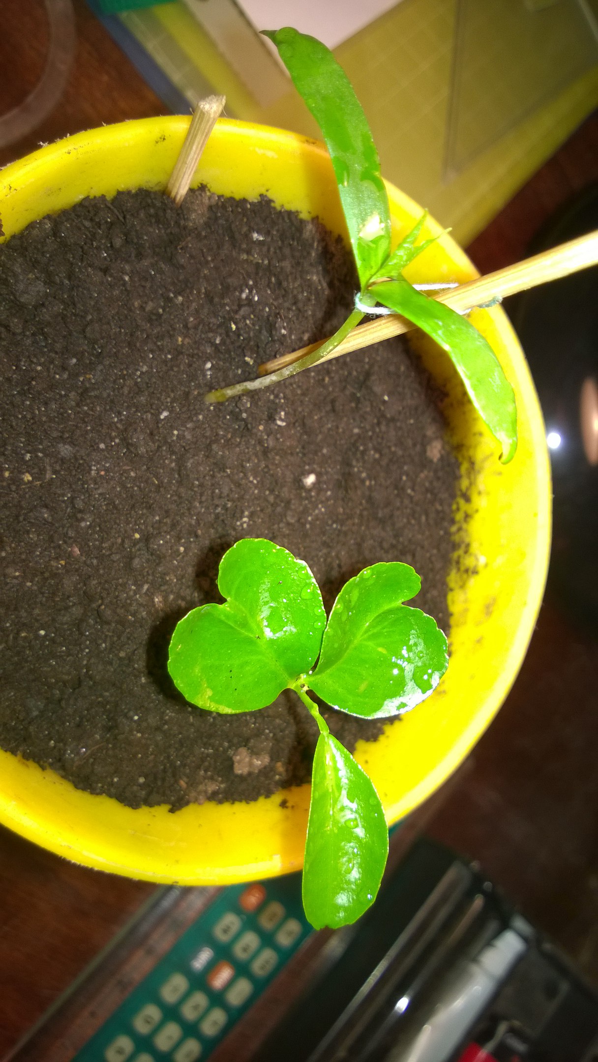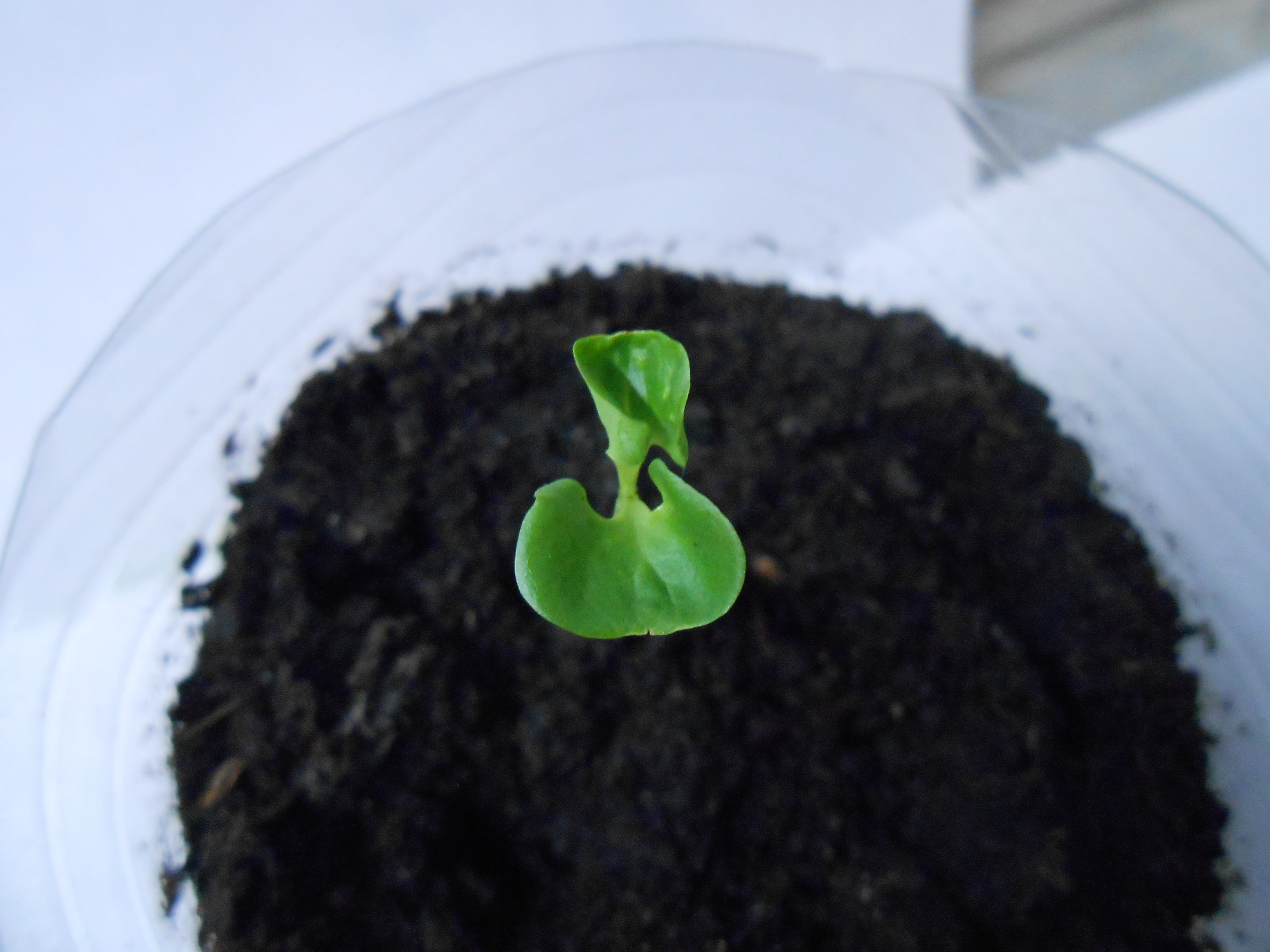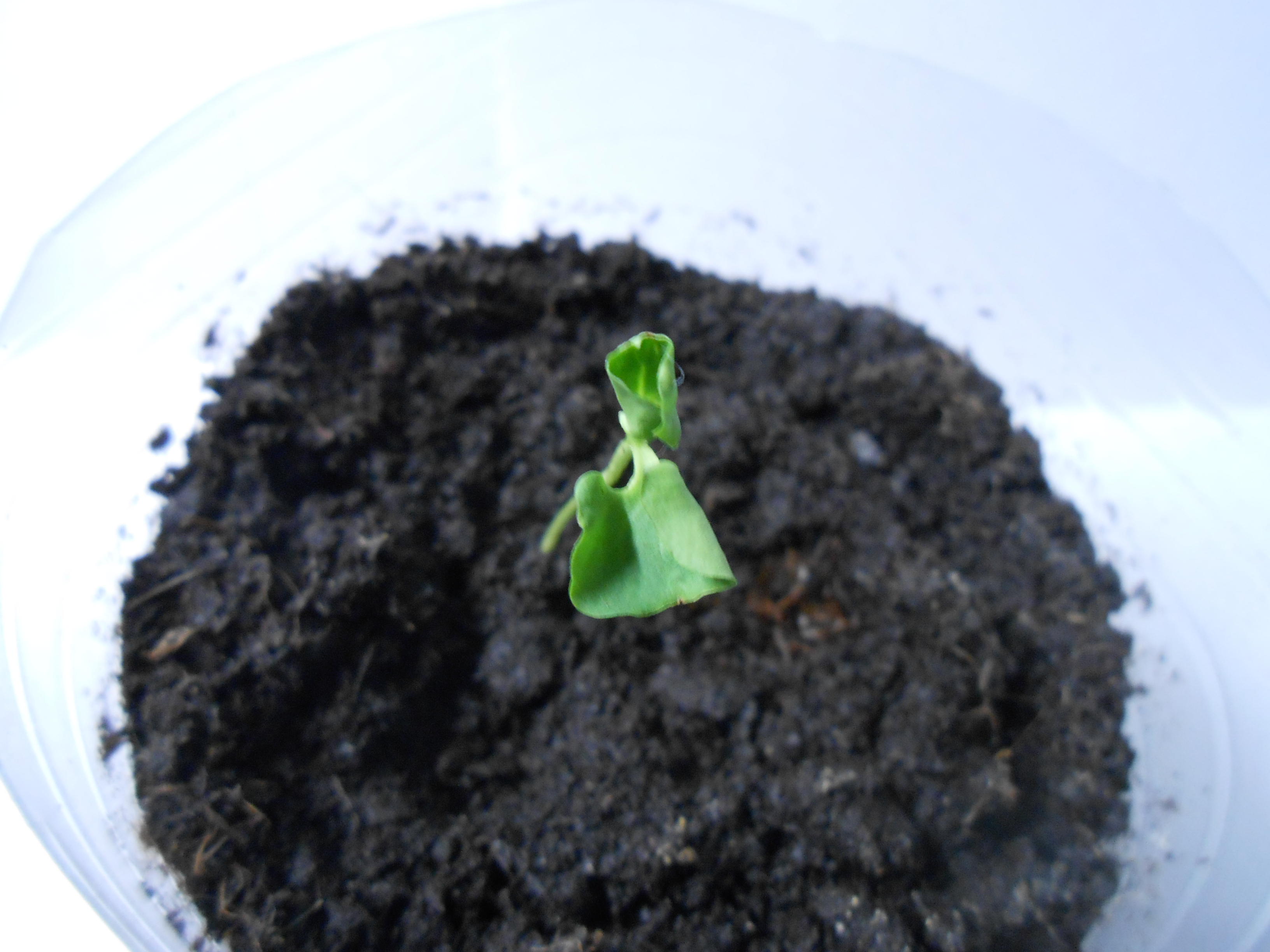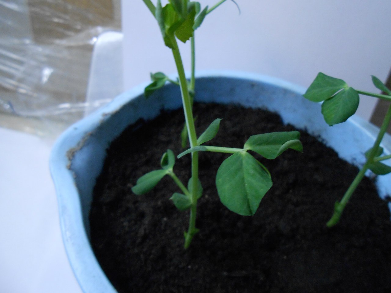 Ещё внезапно обнаружил, что проросло одно семечко яблони, которое я без стратификации просто кинул в землю. Посадил его отдельно, а в голубую бадью кинул три горошины.