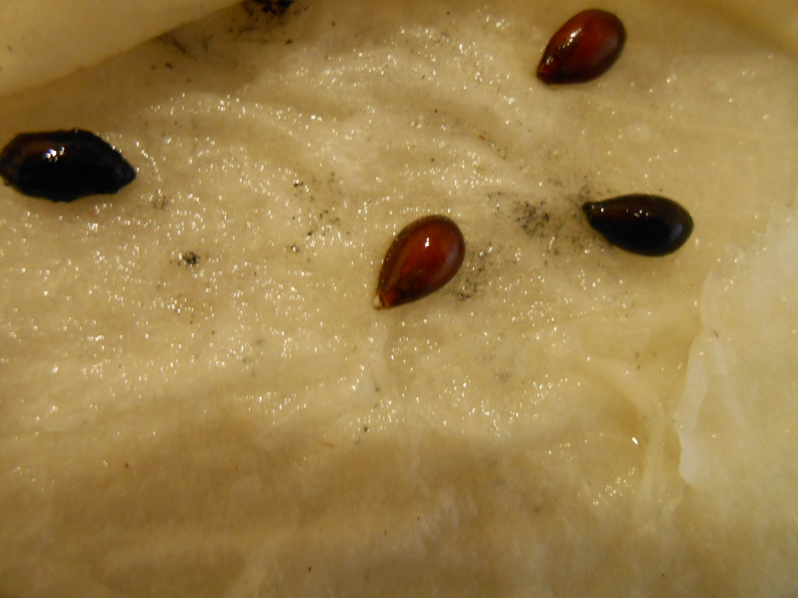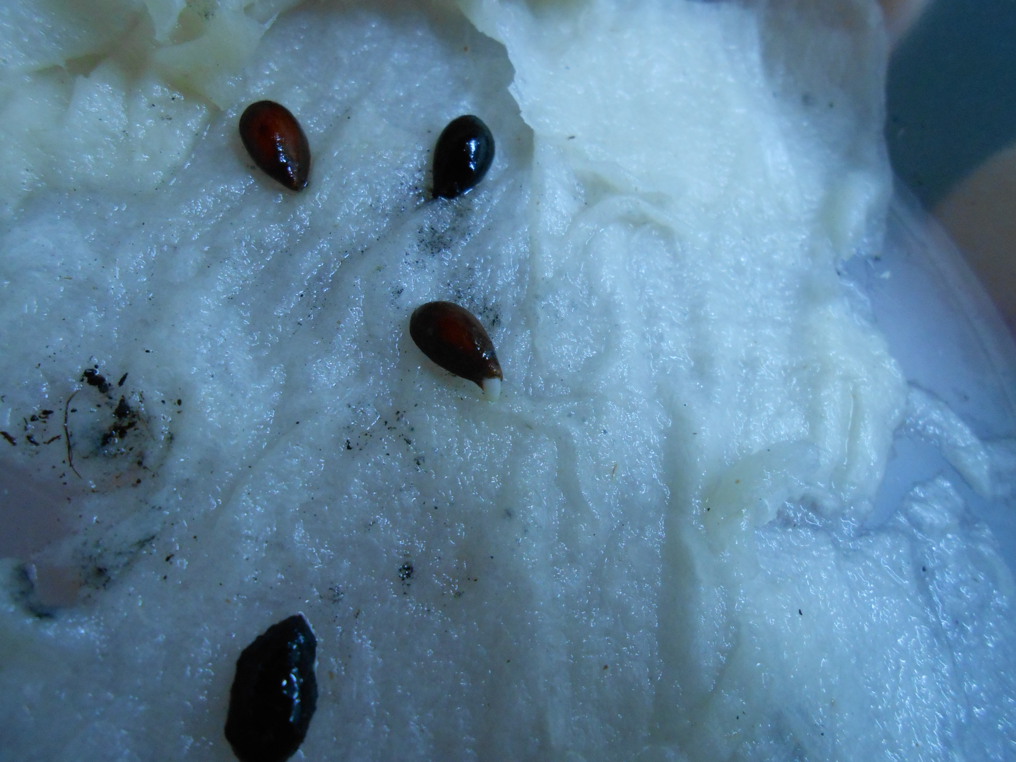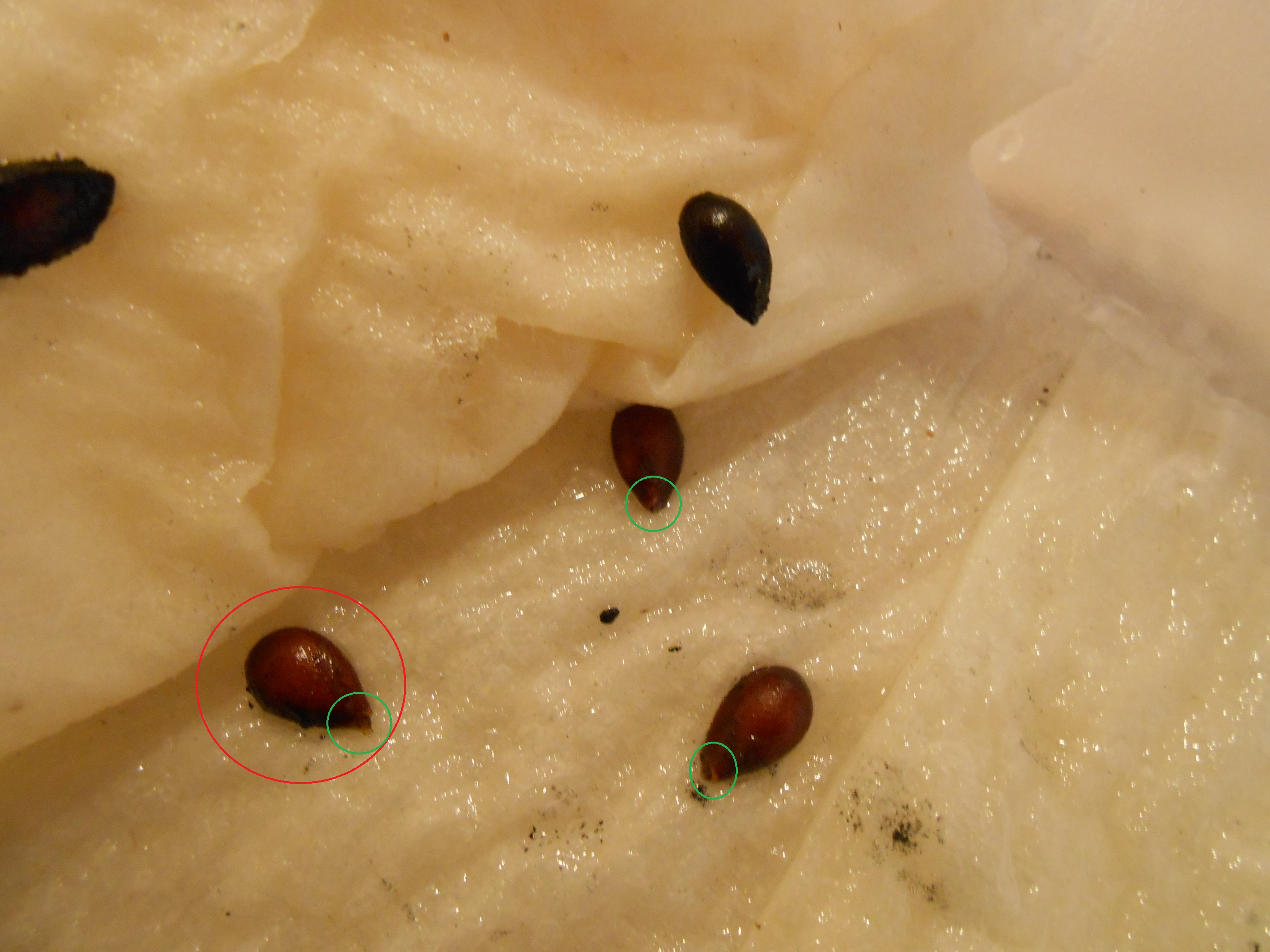 Собсно вот эти три "запустившихся" семечка (зелёным выделил, где они расти начали), везде рекомендуют держать семена в холоде, пока не появятся ярко выраженные побеги. Но интереса ради, да и скучно мне, я решил самую бодрую из трёх посадить. Вообще у меня уже такой опыт был, две тёмные косточки на пером фото лежат уже очень давно, и их тоже три было, одна начала прорастать, и я в нетерпении посадил её, пару недель рос отличный саженец, а потом он внезапно засох. Так что посмотри, что будет с этим.