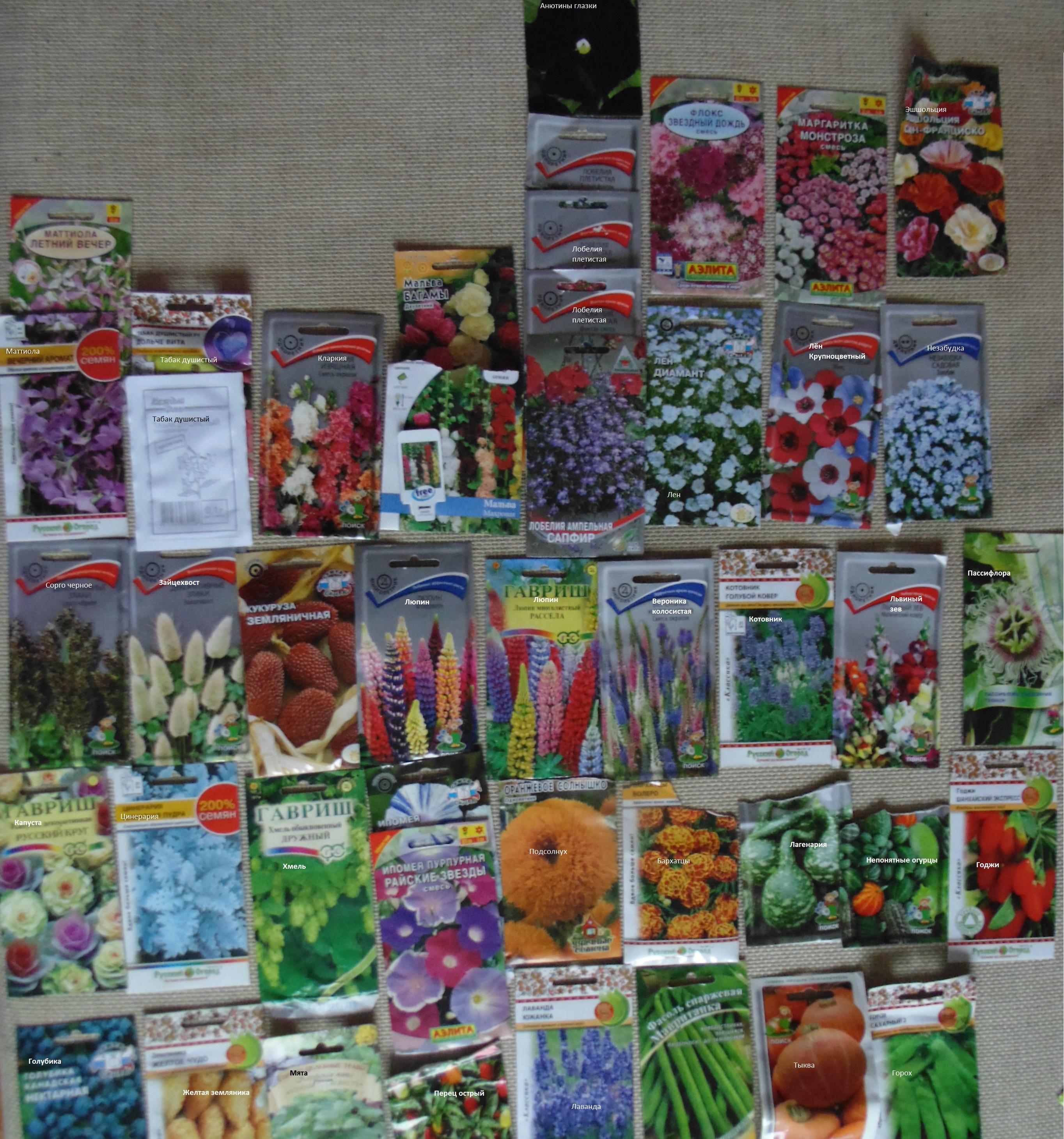 1. Маттиола 2. Душистый табак дорогие семена против дешевых 3. Кларкия 4. Мальва 5. Анютины глазки высажены на рассаду, взошло что-то непонятное 6. Лобелия ампельная и плетистая последней имеется смесь расцветок+алые и белые 7. Флоксы, похожие на гвоздику 8. Маргаритки 9. Эшшольция 10. Лен голубой и смесь расцветок крупноцветного 11. Голубые незабудки 12. Злаки Черное сорго и Зайцехвост. закину в дальний угол двора 13. Земляничная кукуруза в том году высадил в середине июля, до заморозков успела отцвести 14. Люпины разных цветов 15. Вероника колосистая 16. Котовник 17. Львиный зев смесь расцветок 18. Цинерария 19. Декоративная капуста 20. Хмель 21. Ипомея полосатая и смесь цветов 22. Декоративный подсолнух 23. бархатцы 24. Пассифлора 25. Лагенария то же что и с кукурузой 26. Непонятные огурцы из десяти взошло 8, сейчас в состоянии рассады 27. Годжи сдохнет, скорее всего 28. Голубика заебно проращивать, скорее всего не выйдет 29. Желтая земляника 30. Мята 31. Лаванда 32. Перец острый 33. Спаржевая фасоль 34. Скороспелые тыквы 35. Горох.