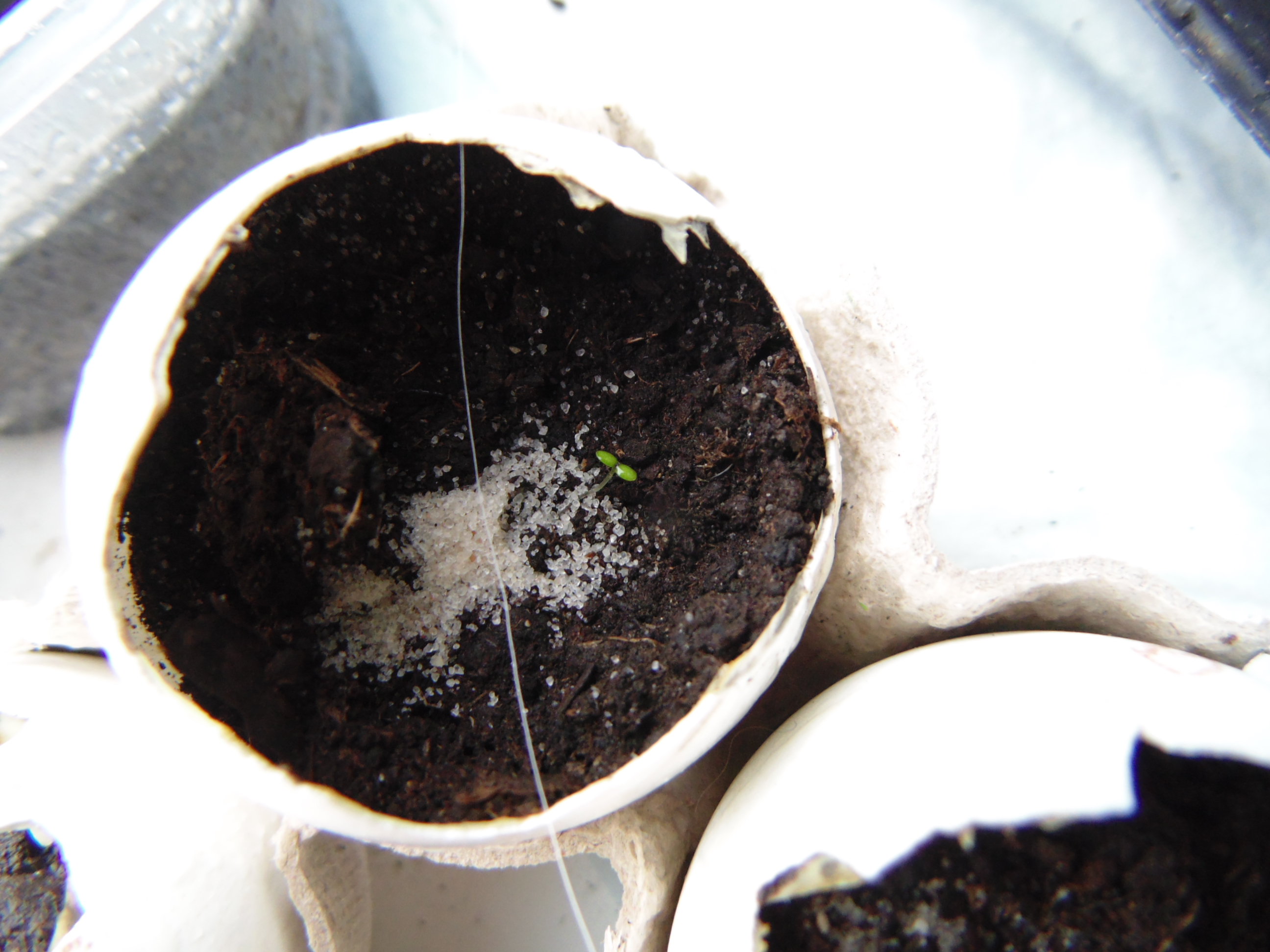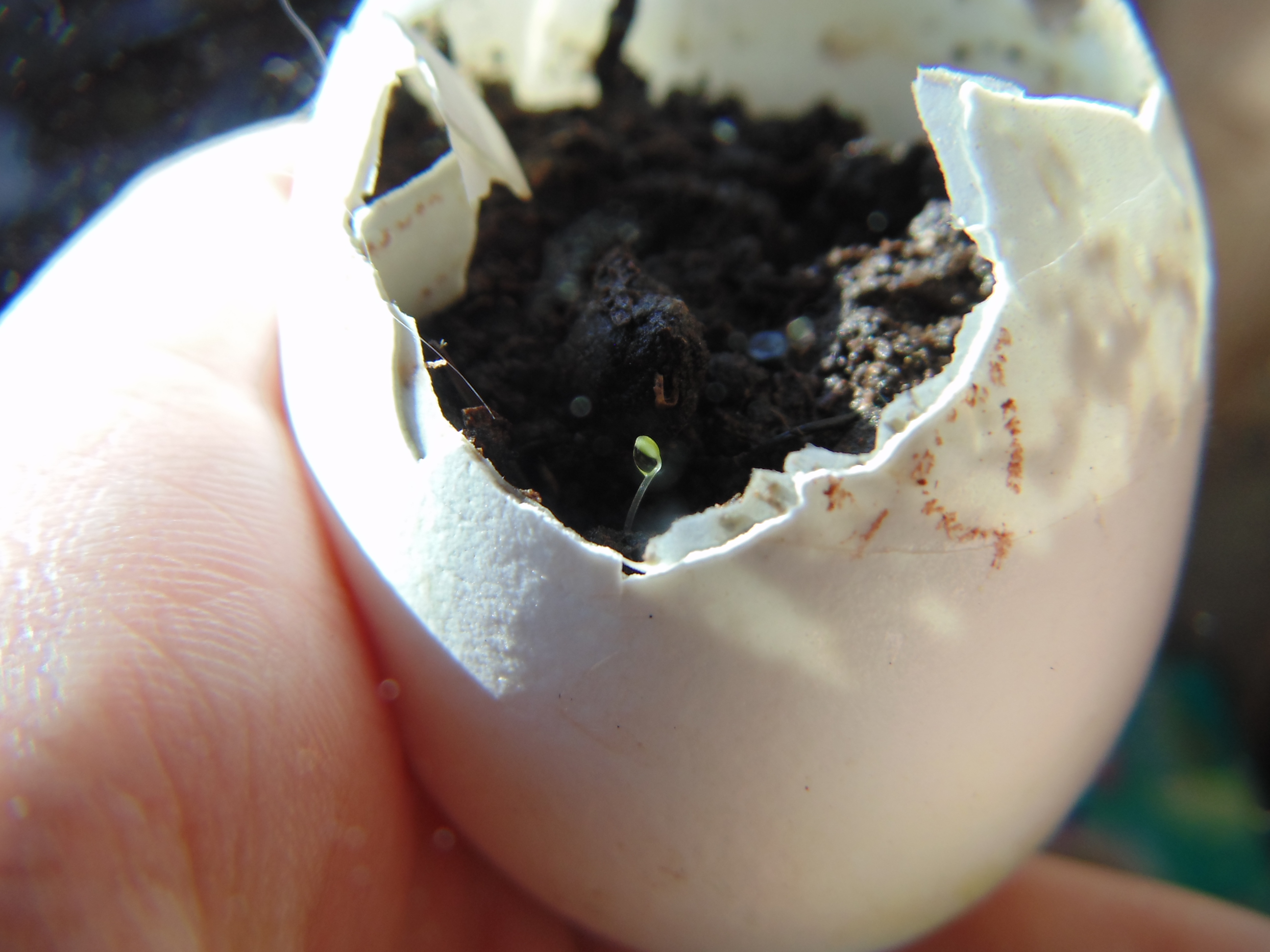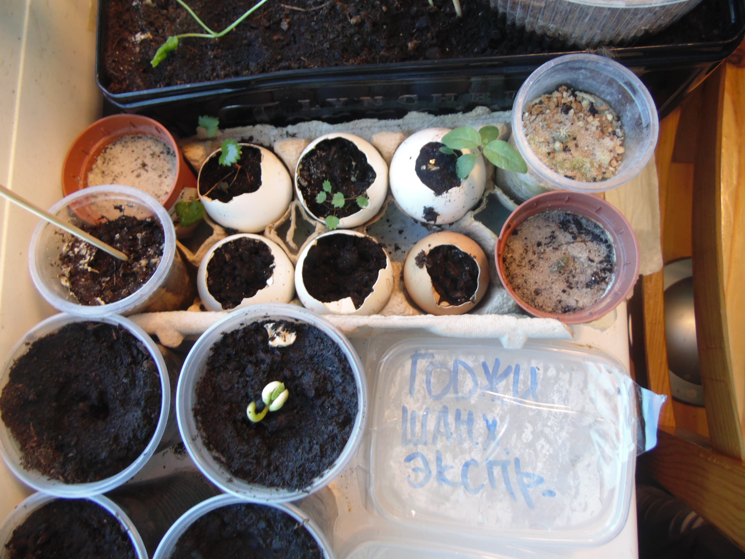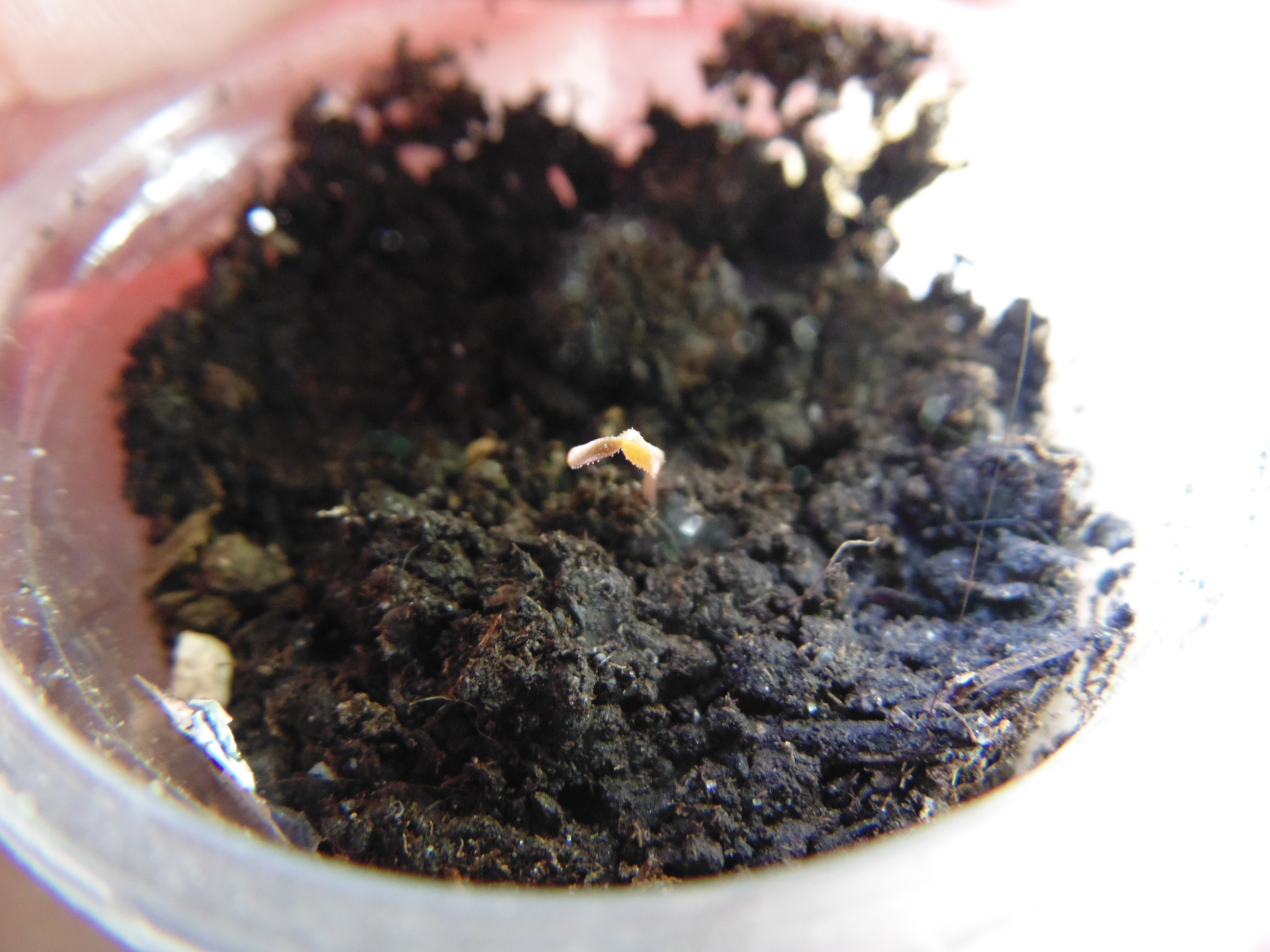 Заметил только когда постил. "Да что-то же взошло!" Учитывая, что грунт попался дерьмовый, это может быть и не земляника. Но вроде и стебель прозрасный и листья по размеру семки. Расковырял скорлупу, поставил на солнышко.