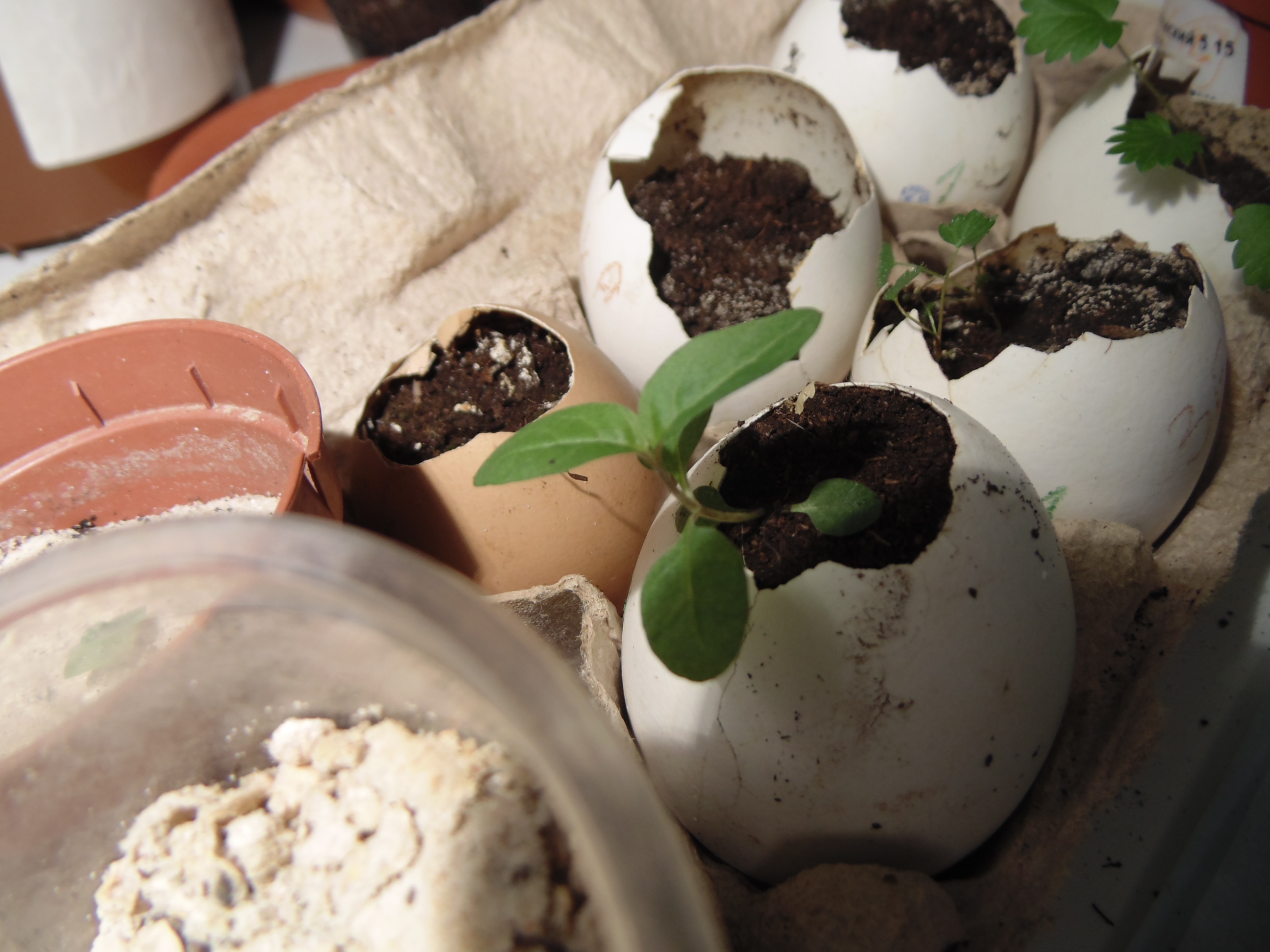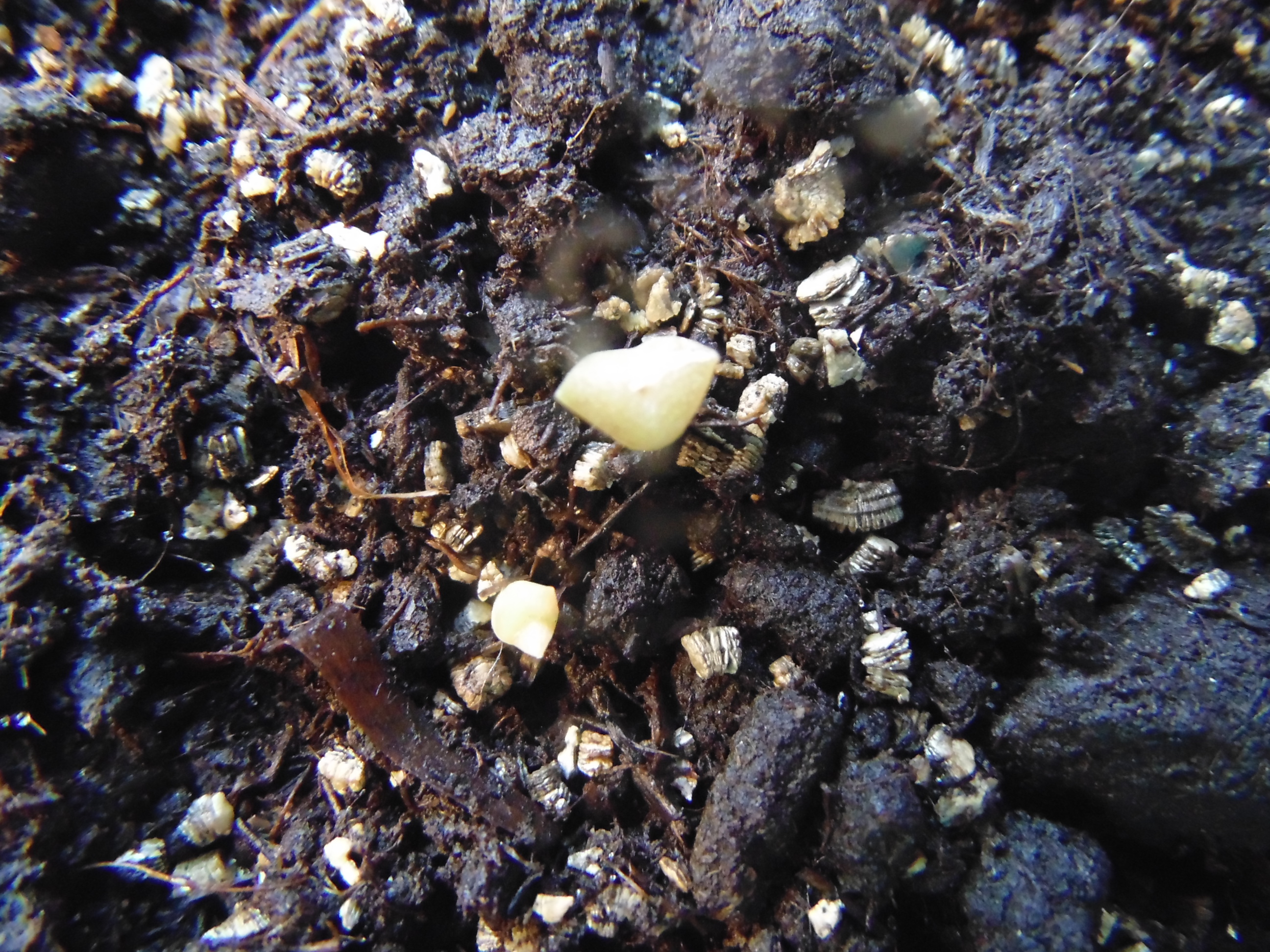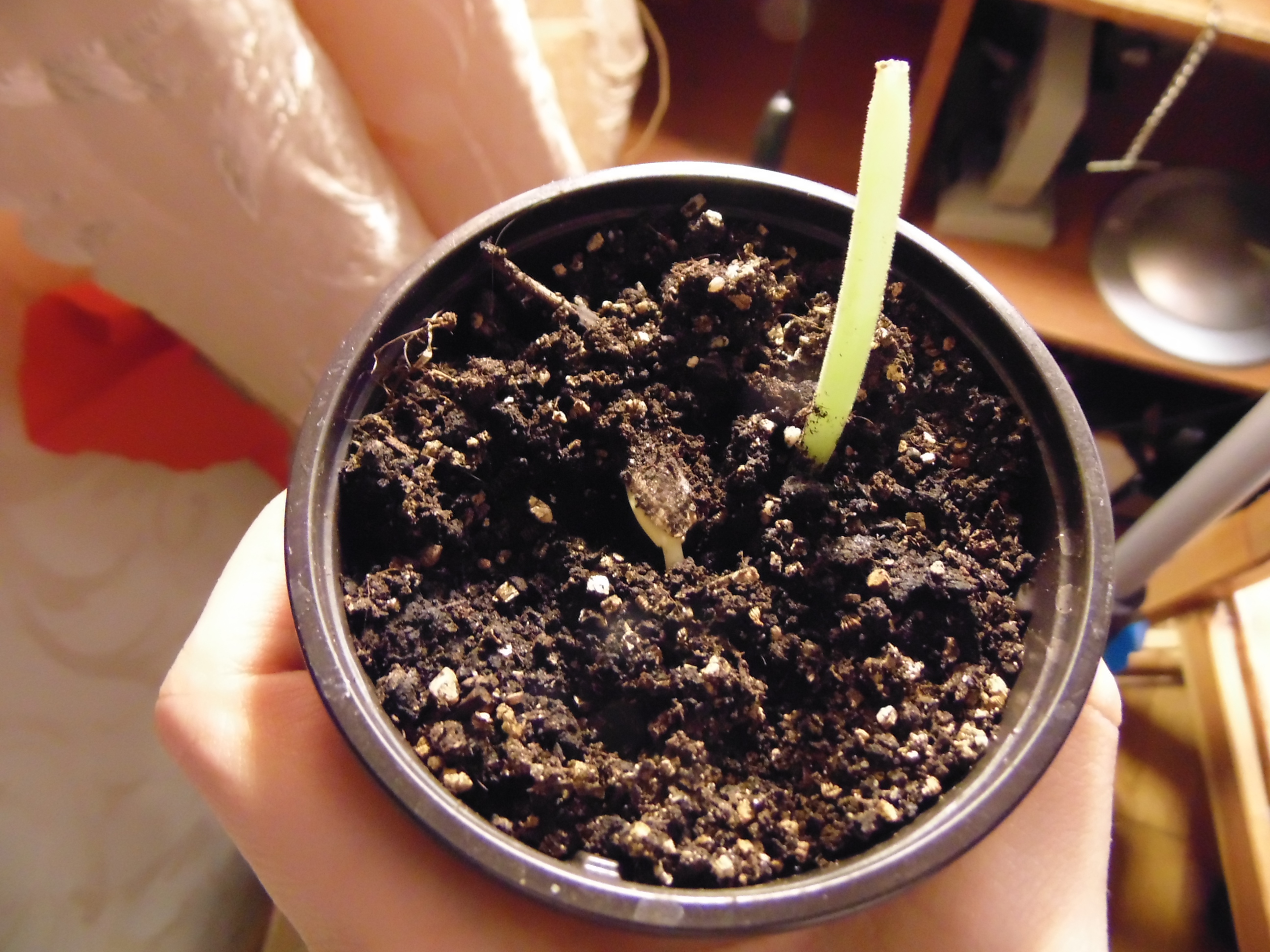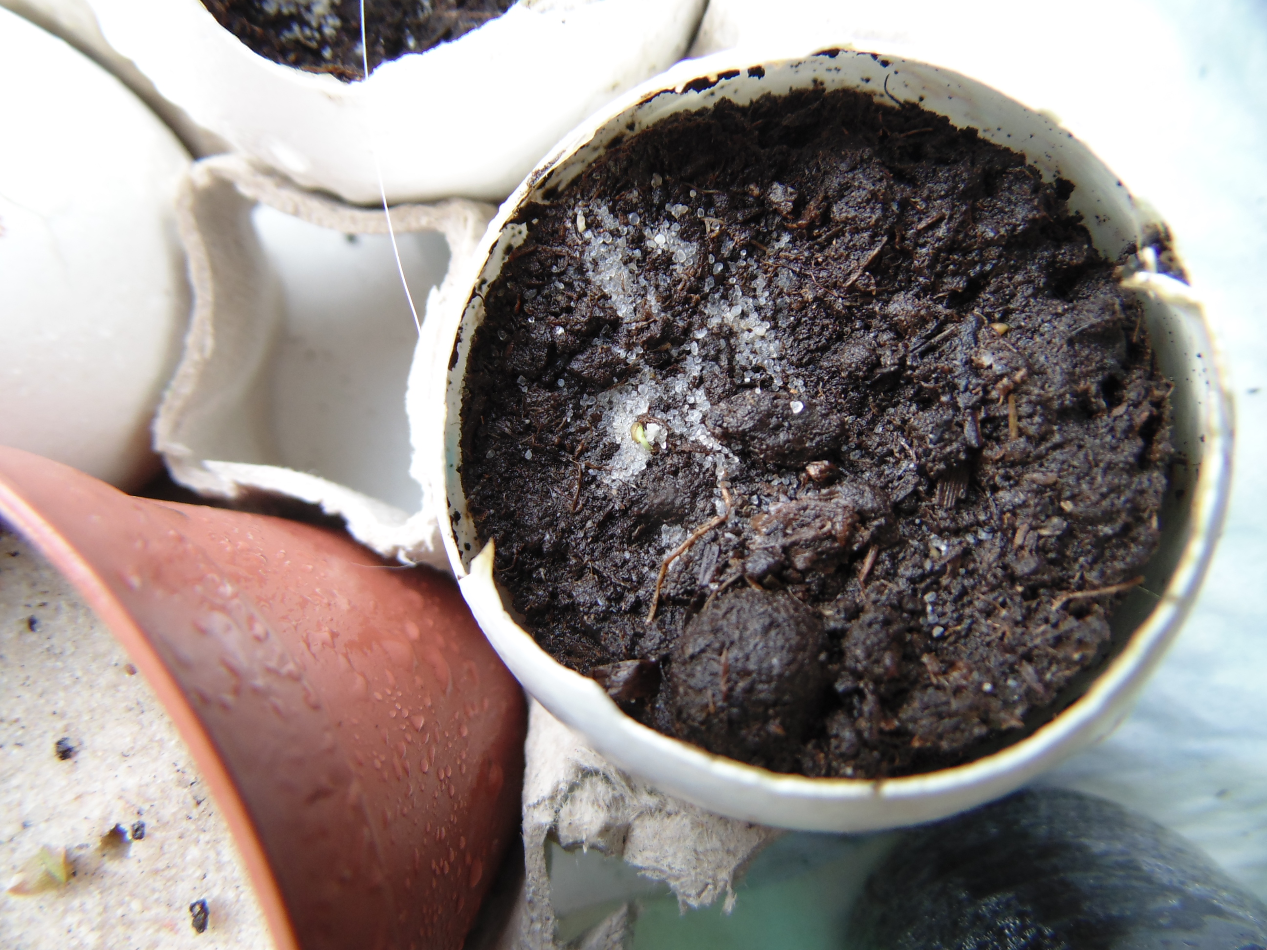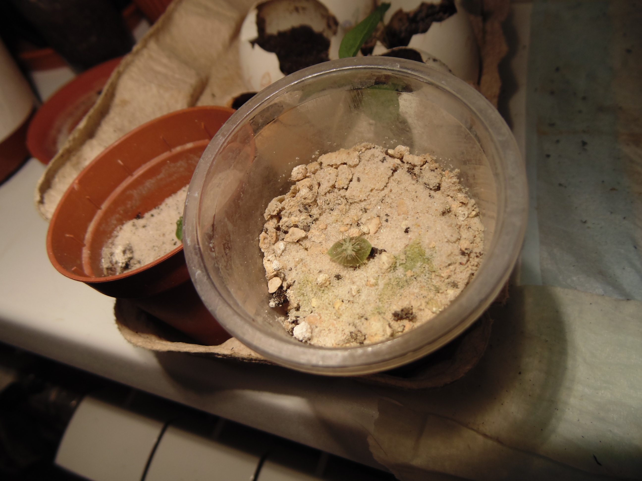 Заметил только когда постил. "Да что-то же взошло!" Учитывая, что грунт попался дерьмовый, это может быть и не земляника. Но вроде и стебель прозрасный и листья по размеру семки. Расковырял скорлупу, поставил на солнышко.