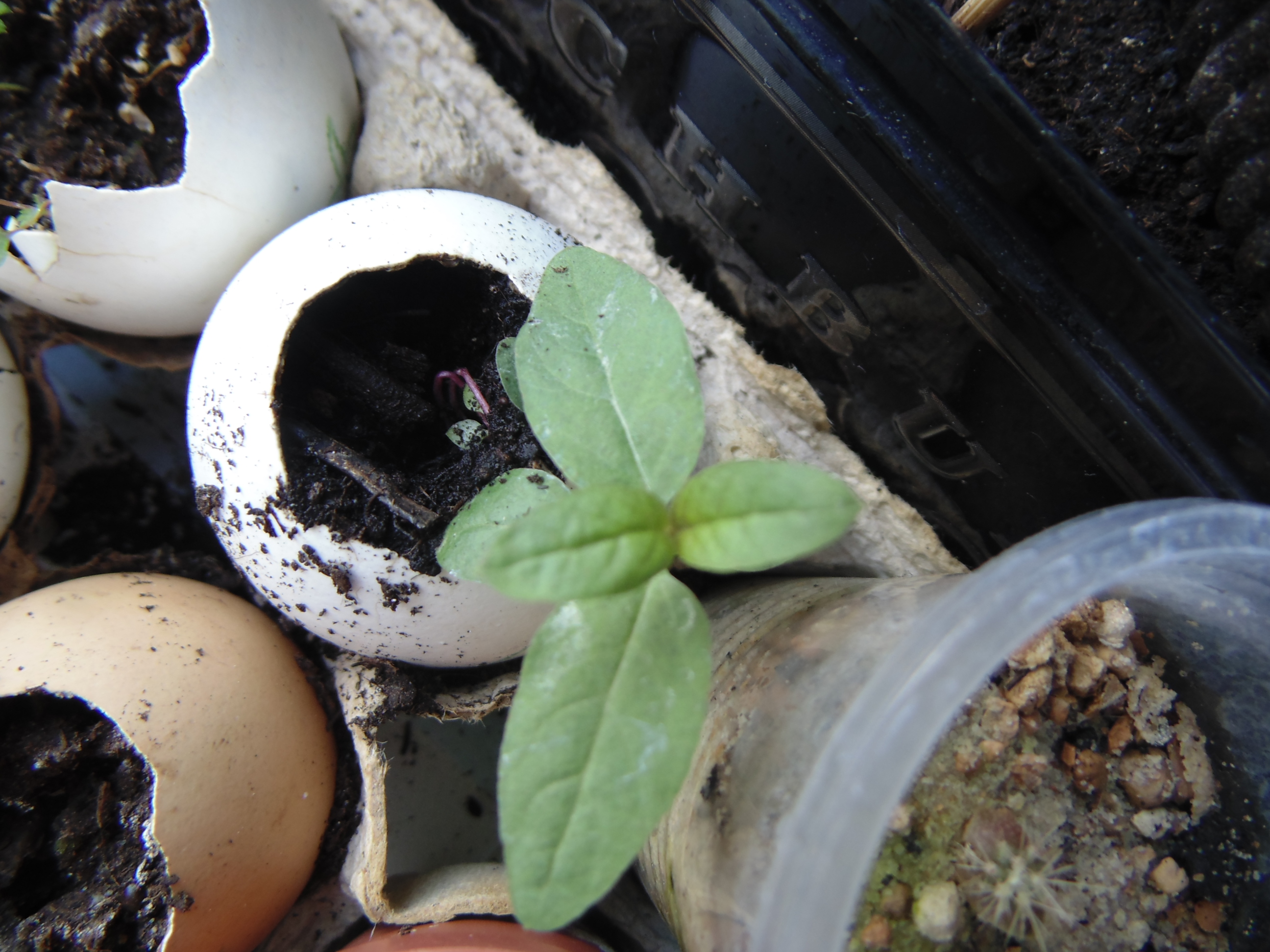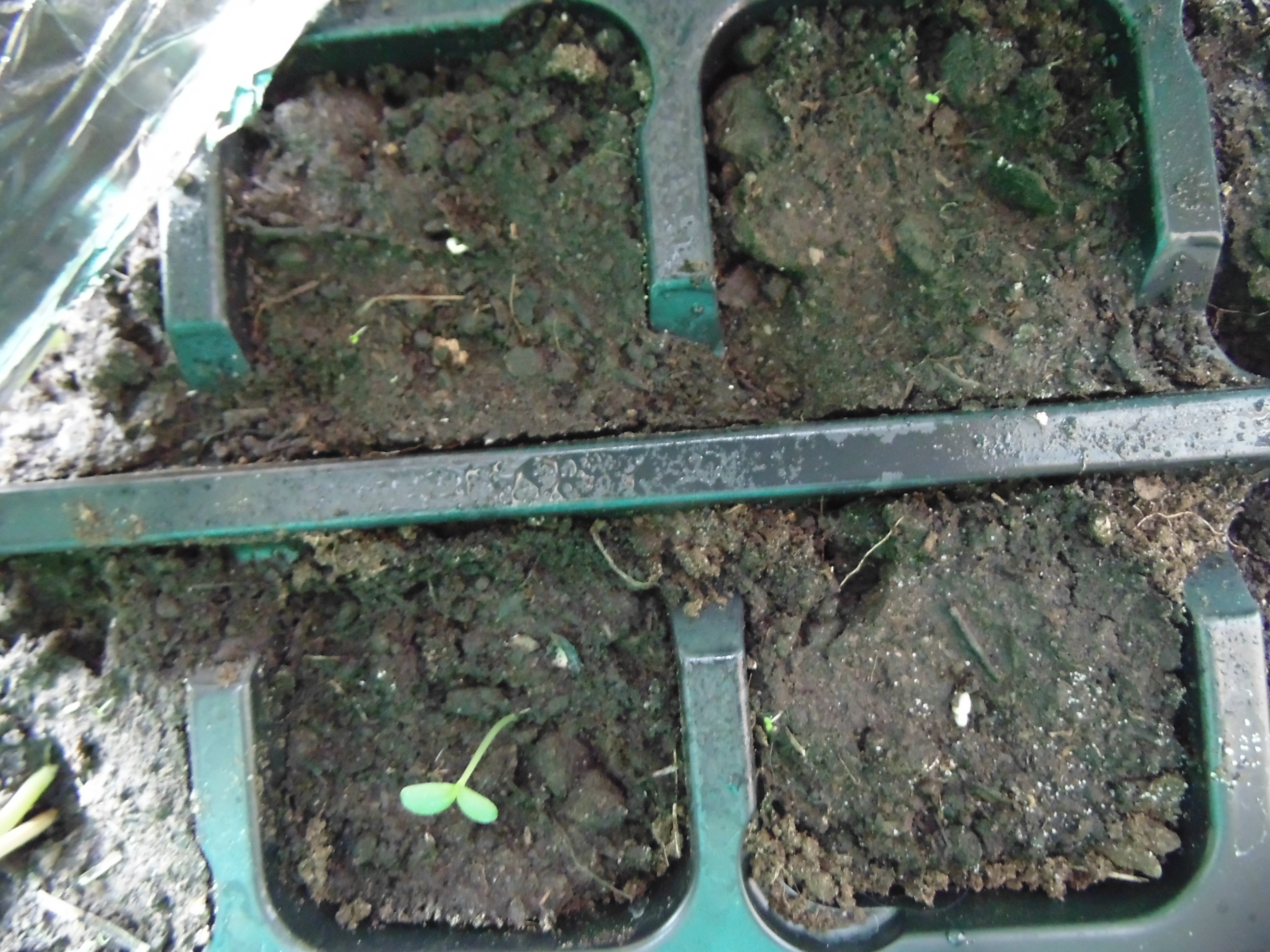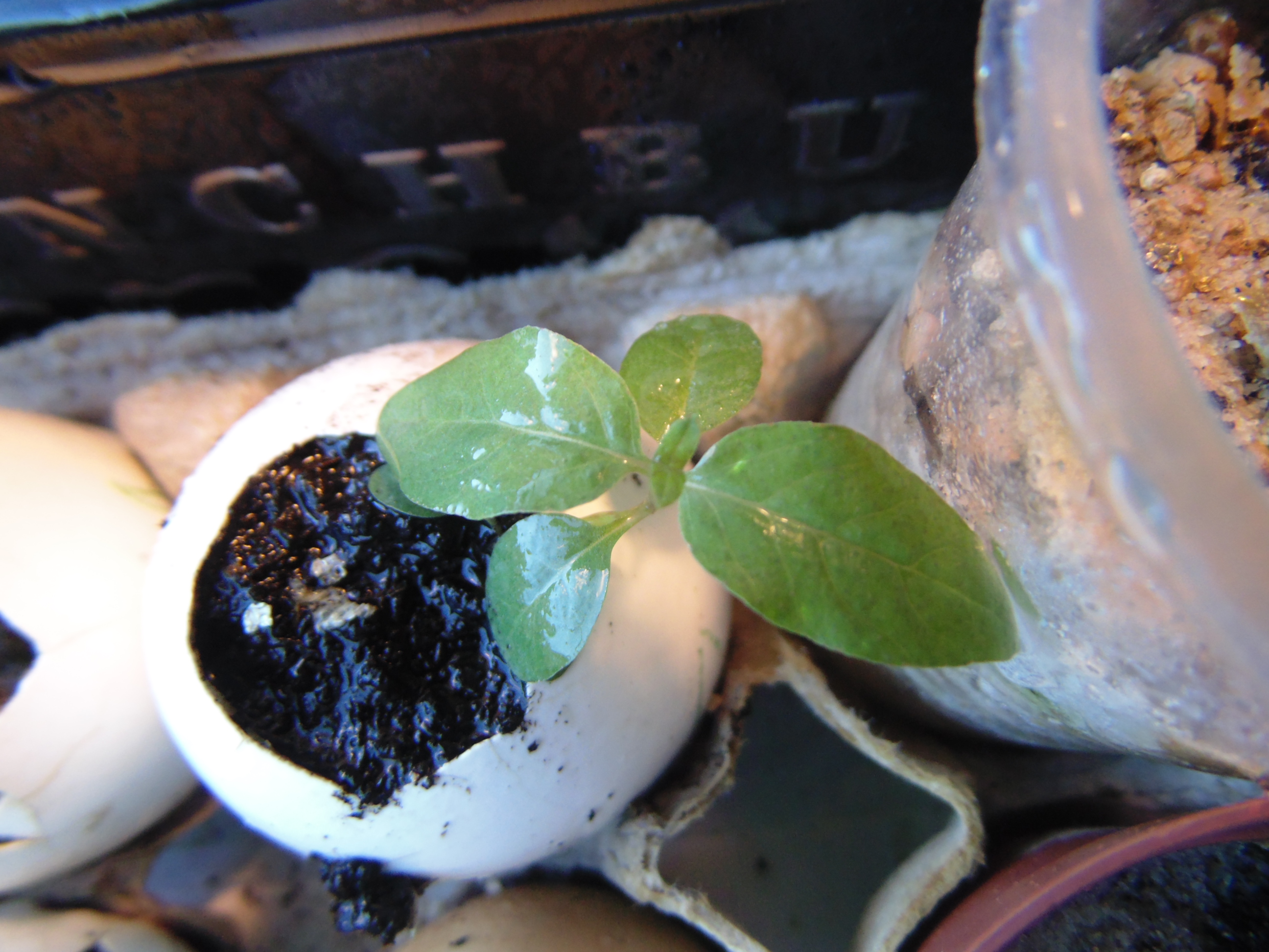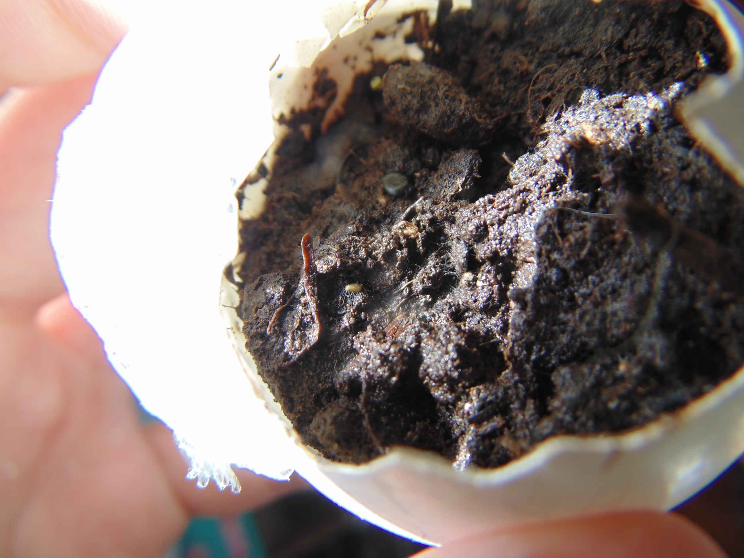 Заметил только когда постил. "Да что-то же взошло!" Учитывая, что грунт попался дерьмовый, это может быть и не земляника. Но вроде и стебель прозрасный и листья по размеру семки. Расковырял скорлупу, поставил на солнышко.
