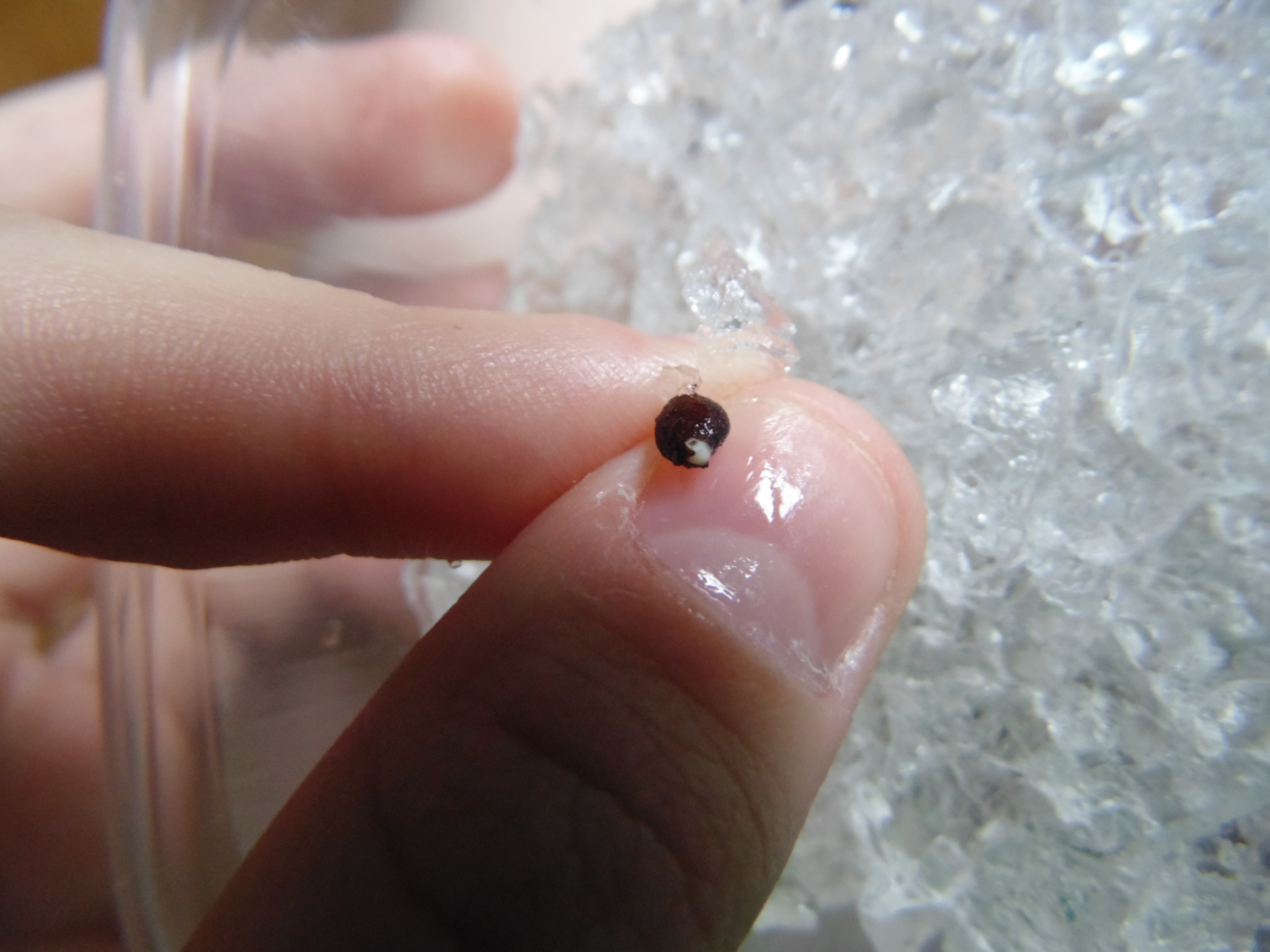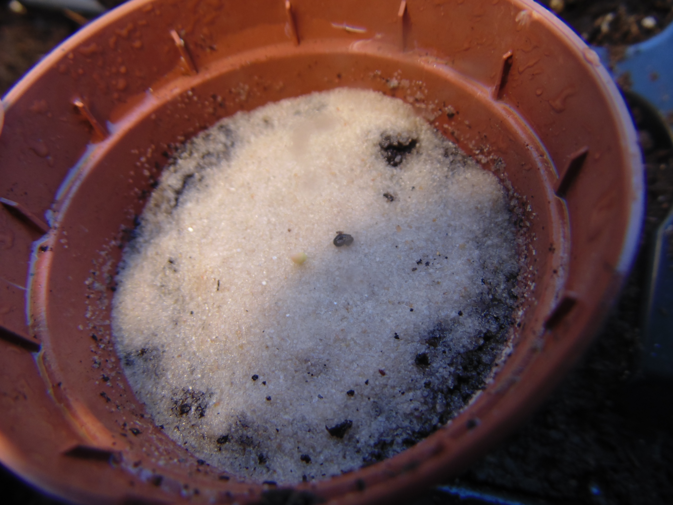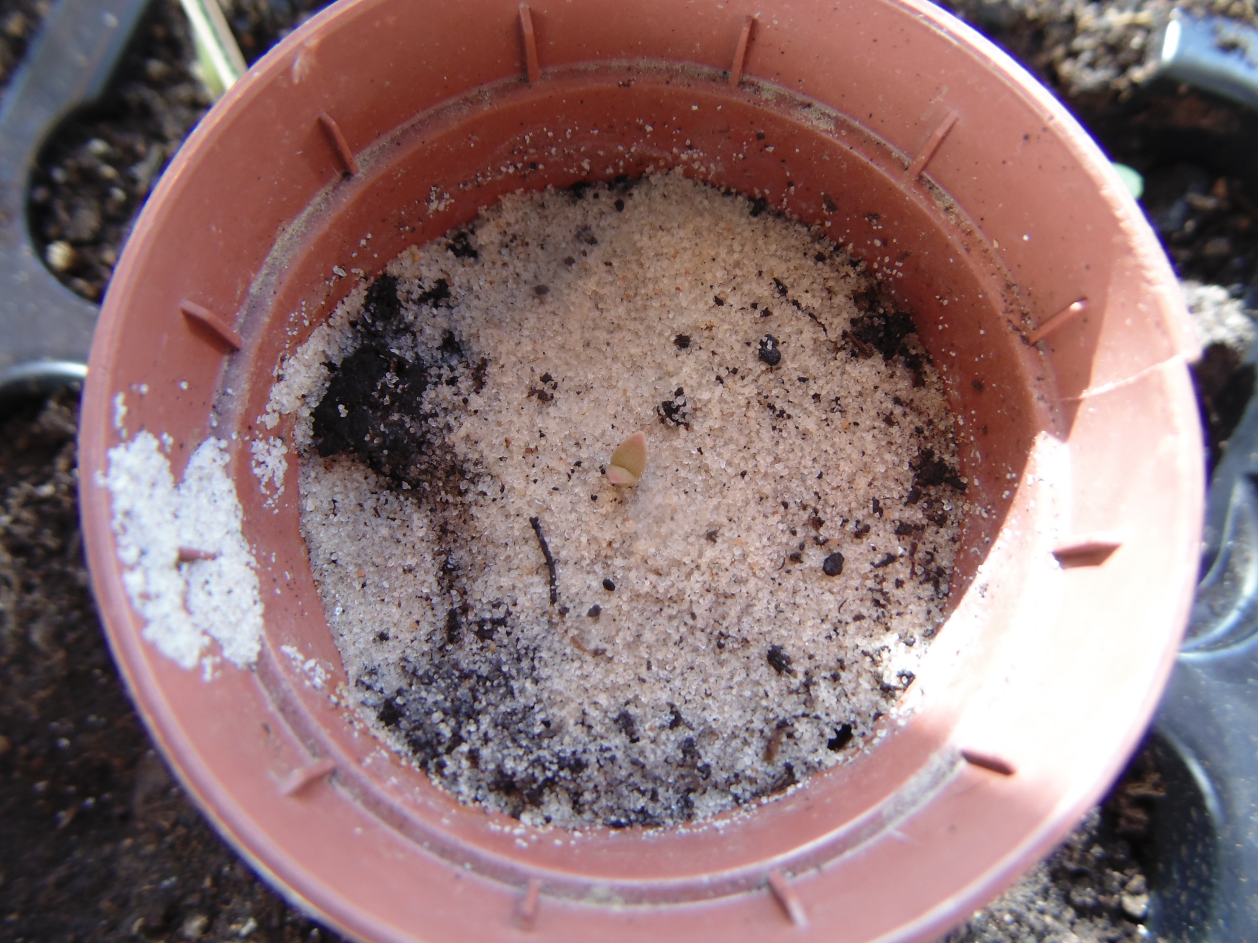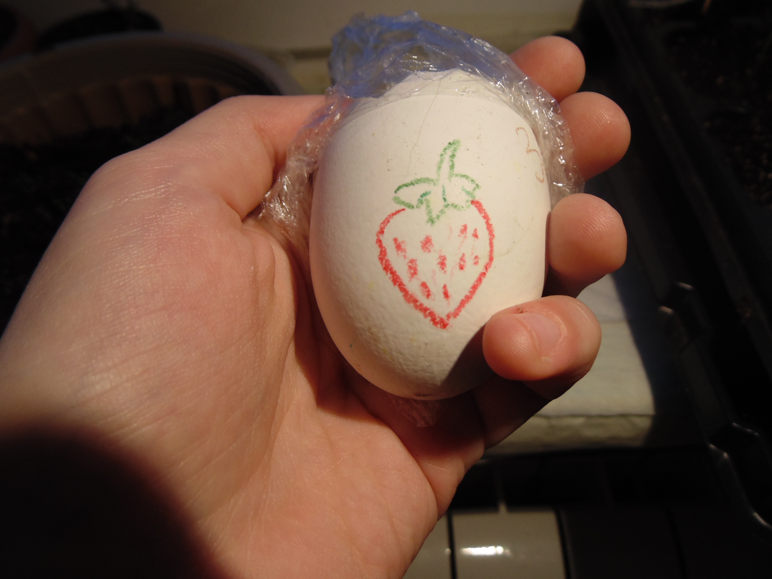 Заметил только когда постил. "Да что-то же взошло!" Учитывая, что грунт попался дерьмовый, это может быть и не земляника. Но вроде и стебель прозрасный и листья по размеру семки. Расковырял скорлупу, поставил на солнышко.