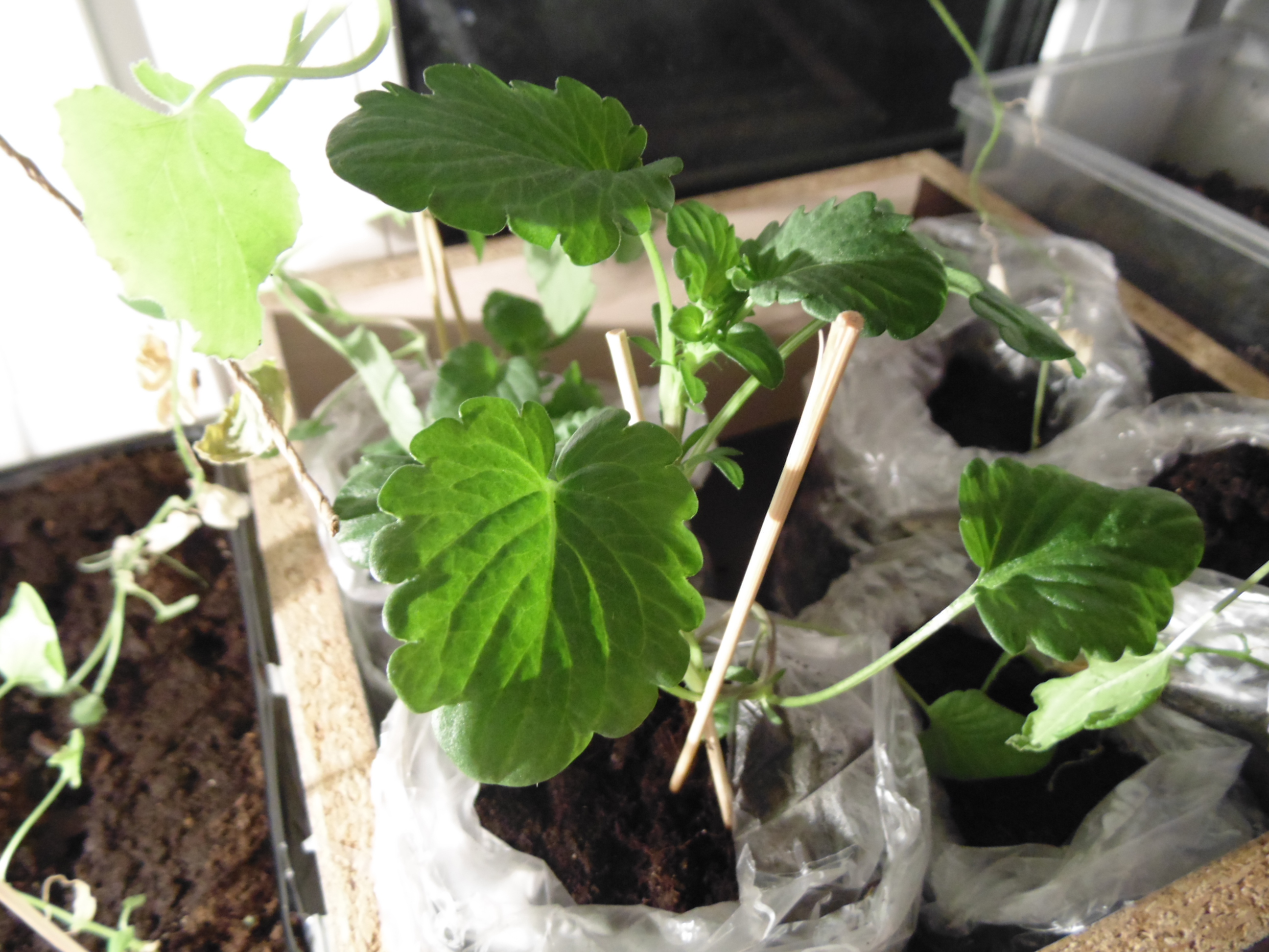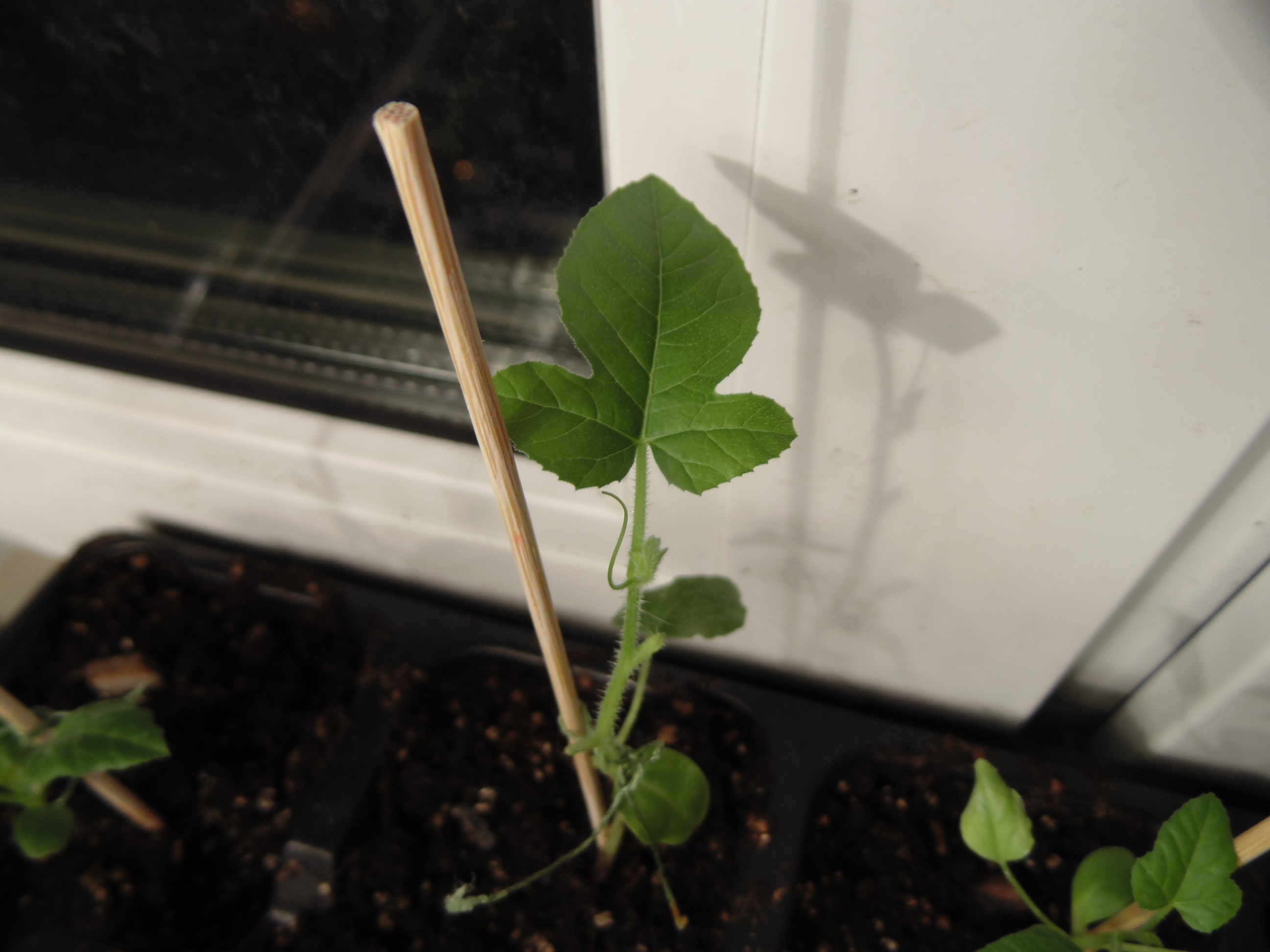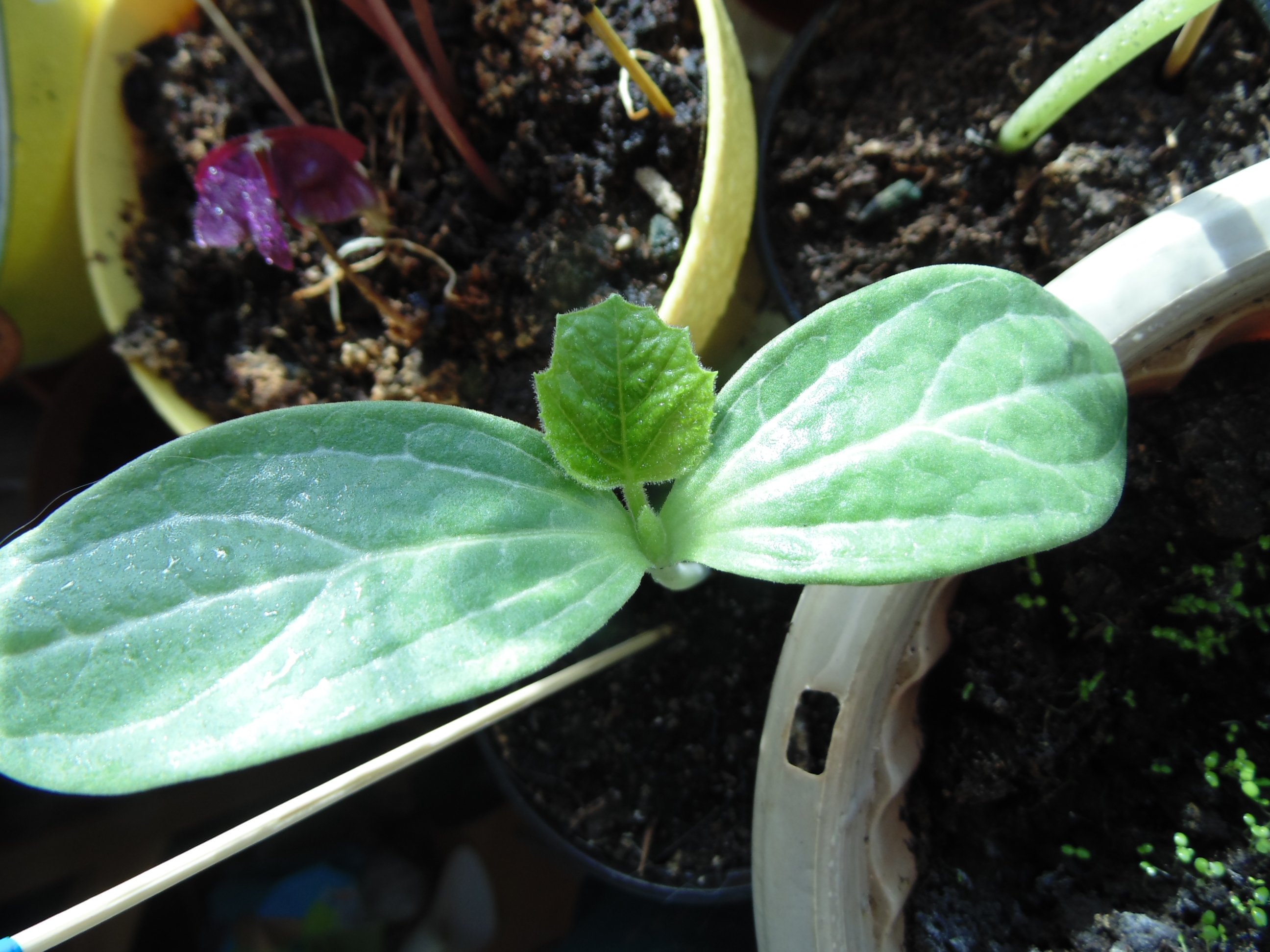 Лагенарии пускаются в рост. Первая уже выпустила вторую пару усов и начинает отращивать новые листья под сломанными, вторая - избавилась от оболочки семки и выпустила первую пару настоящих.