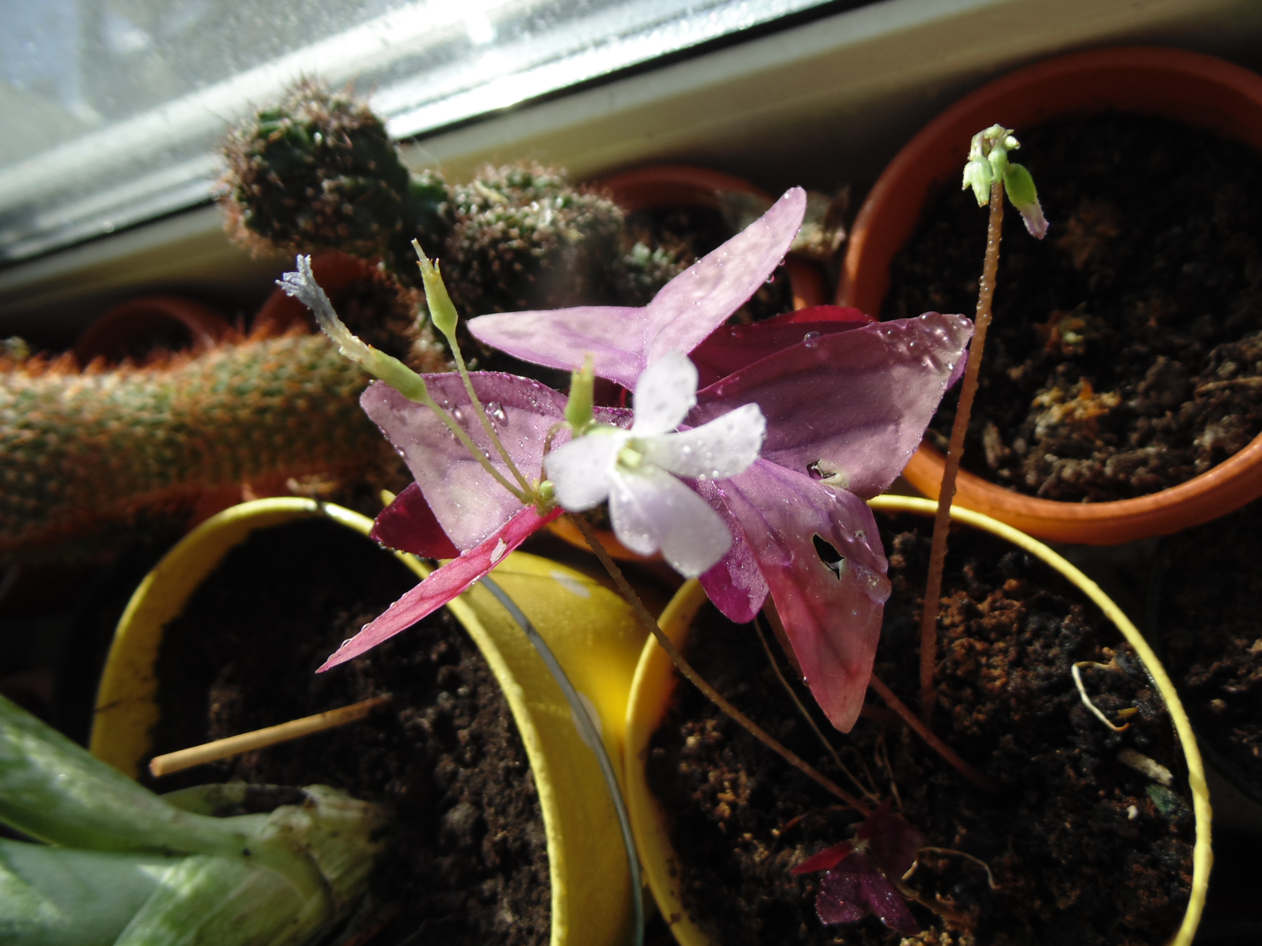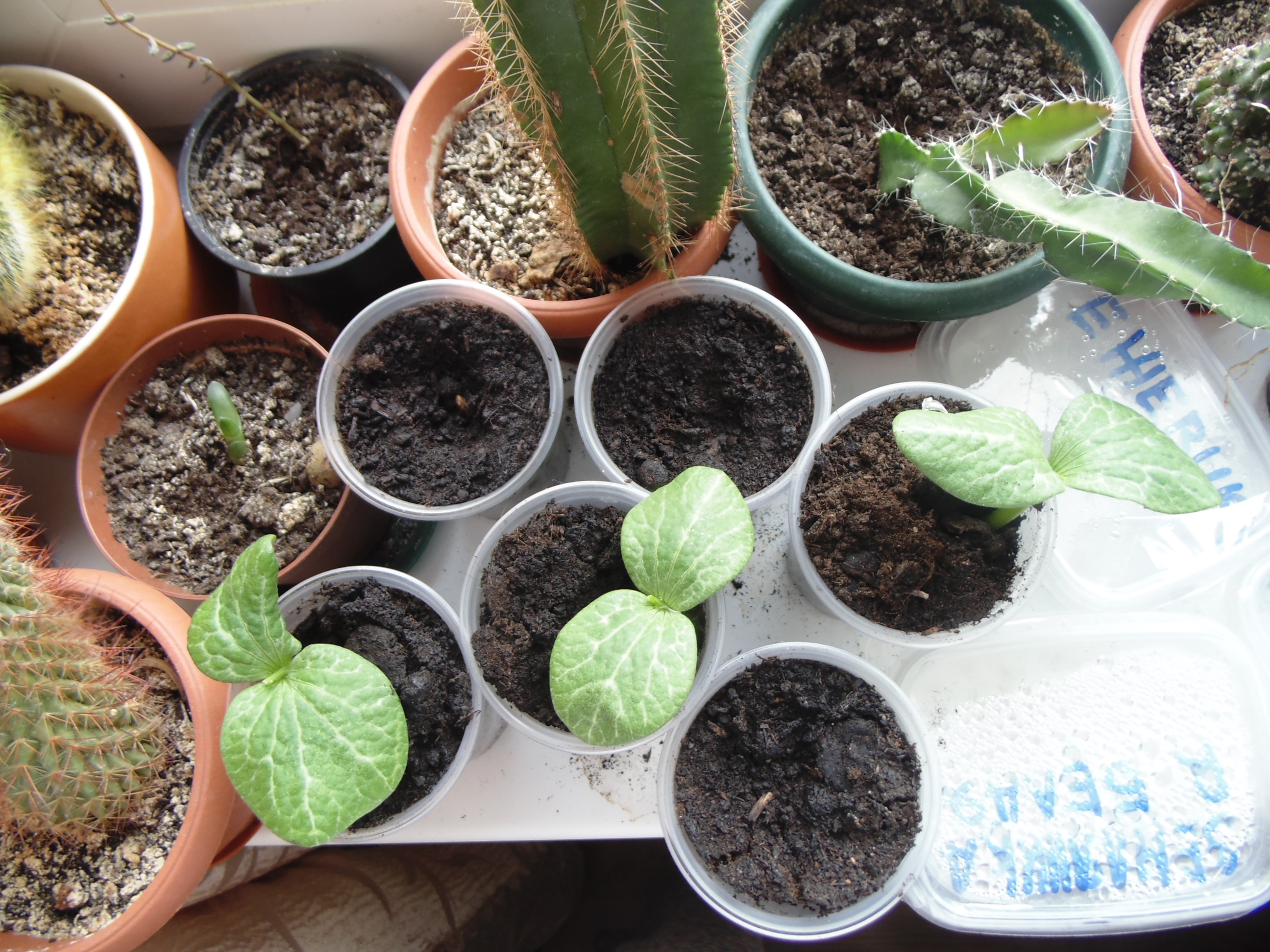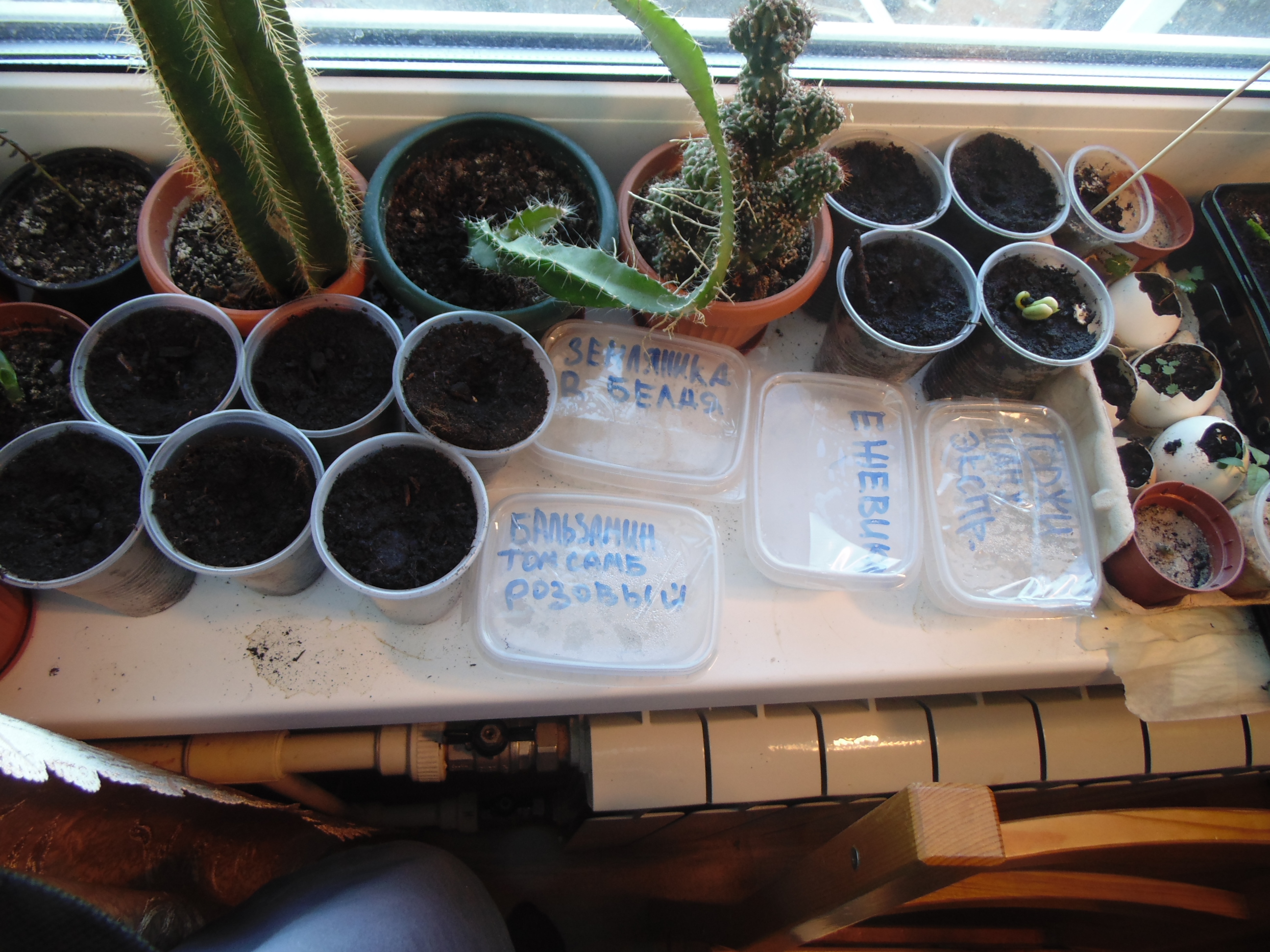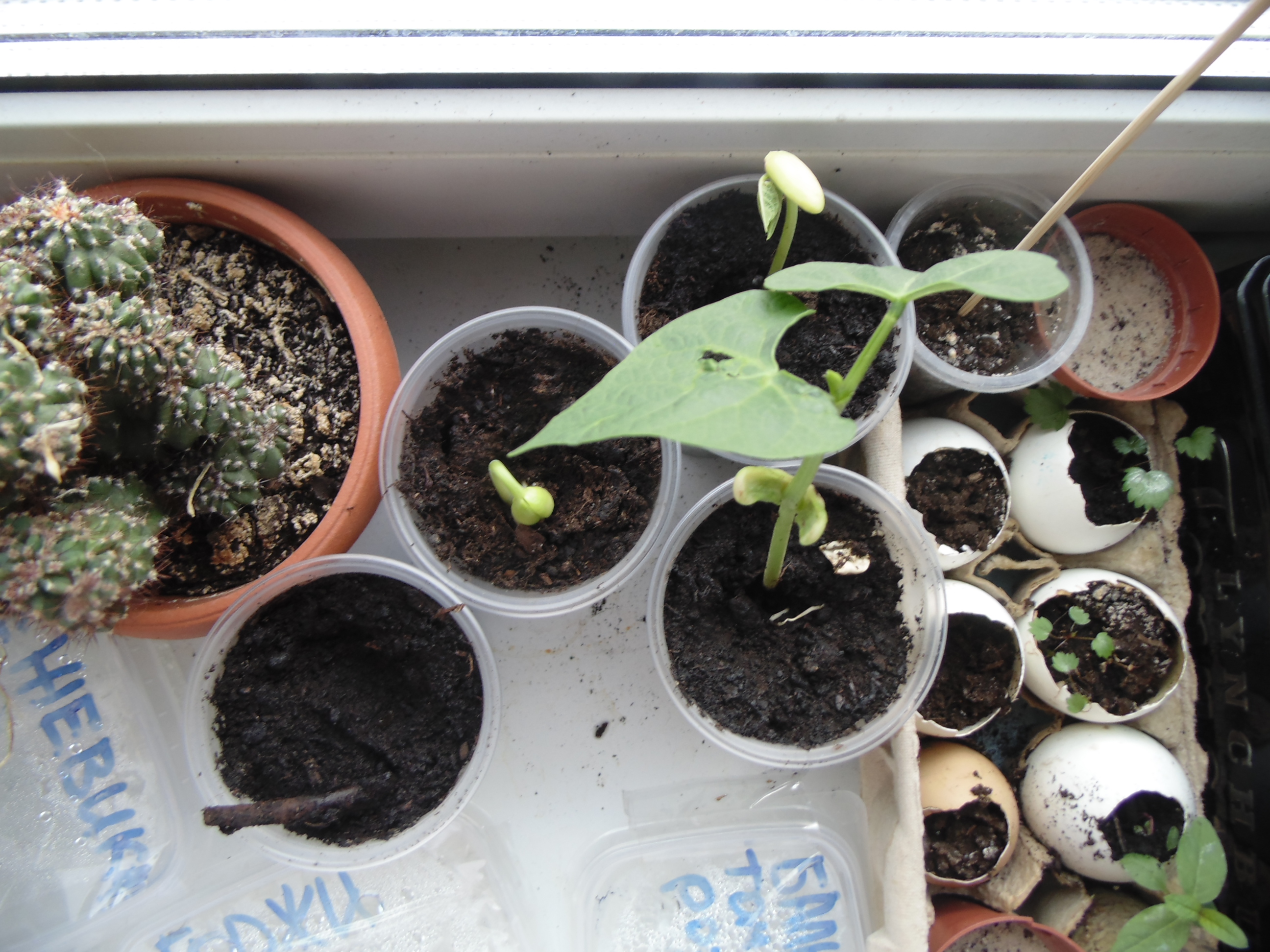 Денек сегодня выдался на редкость солнечным. Всё растёт и оживает. Взошел маленький огуречик, спаржефасоль начала распускать листья Кактусёнок прекрасно себя чувствует в песке. В огурцах взошла непонятная красная мохнатая трава. Пересадил, посмотрю, что будет. Зацвела после зимовки кислица