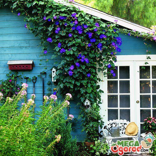 Анон натолкнул на мысль о девичьем винограде. В продаже еще нема рынки не открылись но обещают завезти. В арсенале сейчас есть вьюны на мотив ипомеи. (пикрил). Можно будет пустить пару кустов между этим самым невзрачно цветущим виноградом. Летом будут цветочки, осенью - красные листья.
