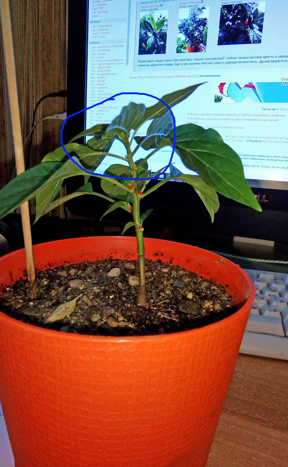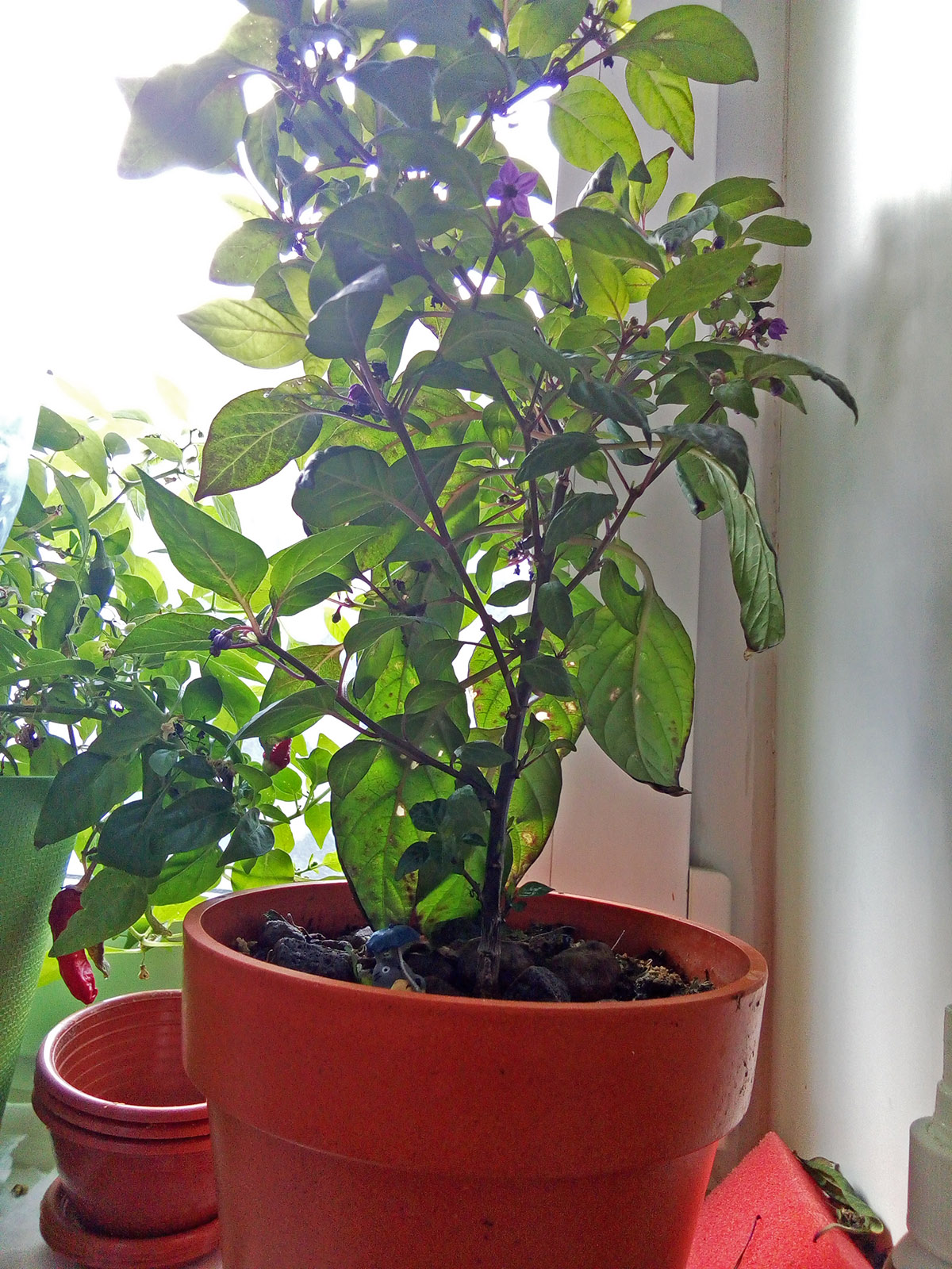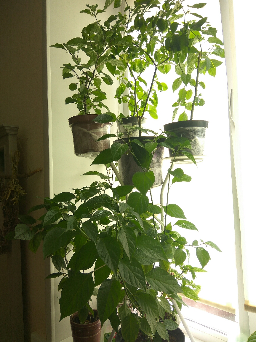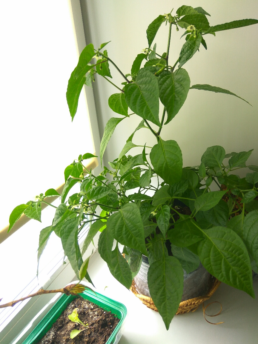Похвастаюсь заодно своим ёба-монстром "черной жемчужиной". Сейчас начала активно цвести и завязываться, правда плоды маленькие, размером с горошину душистого перца. Еще у нее охуенно толстый ствол и хорошая ветвистость. Думаю вырастить еще одну под "бончи".