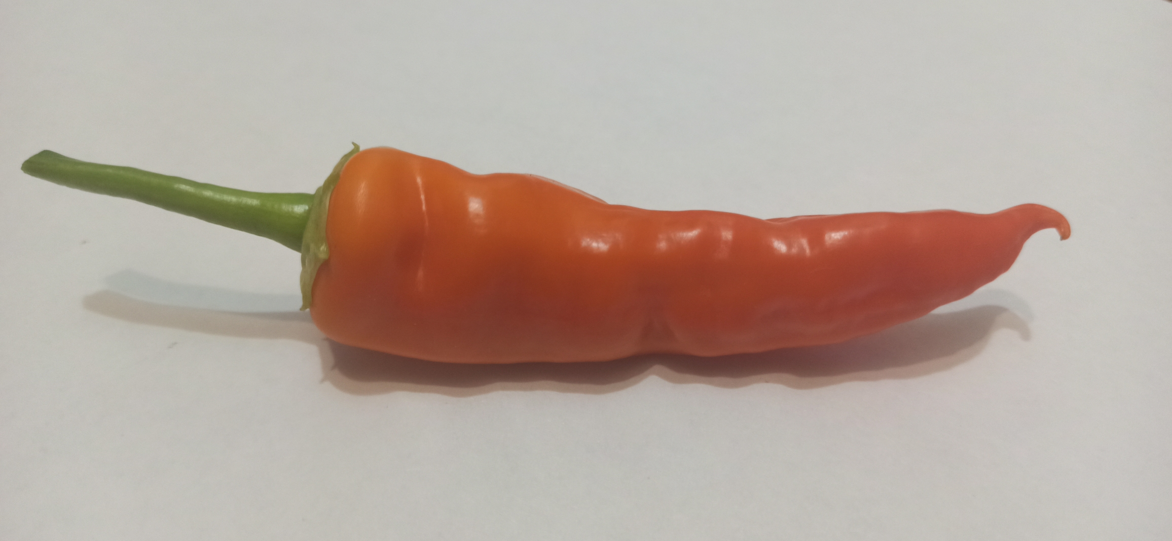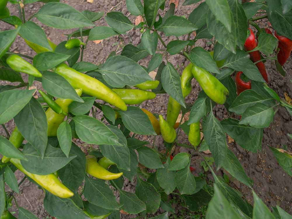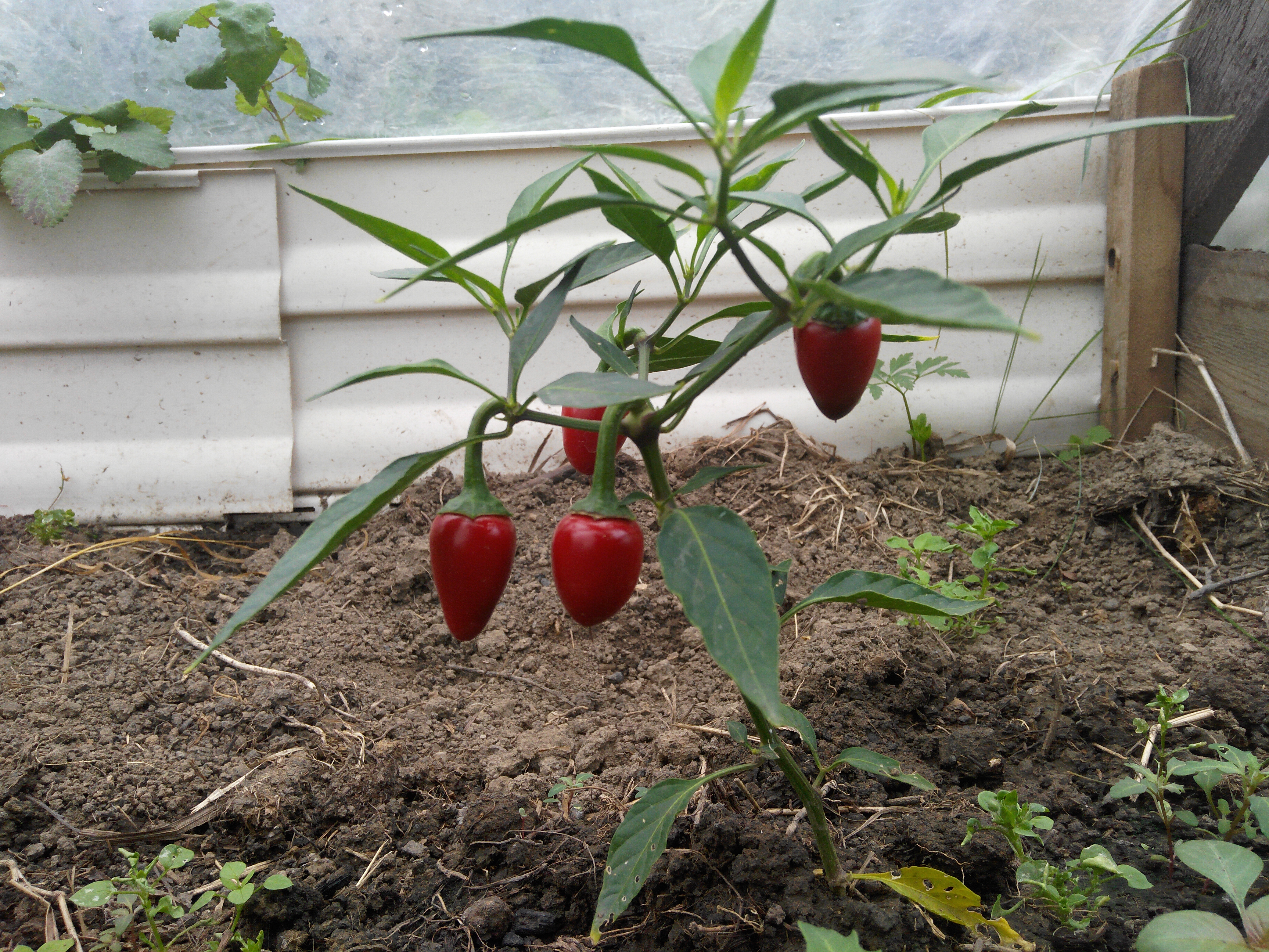 Острый перец каким-то образом опылился от обычного сладкого, и получилась пара штук вот таких крупных и красных. Скорее всего они тоже острые, ещё не пробовал.