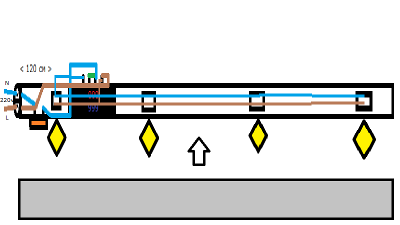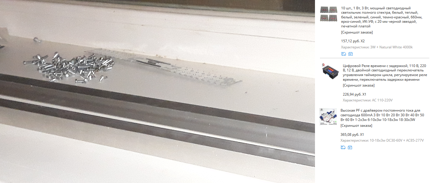 Алюминиевый профиль в качестве каркаса. Можно что-то еще придумать, но имхо вполне легкий и надежный. Обычные патроны под E27 цоколь. Лампы - бытовые LED, я взял 20 ватт, температура - нейтральный 4000К. Для контроля циклов день/ночь взял дешевое реле времени с али, до 999 секунд/минут/часов. Четырехпиновый выключатель с подсветочкой оттуда же. Ну и еще рассеиватель для ленты взял, т.к. окно с растихами рядом с пекой и без него было бы неприятно глазкам. Цепь простая оче, пикрил.