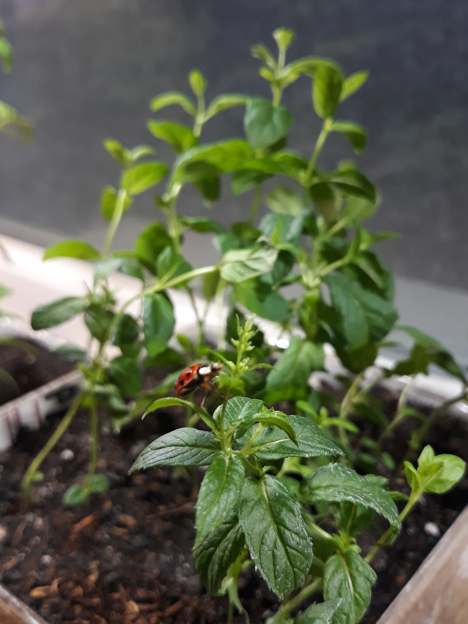 Вчера увидел на мяте тлю, плотно так. Взял горсть табака и сжёг, вроде все растихи продымил. А сегодня смотрю, оказывается по мяте ползает вот эта няша. Здорово, повезло мне, пусть ест их остатки.