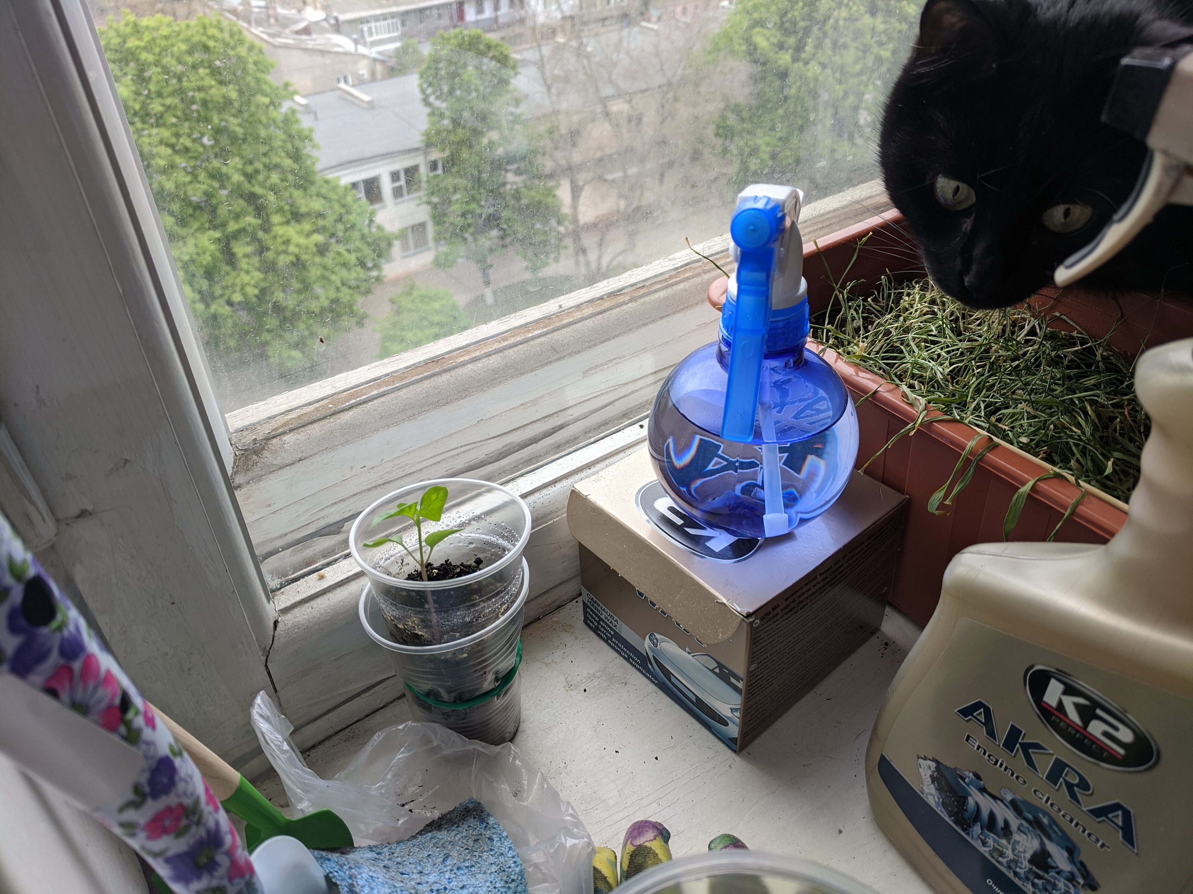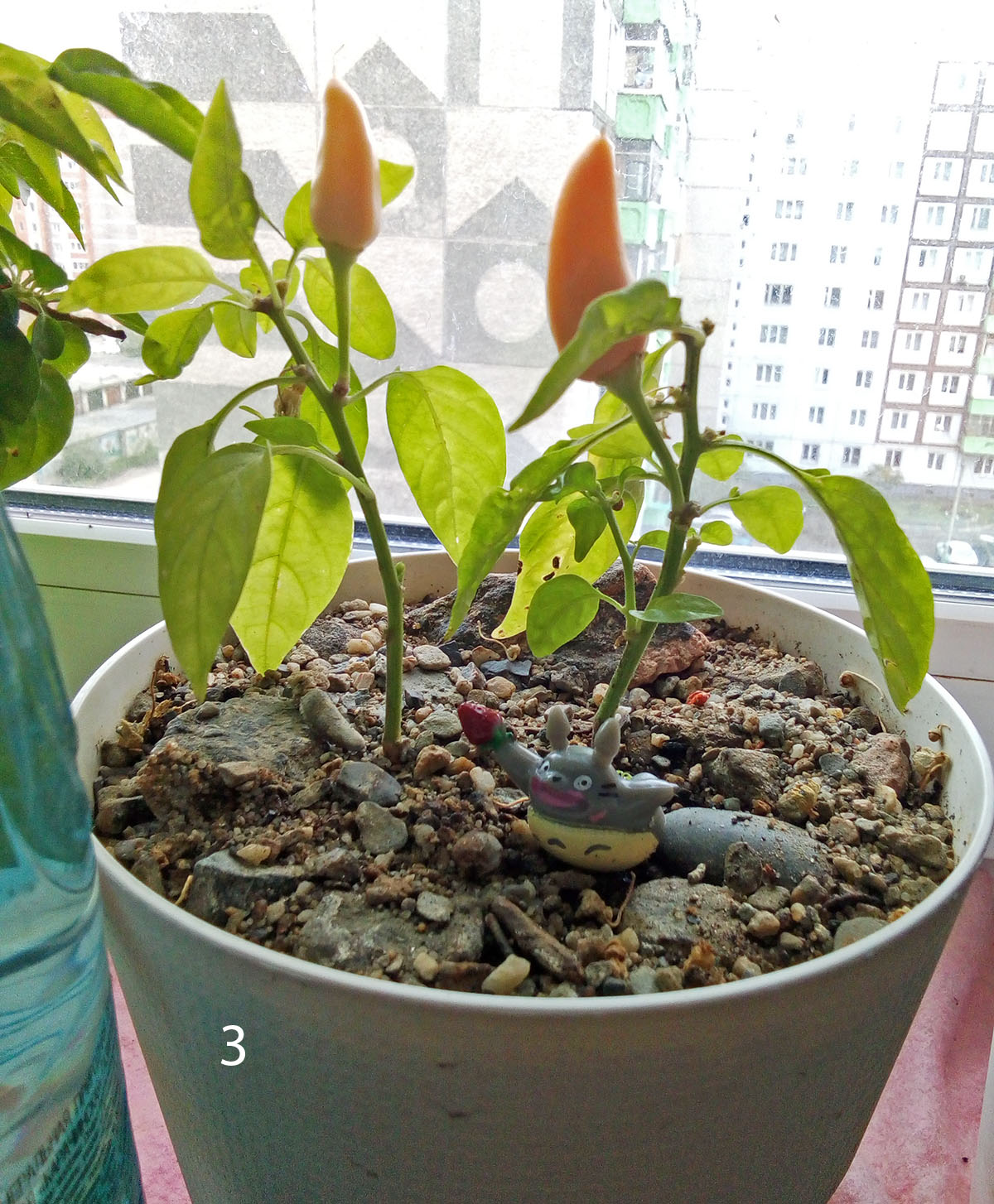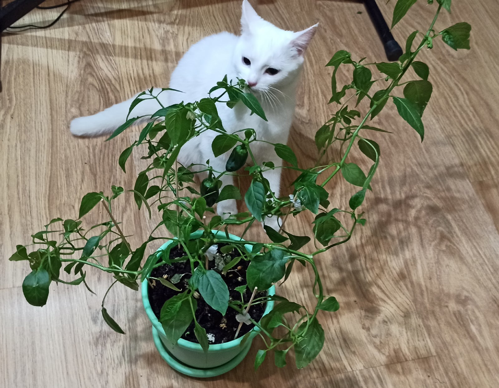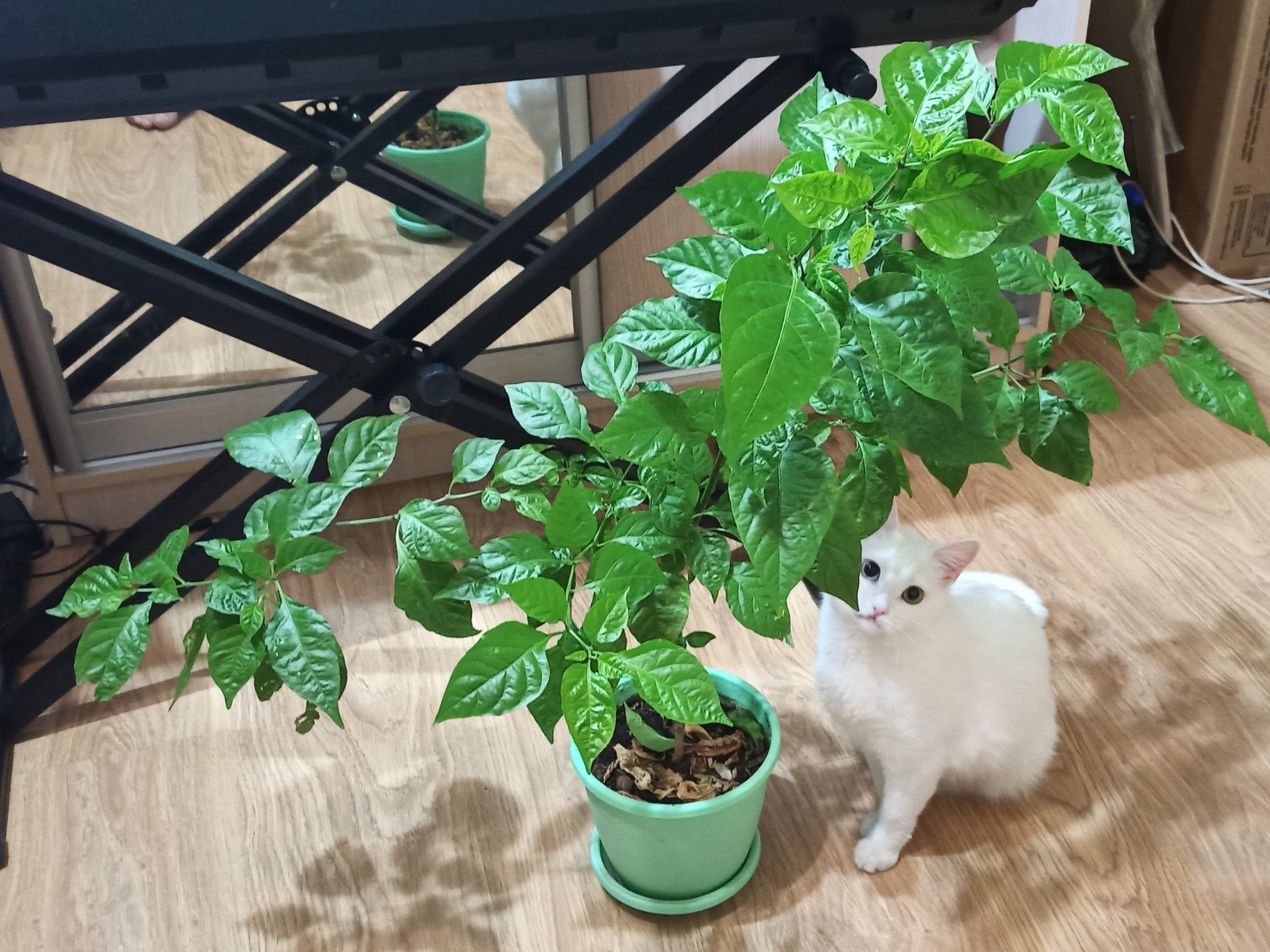 А ещё я в очередной раз советую убрать нафиг зелень для кошки в другое место, чтоб она к перцам вообще не подходила! Желательно в другую комнату вообще. Иначе может опять съесть все твои перчики.