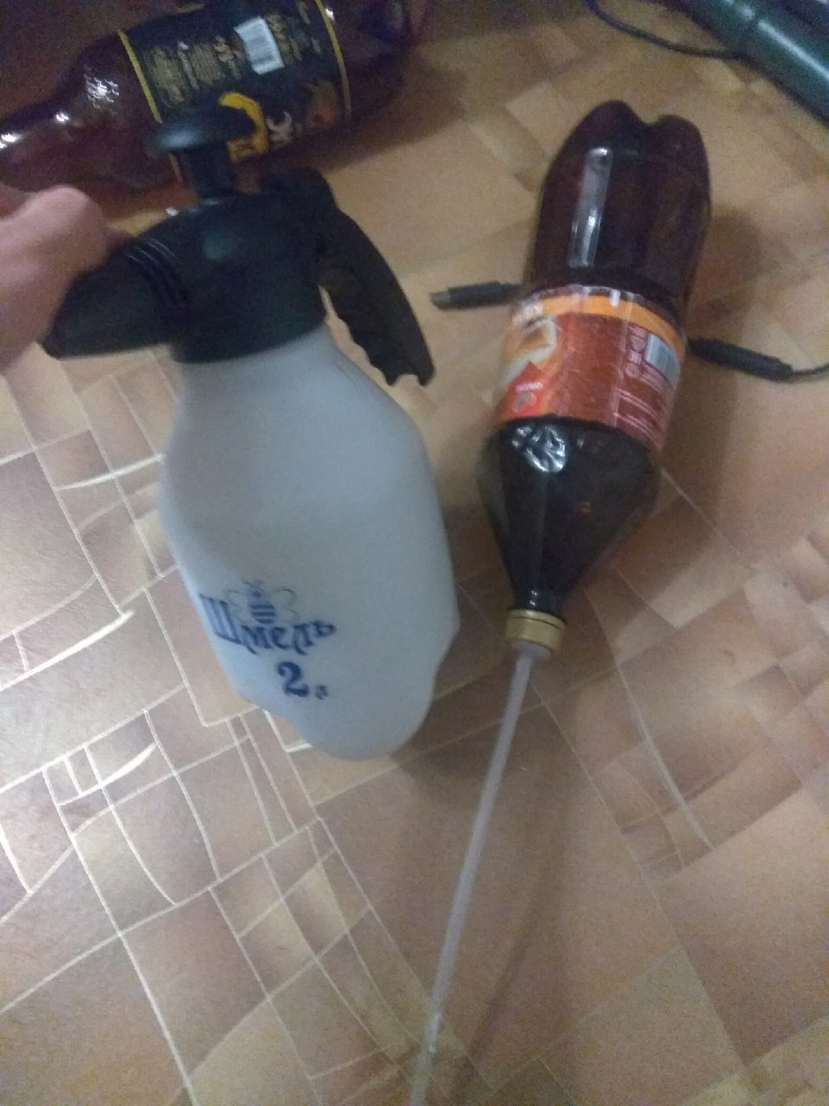 Справа - самоделка из трубки от пульверизатора и бутылки. Тупо в крышке делаешь отверстие и вставляешь туда трубку. Я ещё термоклеем замазал для герметичности. Не обязательно, но советую тоже так сделать. Оч удобно поливать большие перцы, у меня на каждый по литру аж уходит.
