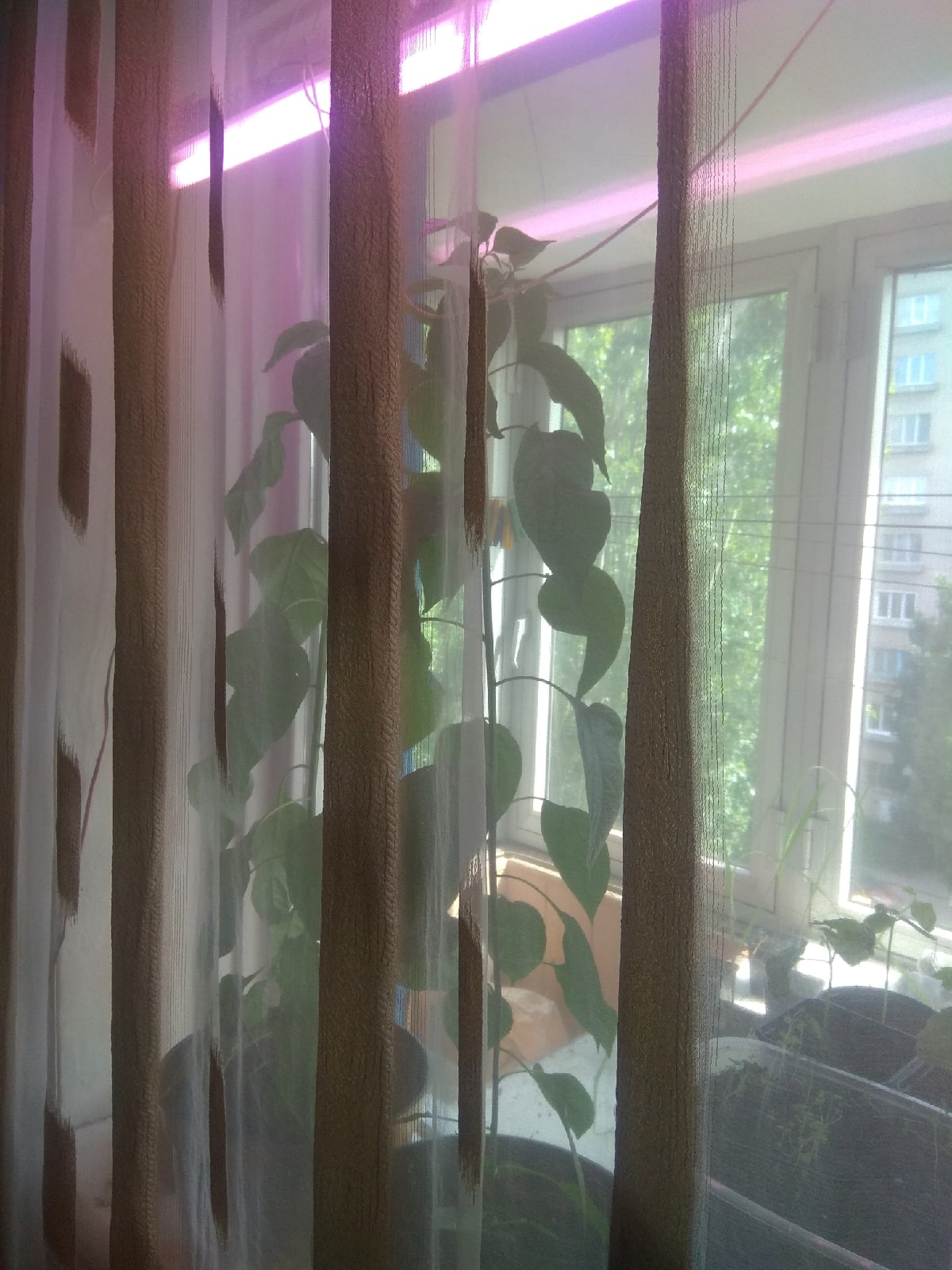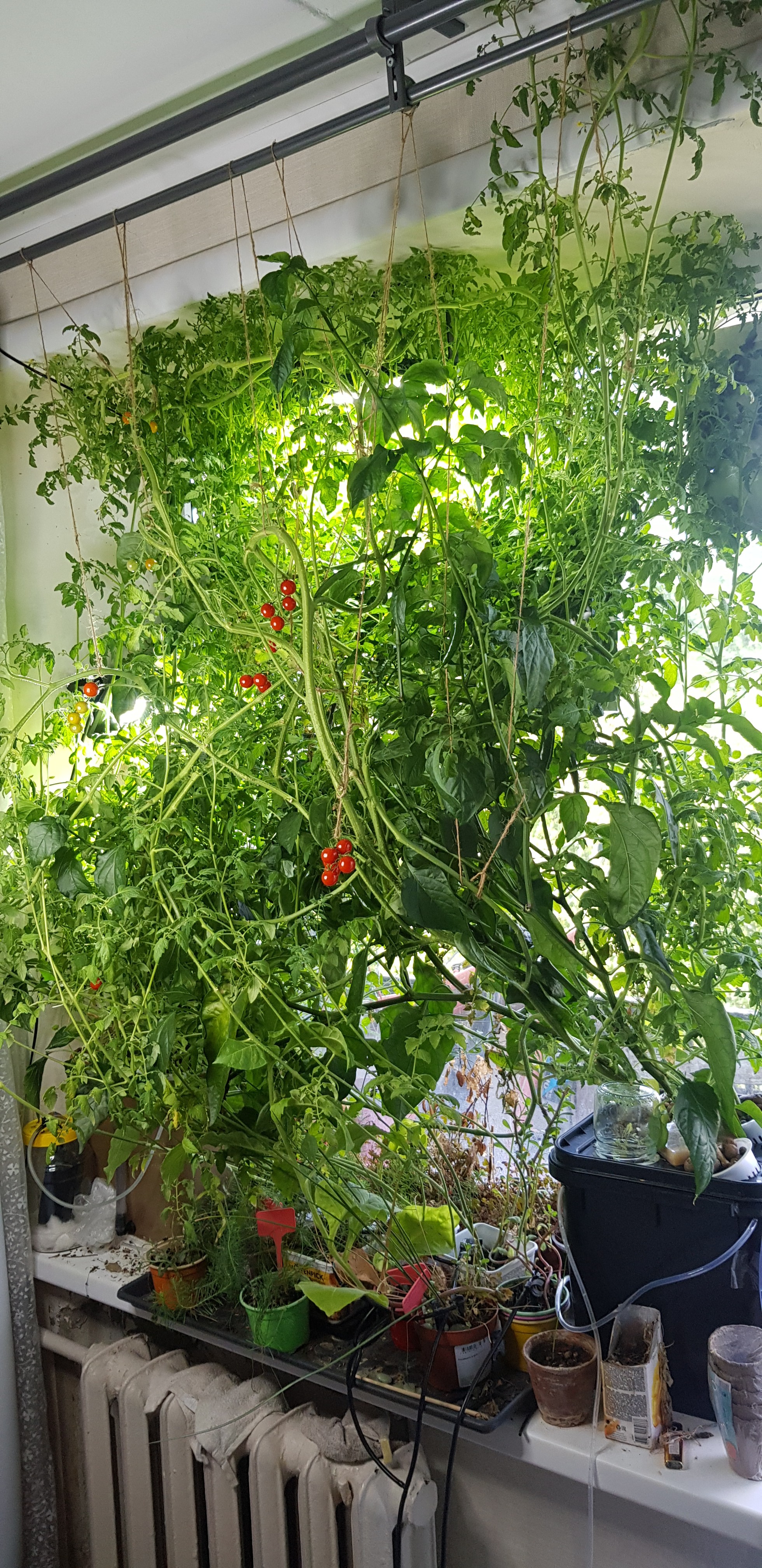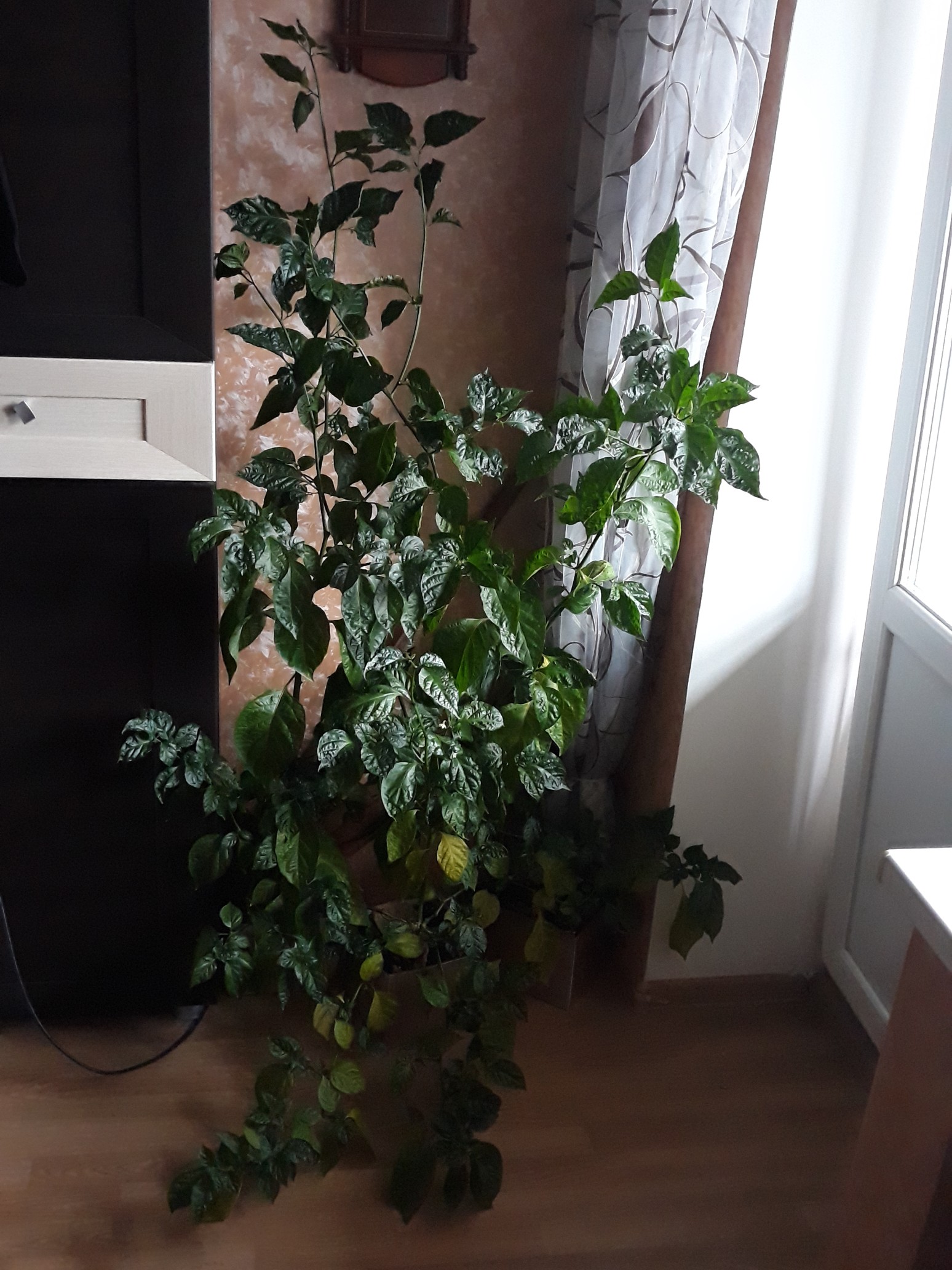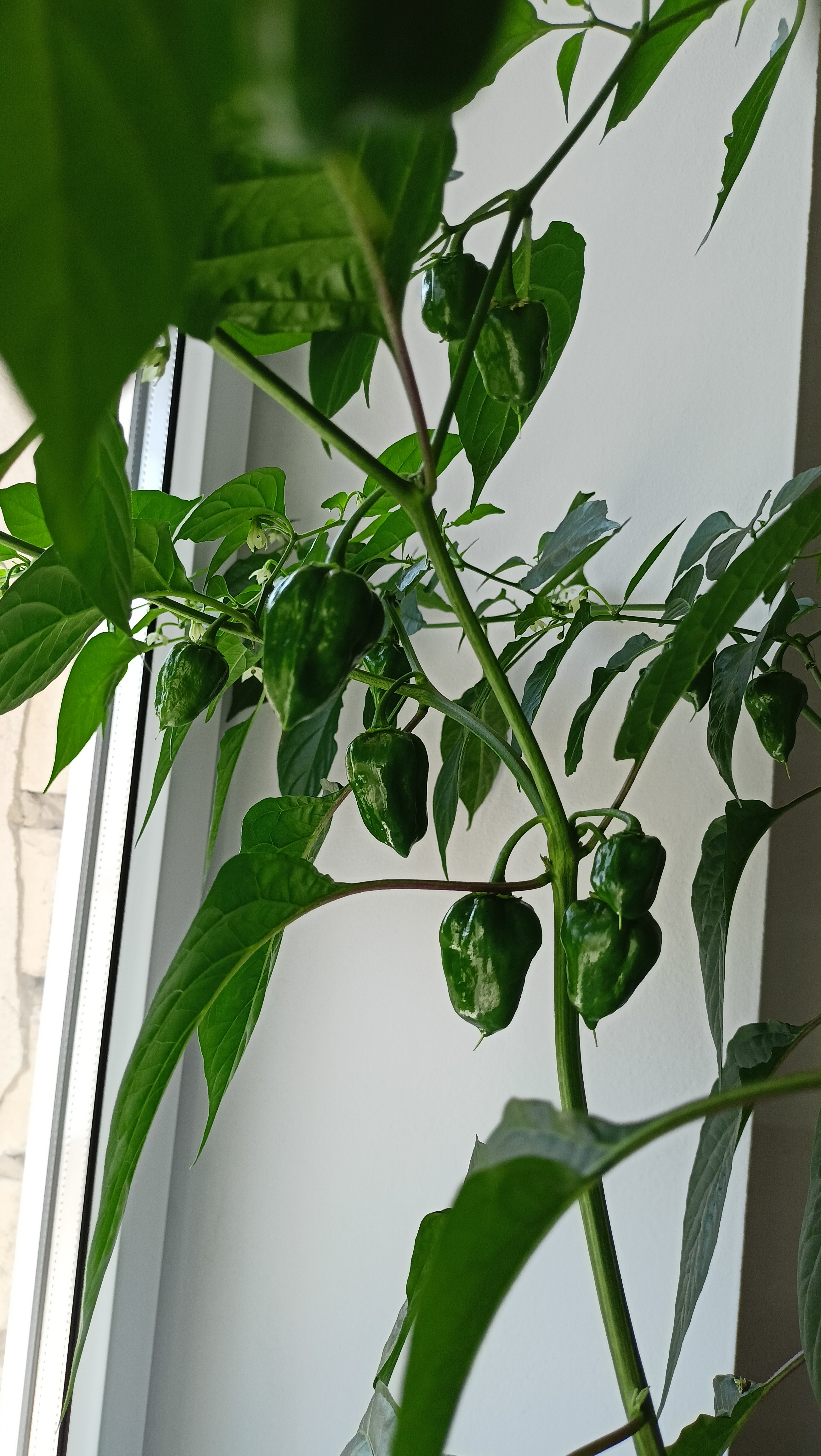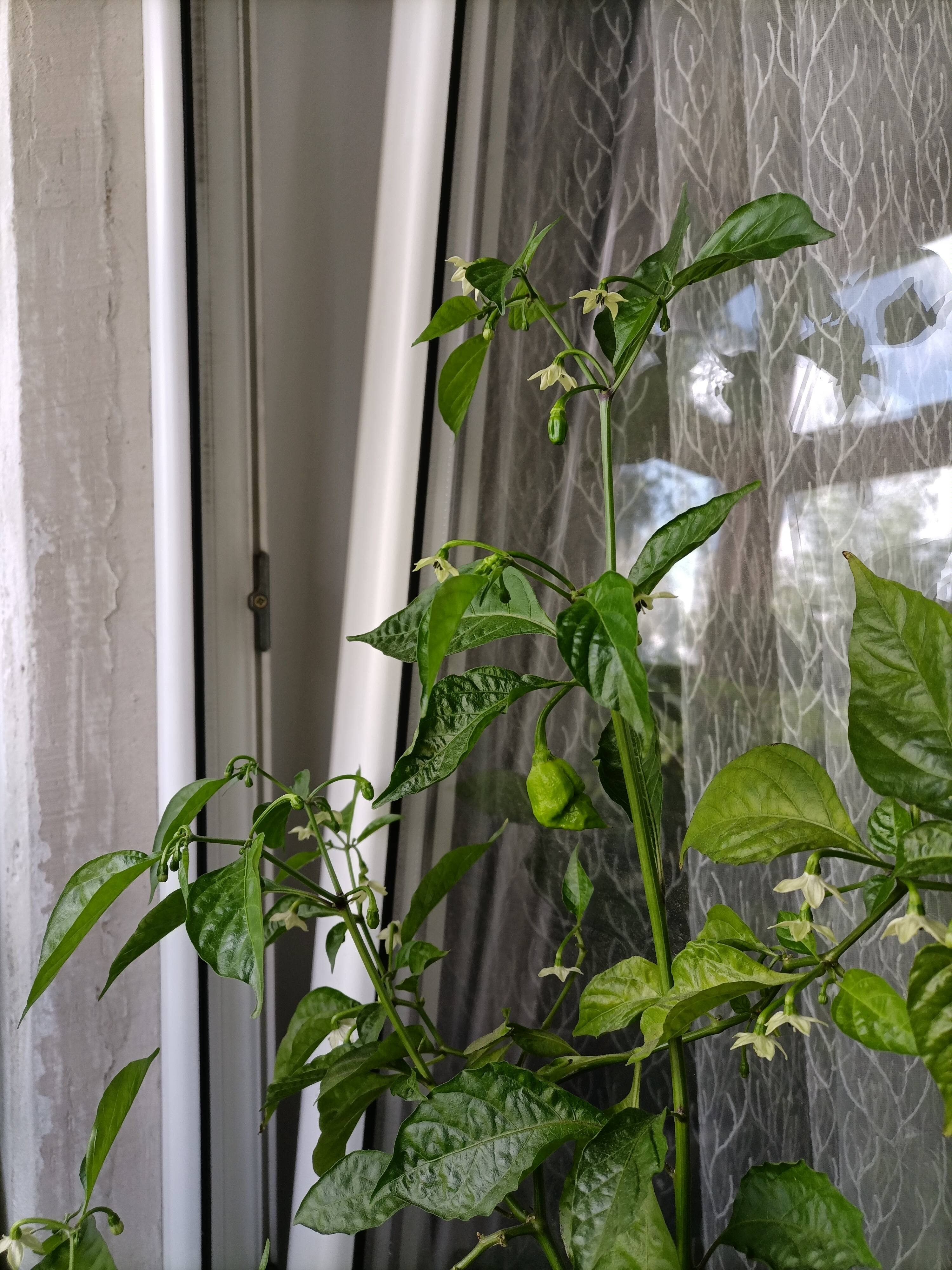 А дома один перец реально уже себя не держит, чисто на стекло лёг. Повернул его другой стороной, облокотил на висящую верёвку. Забыл прищипнуть, называется, понятия не имею, что теперь с ним делать вообще. На участке - халапеньо, дома - хабанеро. Хабанеро впервые выращиваю, не думал, что они реально вырастут такими высокими.