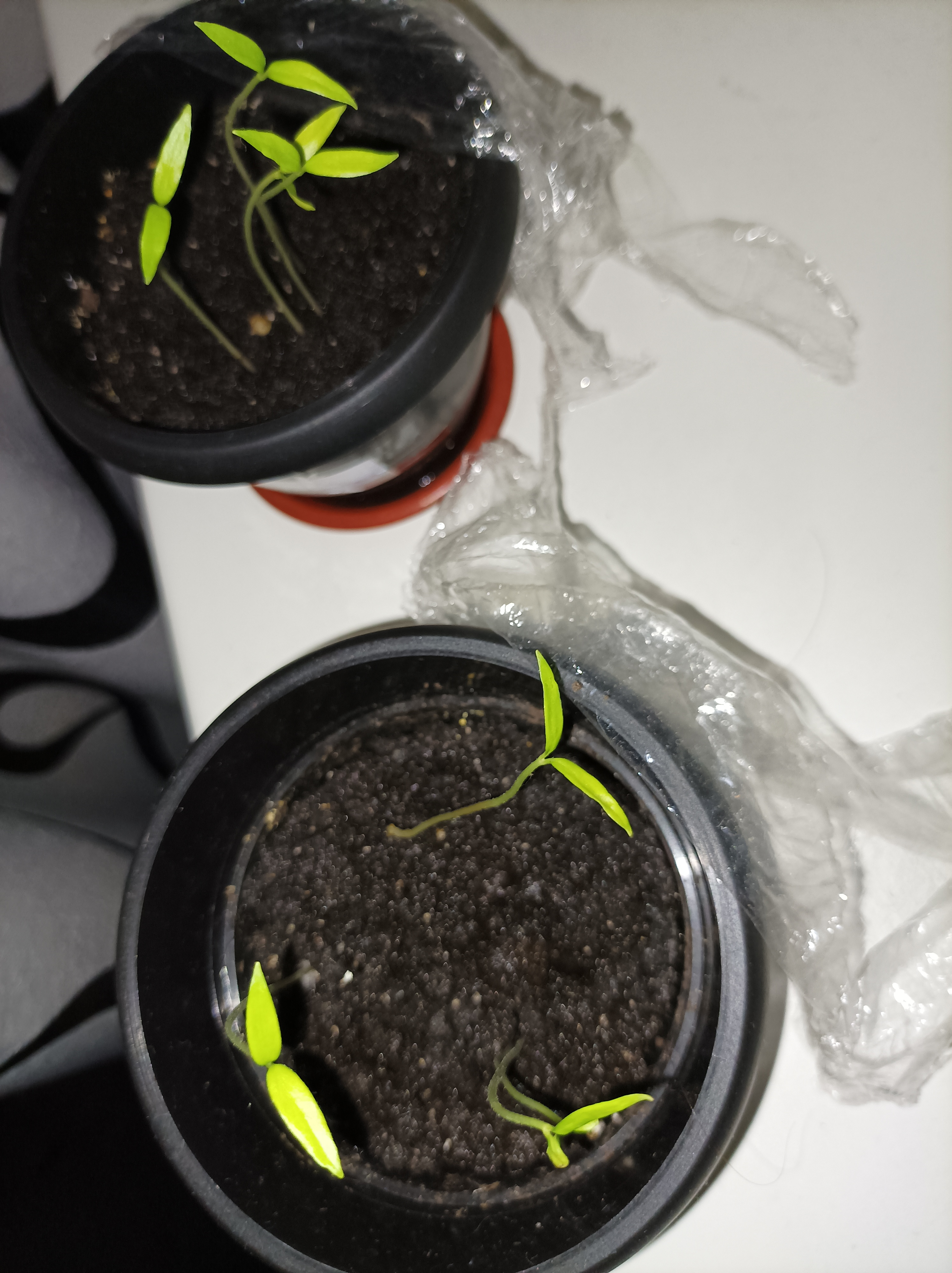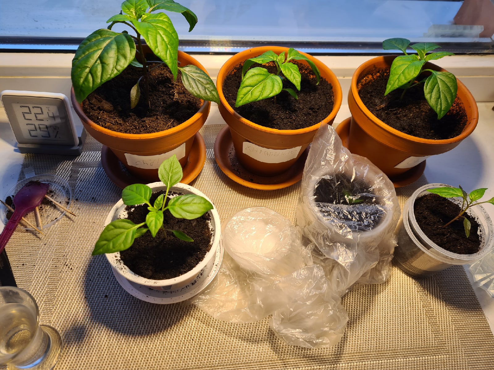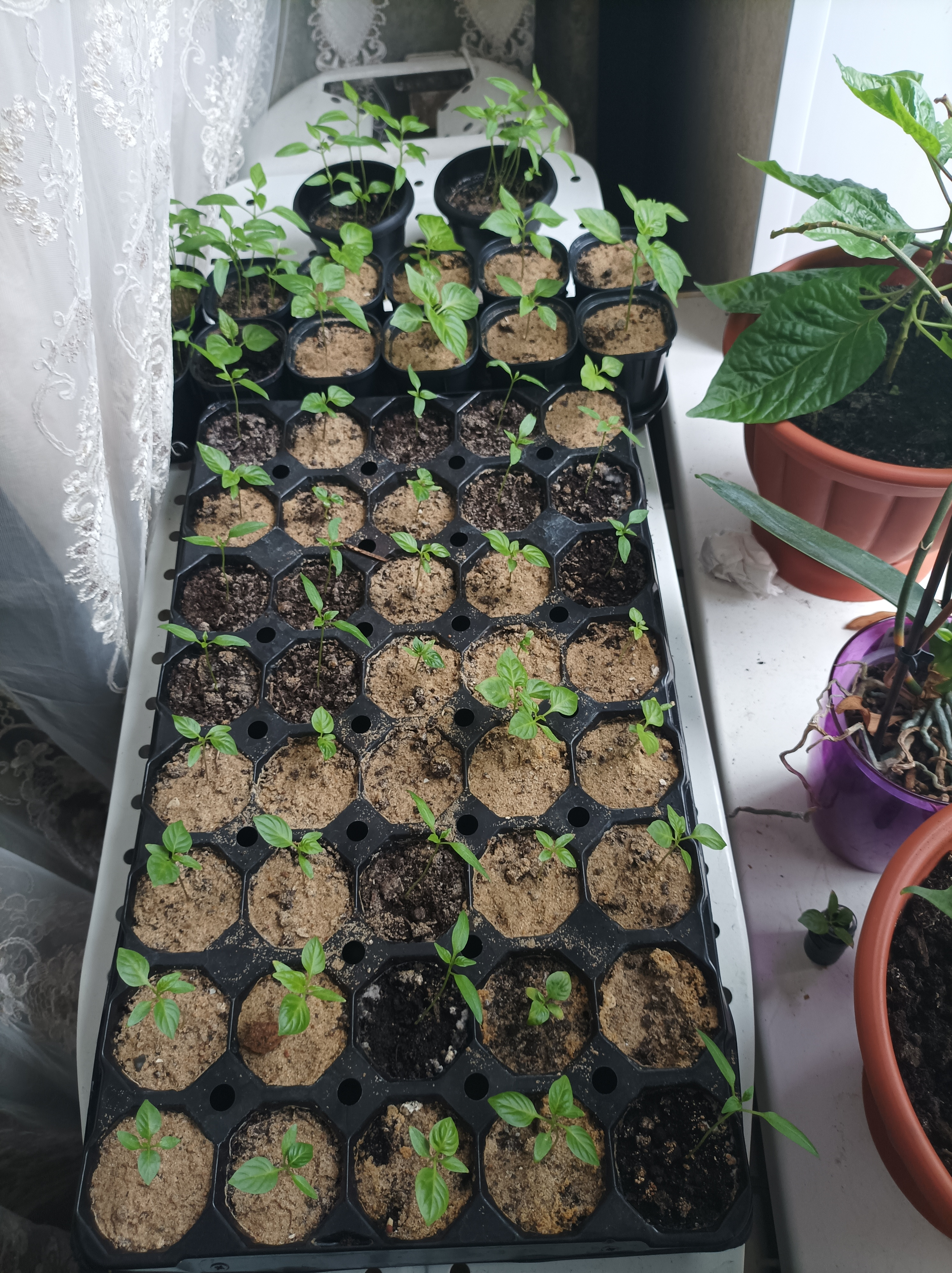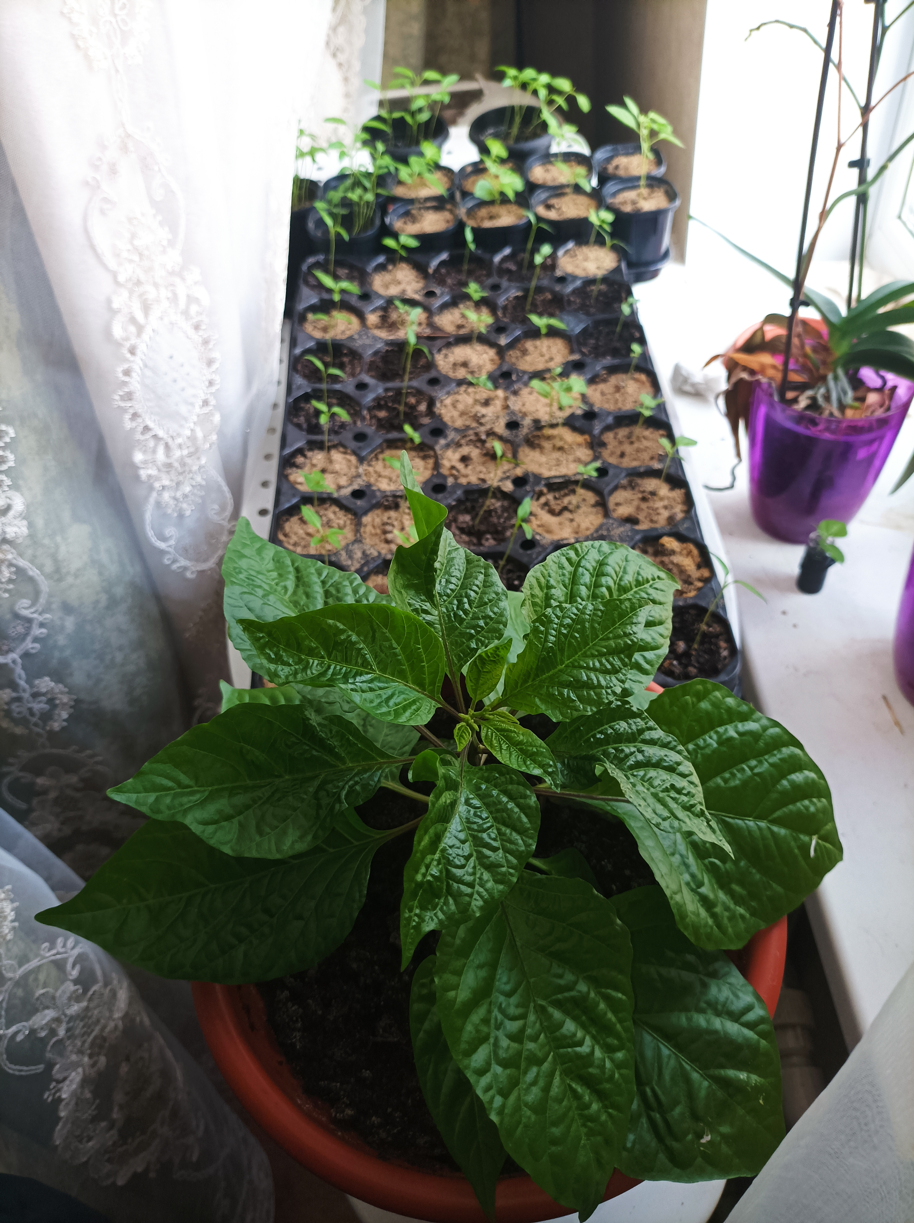 есть 4 пиздюка на 3-4 листа: 2 brown egg, 2 каких-то кайенских или что-то типа пири-пири, которые достал из перца который приехал мне с бургером из доставки и очень понравился по остроте еще 4 посадил недавно: хабанеро оранж из перца, хабанеро мастард из магазина и два болгарских для тянки, которая не любит острое. мастард взошел, скоро будет первый настоящий лист, остальные я походу перелил и семки сгнили, посадил новые пару дней назад