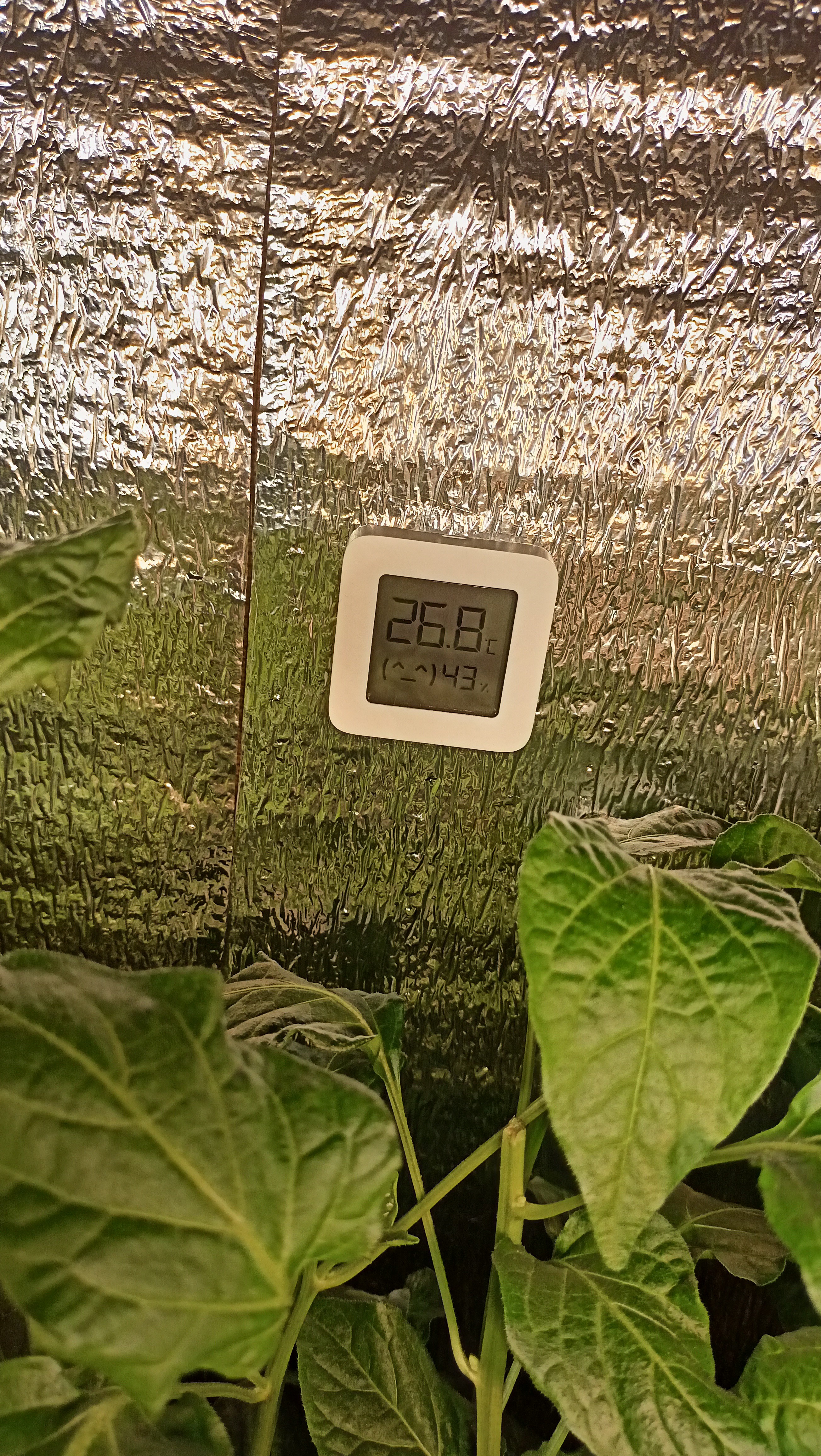 В качестве света использую 4 LED лампы 2700к 20W + 2 фито 10W (красный:синий 77%:23%). Опыление произвожу кистью, иногда включаю обдув комнатных вентилятором. Растут перцы на кухне, температура воздуха колеблется от 22 до 25 градусов, влажность около 30%.