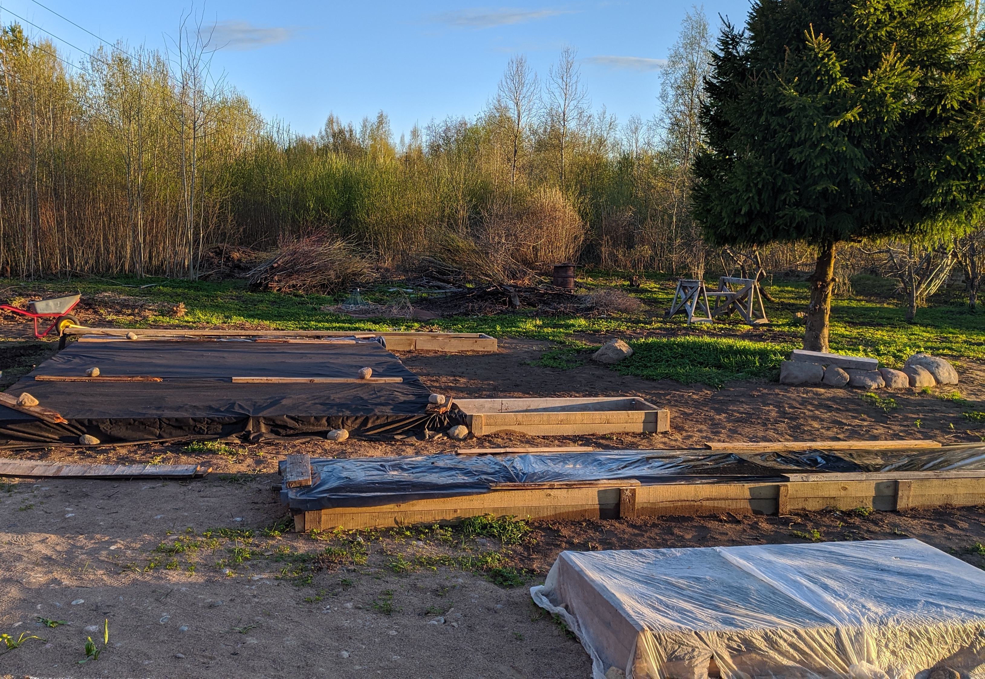 Привез камаз земли. Сделал себе поле в 25м2 под картоху, сделал одну шестиметровую грядку и три двухметровых, починил парник, потом еще отдельно под кабачки сделаю мини грядочки. Пролил всякими биопрепаратами и пока накрыл черным спанбондом. Жду погоду.