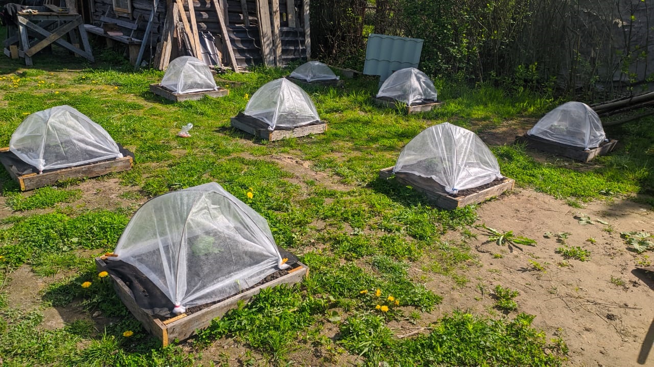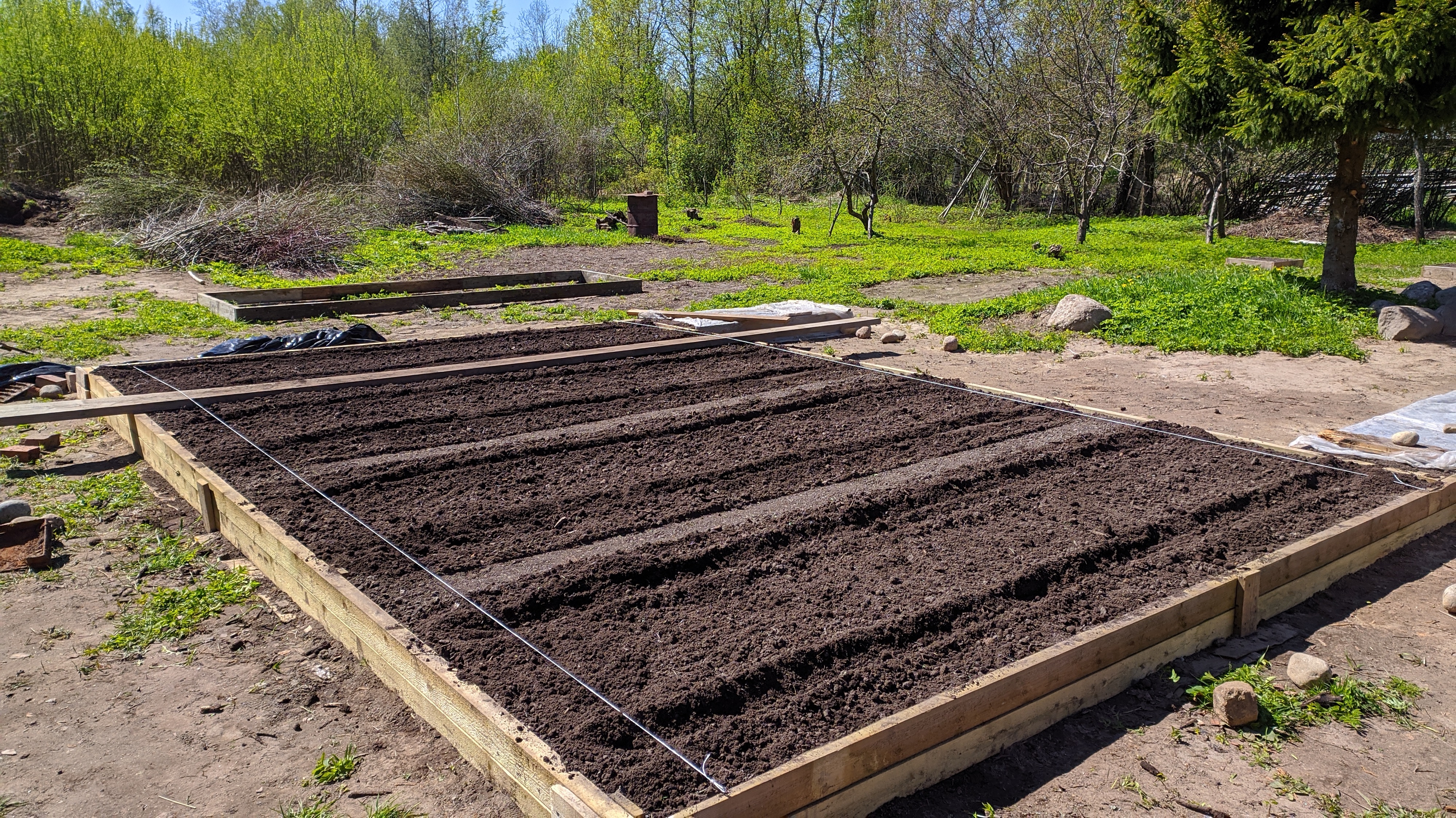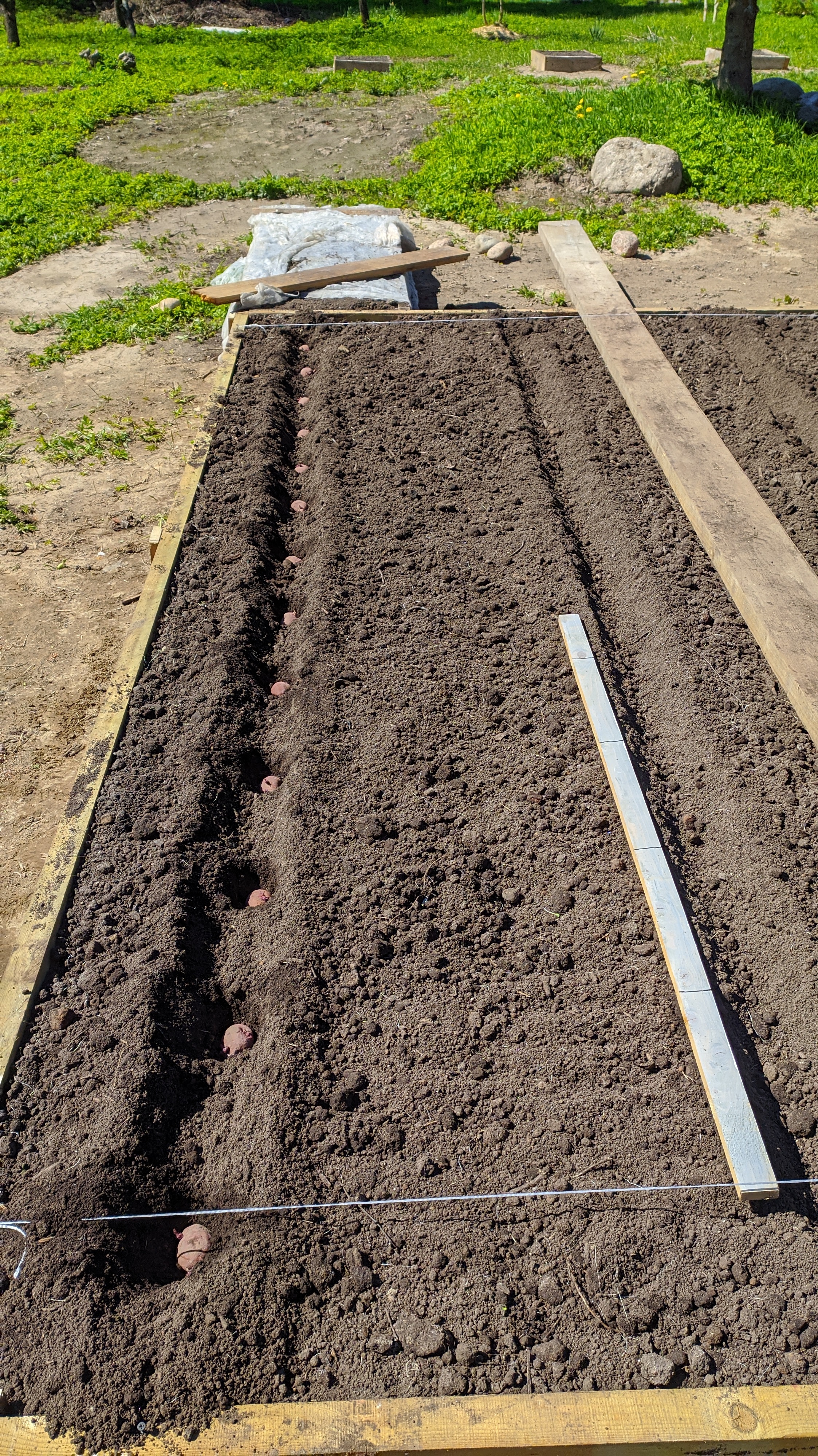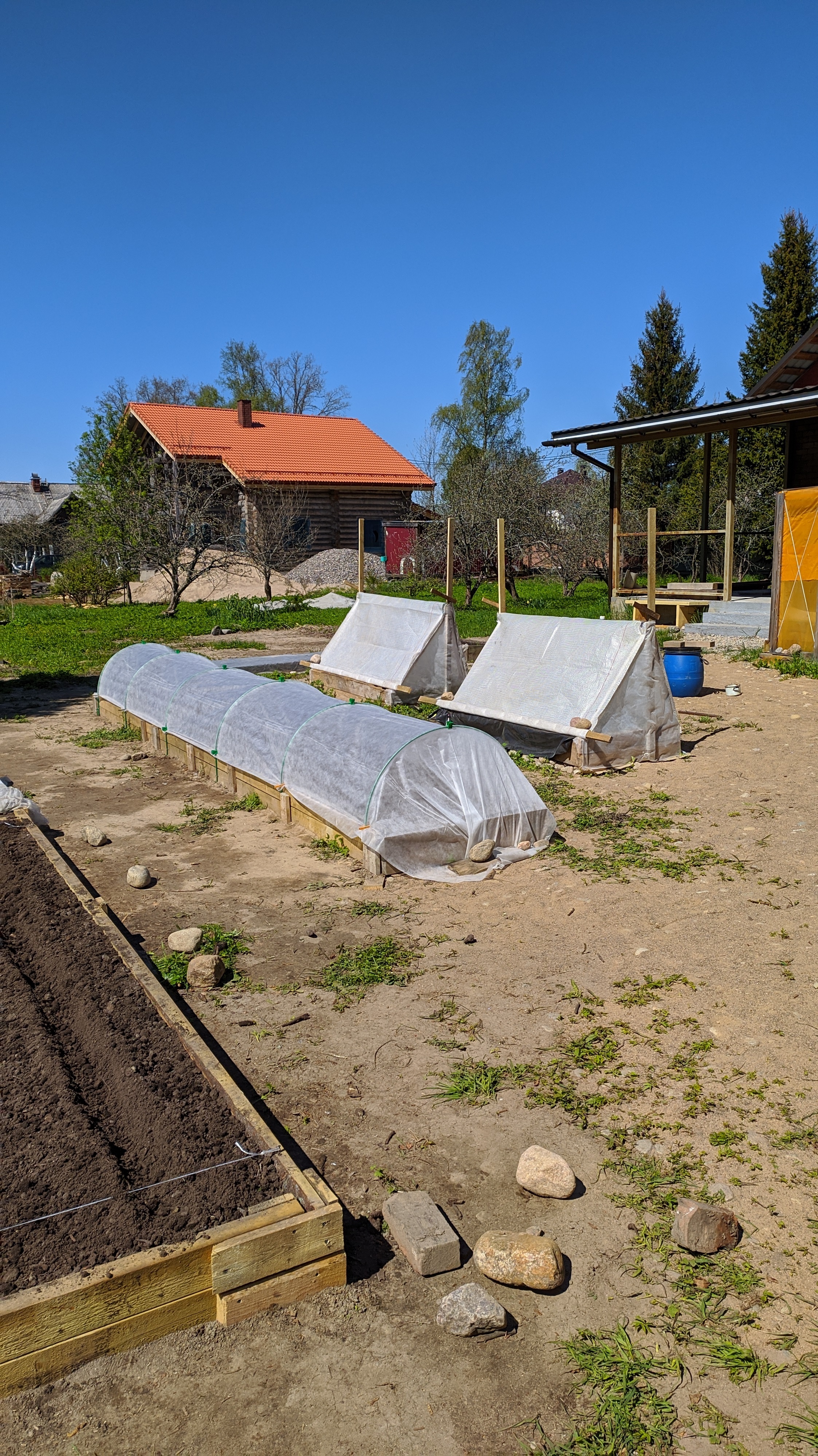 Ну я и насажался в эти выходные. В шестиметровую грядку высадил лук, морковь, свеклу и редиску. Я еще придумал крутую тему - взял старый ламинат, подрезал циркуляркой под размер грядки и разложил его между рядками овощей. Очень удобно- как мульчирование вышло, только если что можно за секунду убрать. Ну а потом как прорастут овощи и видно будет где что, можно будет уже по обычному сделать. А ну и укрыл все спанбондом. Был бы капельный полив, наверное вообще можно было бы до сбора урожая и забыть про огород. Так же смастерил парнички для огурцов и высадил туда рассаду. Через день уже заметил, как они усами начали к сетке хвататься. В старый парник высадил томаты, но уехал и не заснял. Я их еще по углом закопал с парой веток, чтобы корешков побольше отрастили. Вообще под конец дня уже было заметно как они начинают загибаться вверх, жаль не увижу сам процесс, к выходным уже должны ровно стоять и надо будет подвязывать. В междурядье базилик посадил. А вообще ночью было весьма холодно, до двух градусов опускалась температура. Так как парник временный, хуевый, то пришлось обогреватель ставить. А чтобы не бегать, то воткнул его через розетку с датчиком температуры. По мелочи еще насажал горох, еще свеклы, еще морковки, петрушки, укропа там и тут. На картофельной мегагрядке вкрутил саморезы, натянул веревку и по ней разметил рядки. Потом поперек натянул веревки для отступов с края и с помощью палки, на которой отметил равные промежутки, рассадил картофан. Картошка еще прикольная, я ее за пару недель занес в тепло и накрыл - а сейчас когда сажал, то на каждой картофелине было просто куча мелких ростков. Мелкие такие белые пипки с фиолетовыми пупырками. Забавно выглядело. На самом деле голова кругом идет, столько еще инфы нужно найти - сколько и когда поливать, когда подкармливать, когда и чем обрабатывать и тд. Ну и потом еще кабачки нужно будет высадить, арбузы и тыкву.
