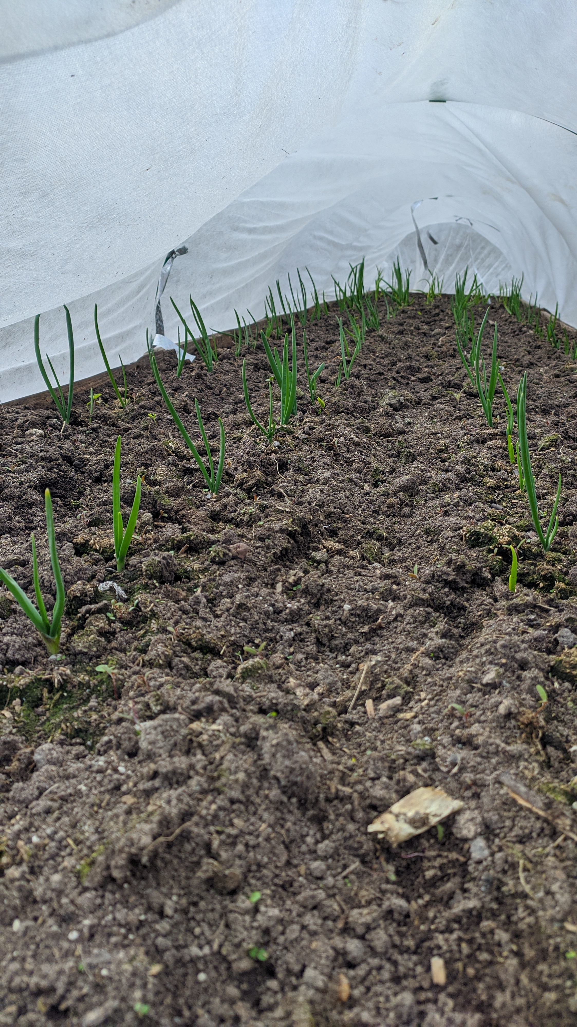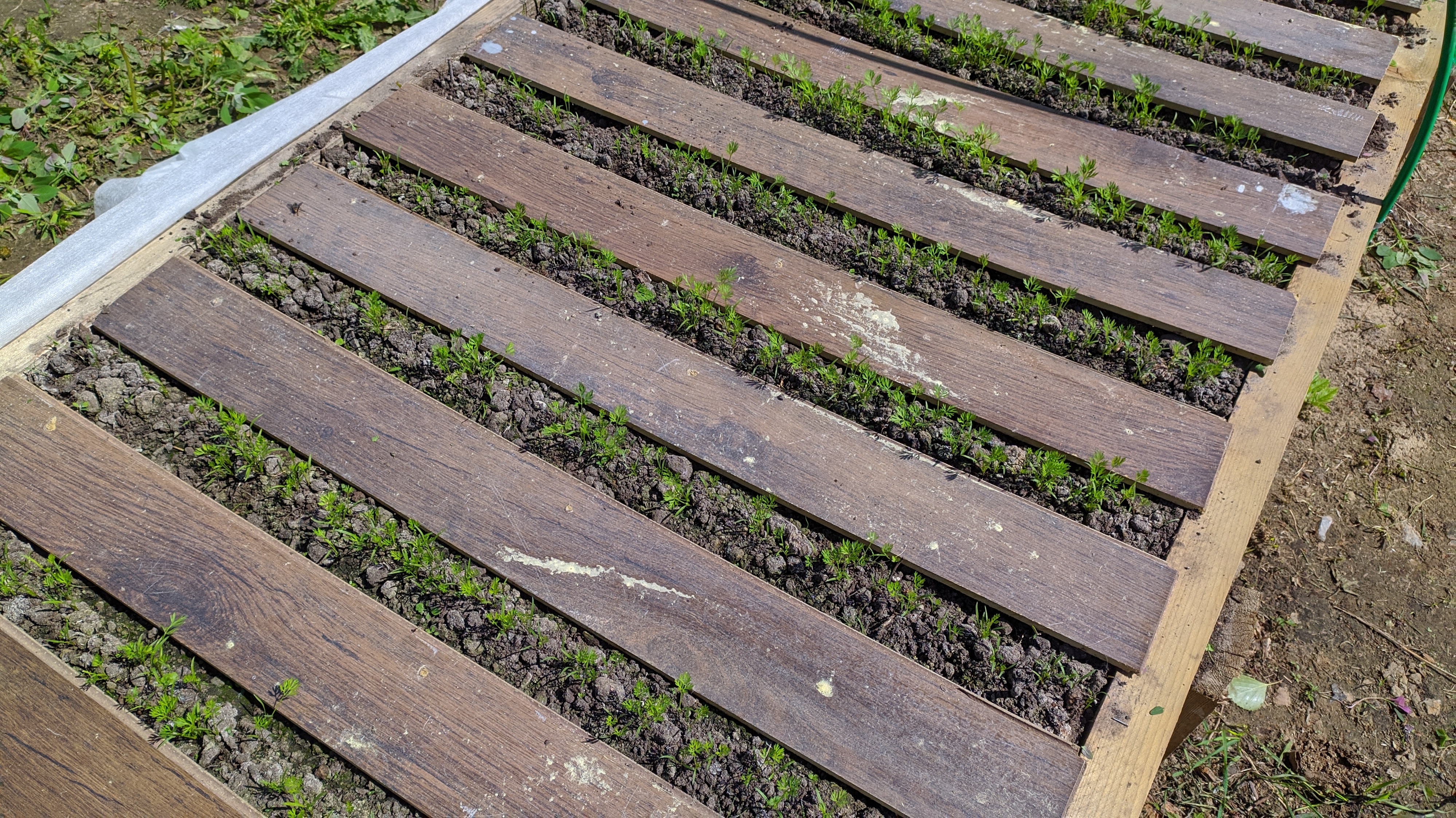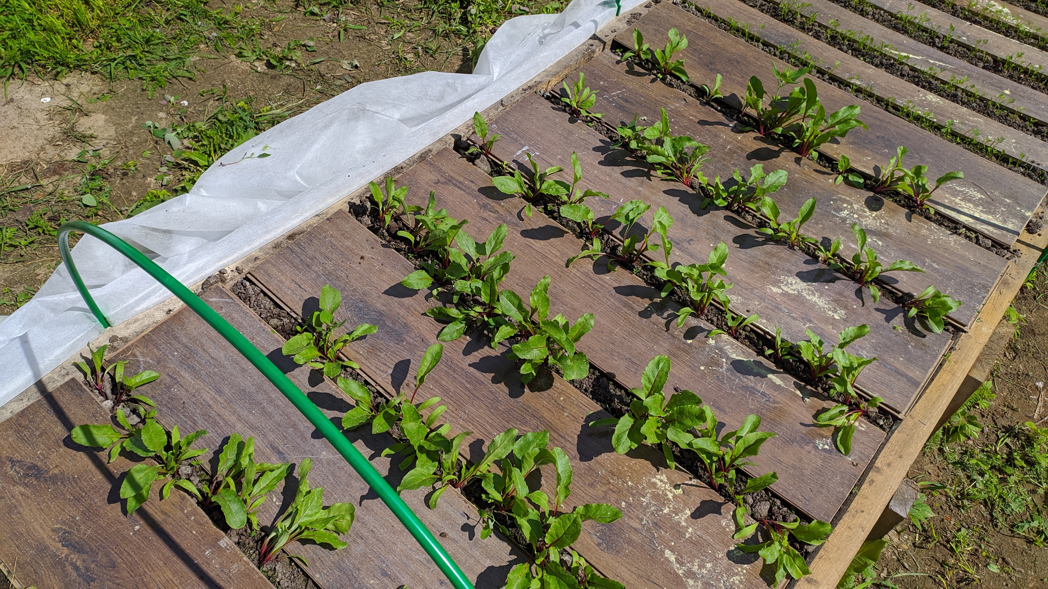 Постепенно все растет и где-то радует, а где-то не очень. Например, я все волновался почему севок не всходит. Вскопал, а он сгнил оказывается. Вот и хз, то ли говно продали, то ли я напортачил. Хотя я его не заливал до такой степени, рядом остальные овощи норм растут. Вот картошечка зато четко взошла дружными веселыми кустиками. И картошки у меня оказалось с запасом, потому что вся была хорошая и вся проросла. Так вот, отец сделал еще грядочку на два ряда, а потом и просто землю перекопал рядом и там еще 4 ряда сделал. А вот у капусты всхожесть оказалась 60% всего. Сеял семенами в грунт. В следующий раз буду рассадой сеять. Но ничего, в свободные места лук натыкаю, наверное. Морковочка еще вот ровненько взошла. Я семена засыпал в пустую солонку и получилось через мелкие дырочки четко дозировать посадку, без всякой возни. Даже прореживать судя по всему не надо будет. Там же рядом свекла. Оказалось, что это не одно семечко свеклы, а у нее так несколько слипаются в одно целое. Так что вроде сажал по "одному", а повылезало по несколько в одном месте. Но ее уже потом проредил, а лишнее отсадил на другие грядки в пустые места. Редиска кое-где норм выросла после того как ее чуть мошки не сожрали. Но я успел рассыпать смесь табачной пыли и золы, и мошек вообще не стало. Хотя некоторые выглядят супер чмошно, но вроде растут. Вот эта идея с досочками между рядами - зашибись. Сорняков минимум, я за пару минут все оборвал на 6 метровой грядке. Под досками их не было. Плюс земля не сохнет. Как все подрастет повыше, станет более крепким и уверенным, то можно будет убрать доски и замульчировать совсем плотно.