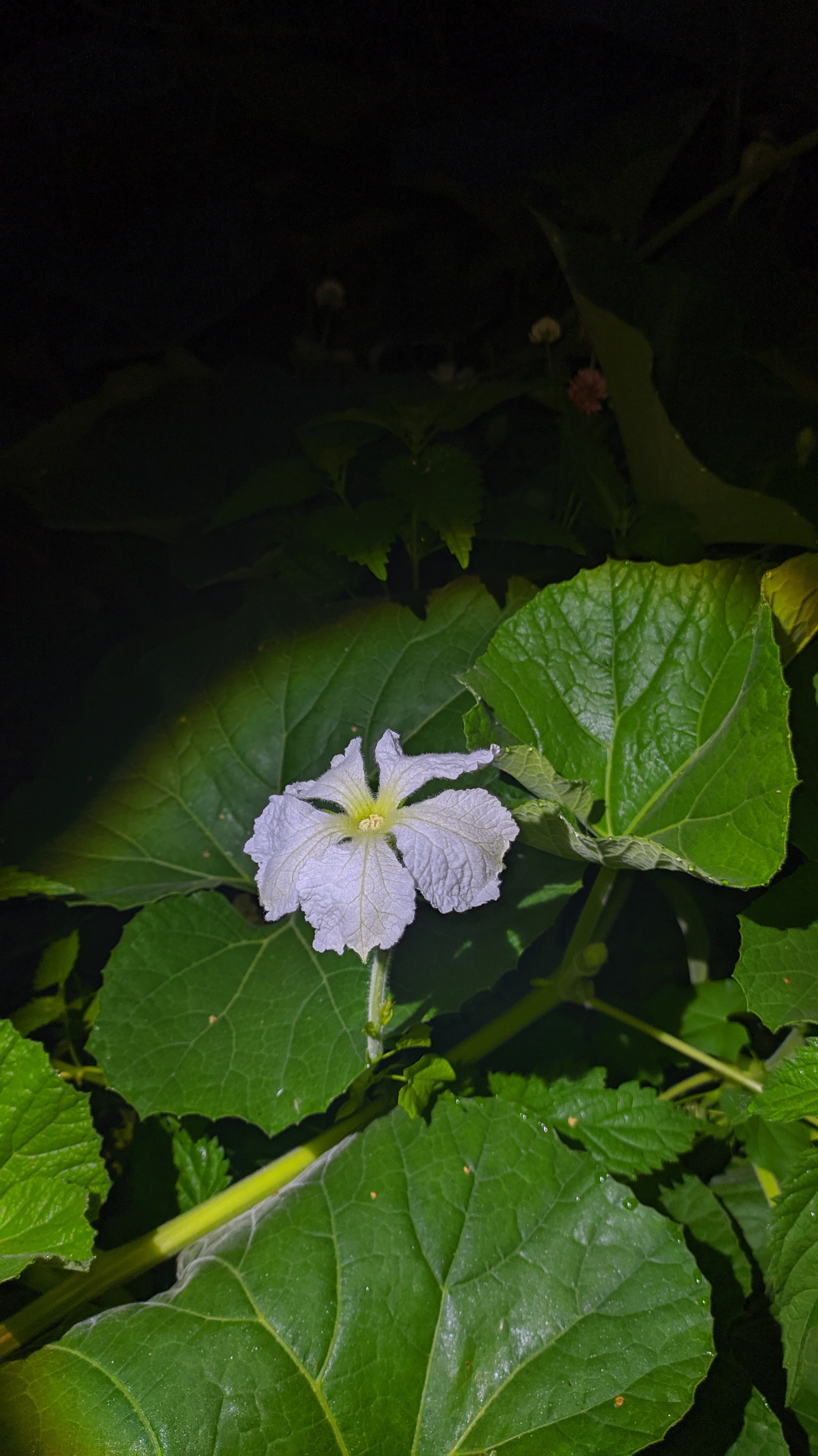 Еще вот лагенария растет. Я ее забросил слегка, думал сама разберется. Но до сих пор то ли бутылочки медленно развиваются, то ли они так и не опылились. В итоге прищипнул и пошел сам опылять. А проблема у нее в том, что цветы раскрываются только вечером, когда все насекомые не летают уже.
