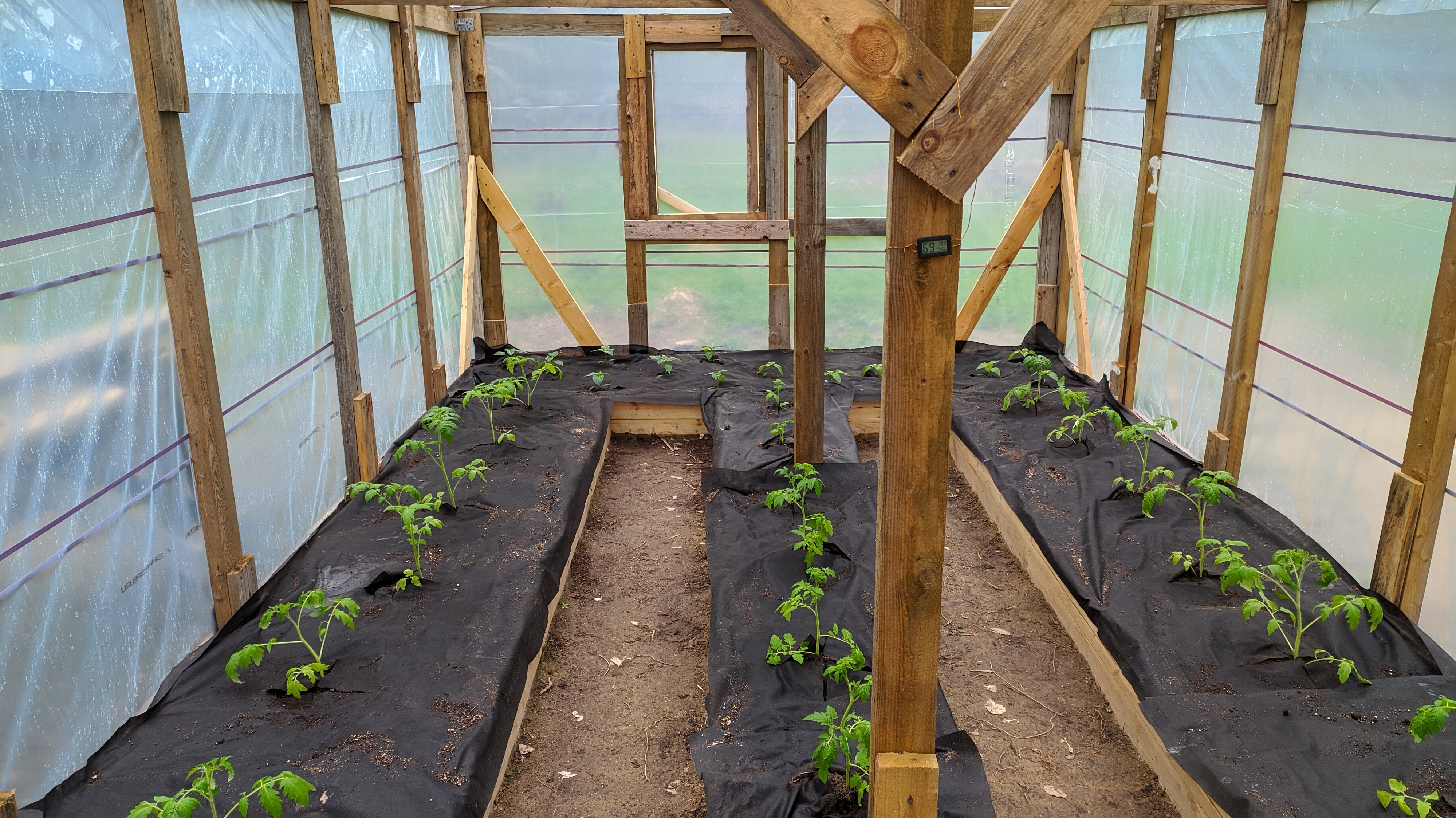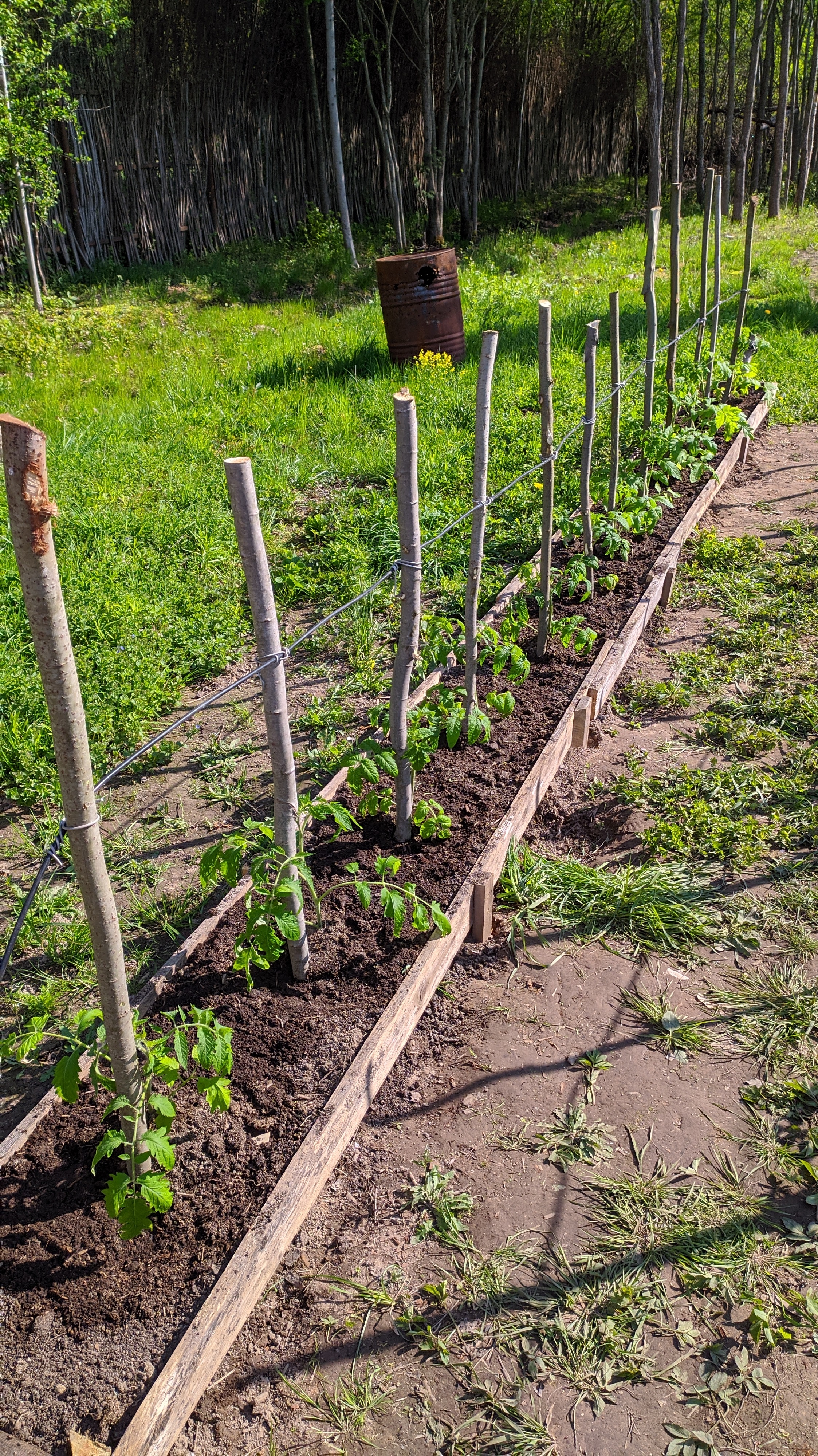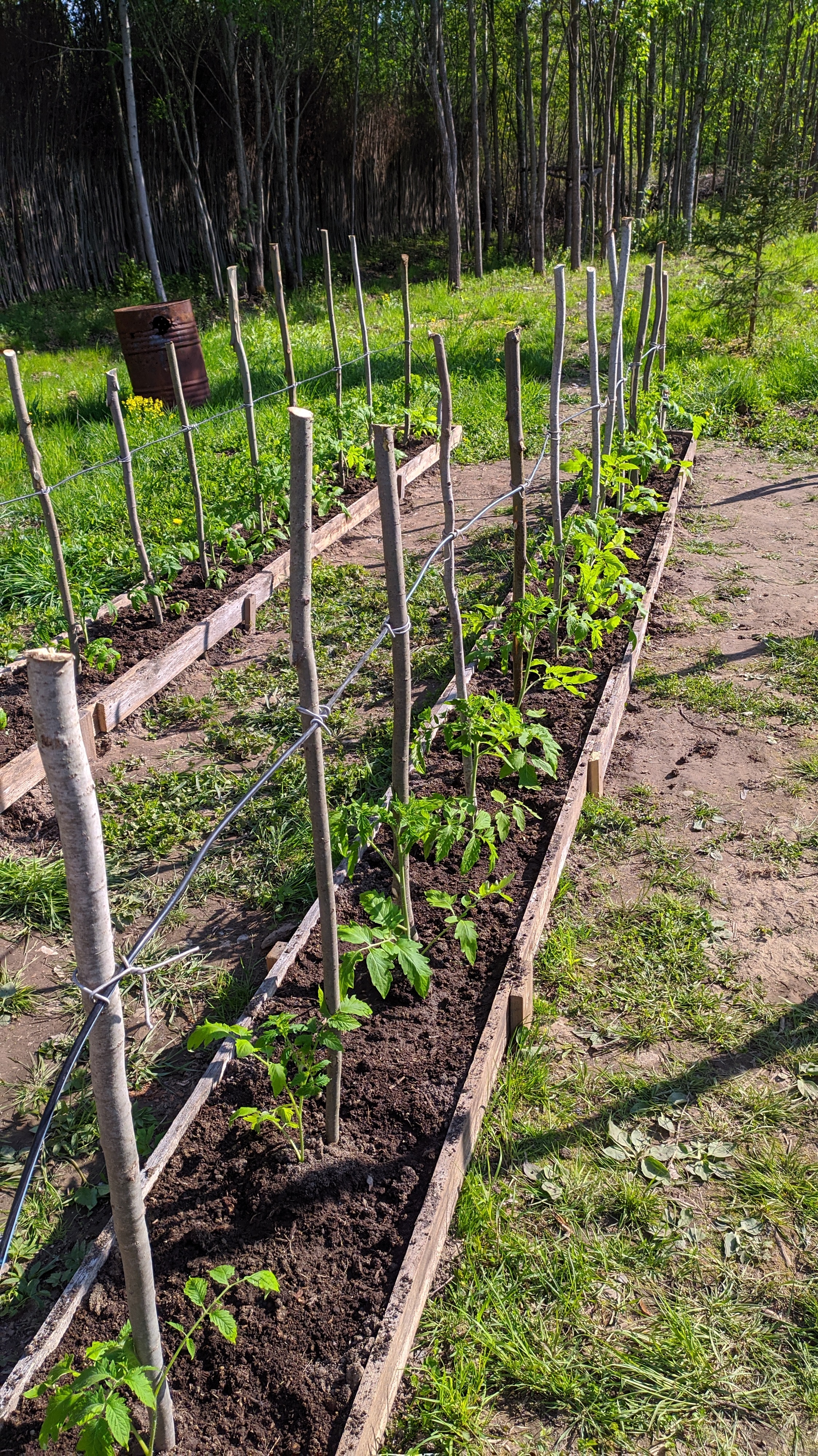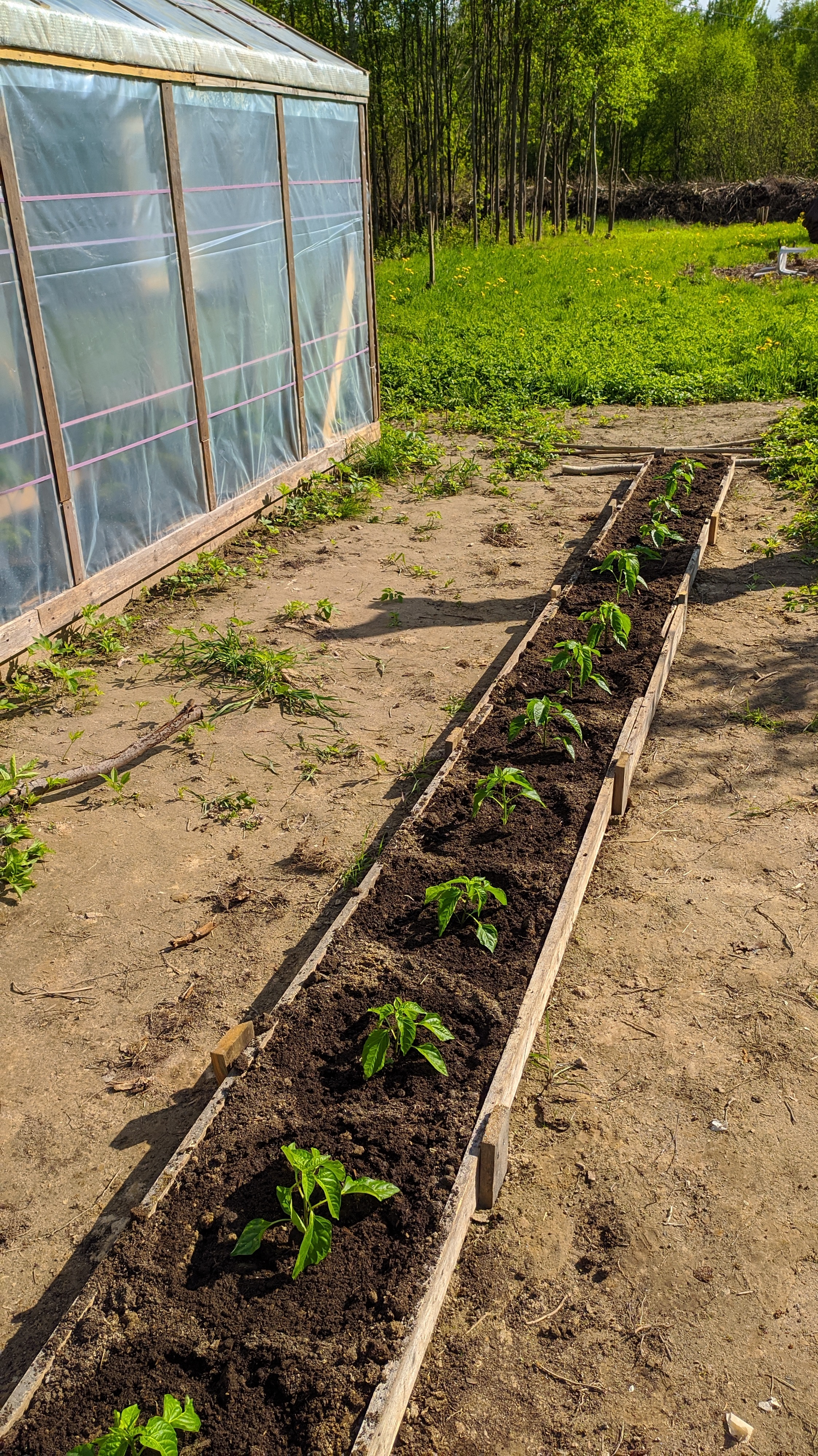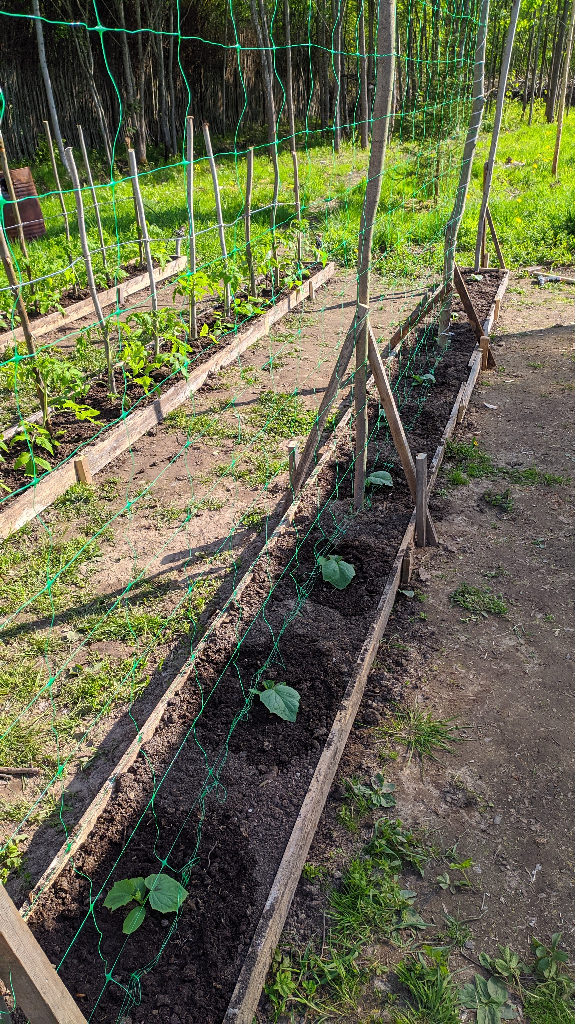 Сделал в добавок к парникам еще немного грядок рядом. Две с томатами (24 шт), одну с огурцами (10 шт) и одну с перцами (15шт). У нас там бывают ветра сильные, так что воткнул ебовые палки, чтобы ничего не унесло. Слегка опасаюсь всяких возвратных заморозков, хз как это все укрывать. Еще 4 кабачка высадил и 8 тыкв. Всю остальную рассаду раздал, хотя выглядела она так четко, что можно было у местного ларька смело продавать. Поливать это дело, это конечно просто отвал башки, даже со шланга. В следующем сезоне нужно будет емкости и капельный полив организовывать, чтобы кран открыл и ушел. А так остается только картоху и кукурузу посадить и можно будет отдыхать, время от времени пасынкуя томаты. Ну морковку и свеклу проредить разово.